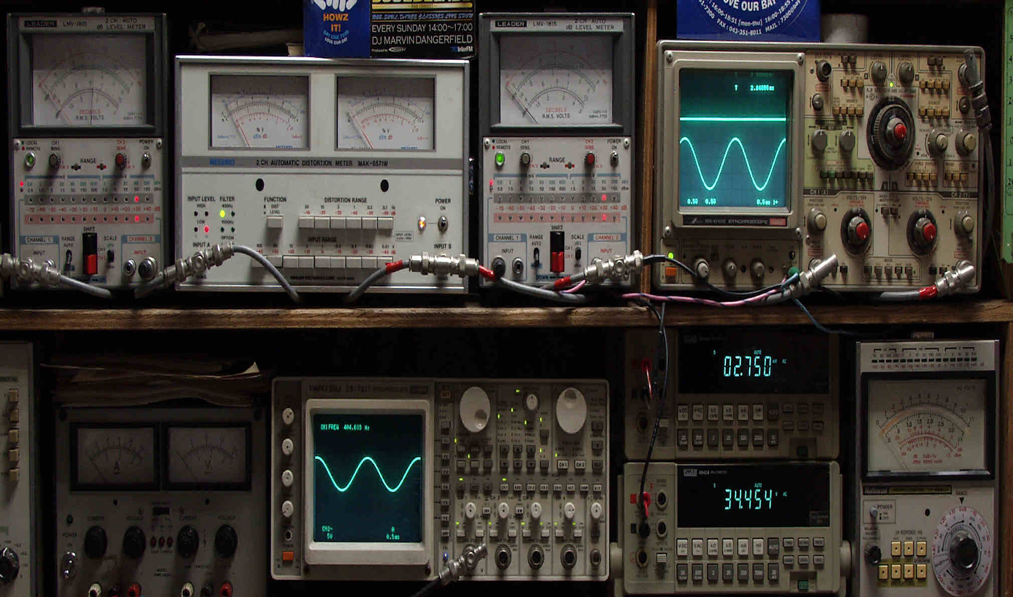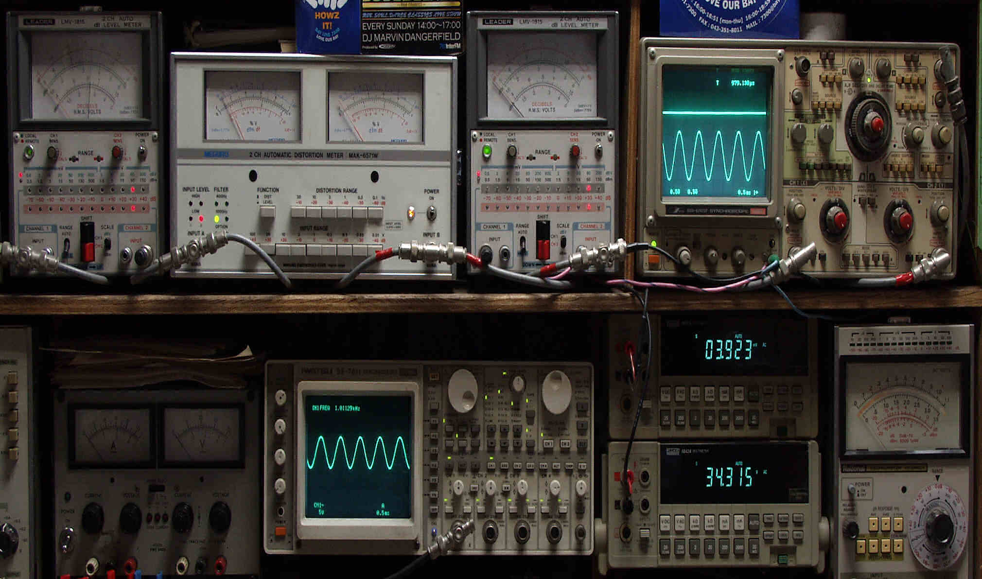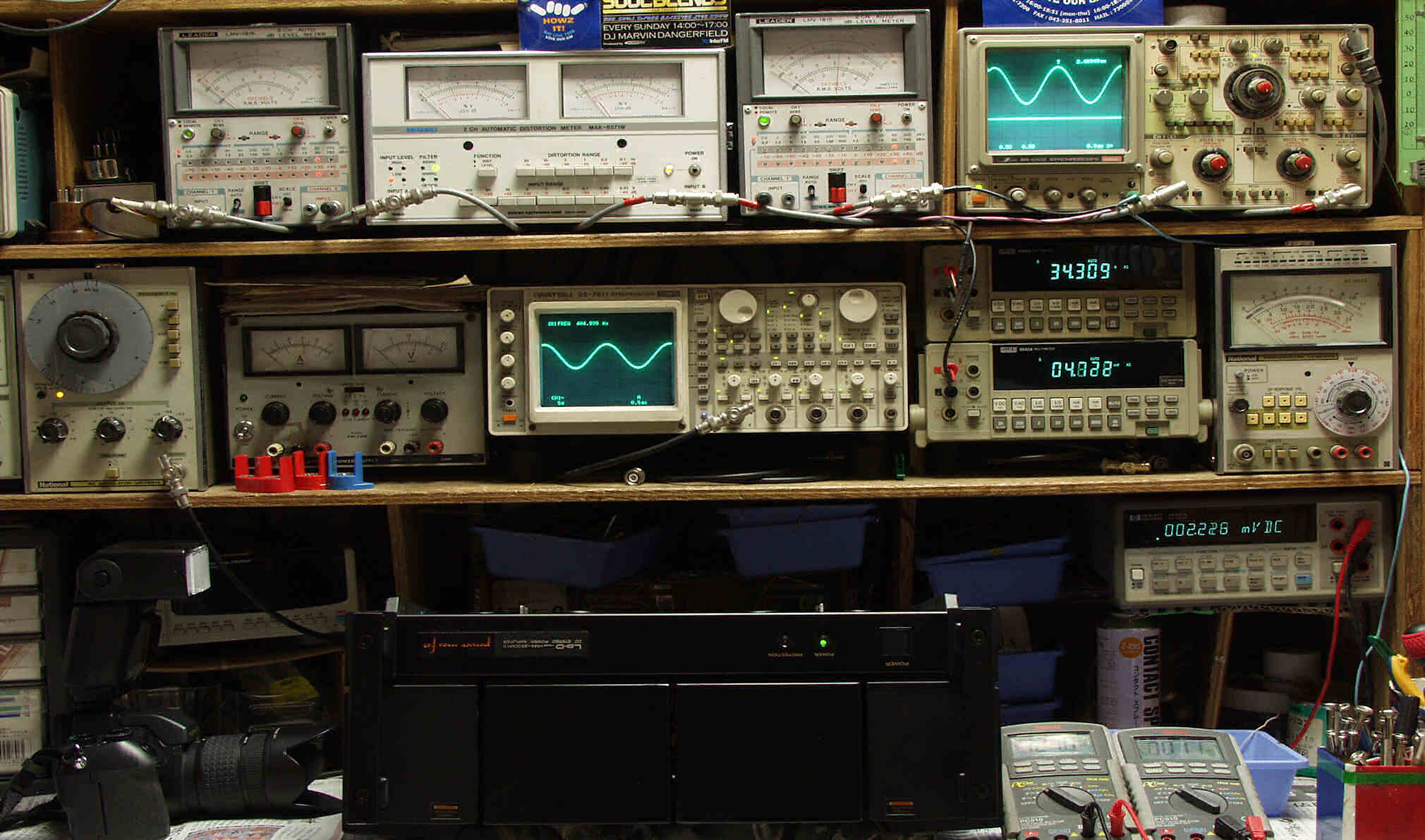 | E. 調整・測定 E1. 出力・歪み率測定・調整 <見方> 下段左端 オーディオ発振器より400HZ・1KHZの信号を出し(歪み率=約0.003%)これをAMPに入力し、出力を測定 下段中左 オシロ=入力波形(オーディオ発振器のTTLレベル) 下段中右上=周波数計 上段左端 電圧計=L側出力電圧測定、黒針のみ使用 上段中左 歪み率計=出力の歪み率測定 左メータ=L出力、右メータ=R出力 上段中右 電圧計=R側出力電圧測定、赤針のみ使用 上段右端 オシロ=出力波形 上=R出力、下=L出力(実際にはRL電圧計の出力「Max1V」を観測) 下段中右上 デジタル電圧計=R出力電圧測定 下段中右下 デジタル電圧計=L出力電圧測定 |