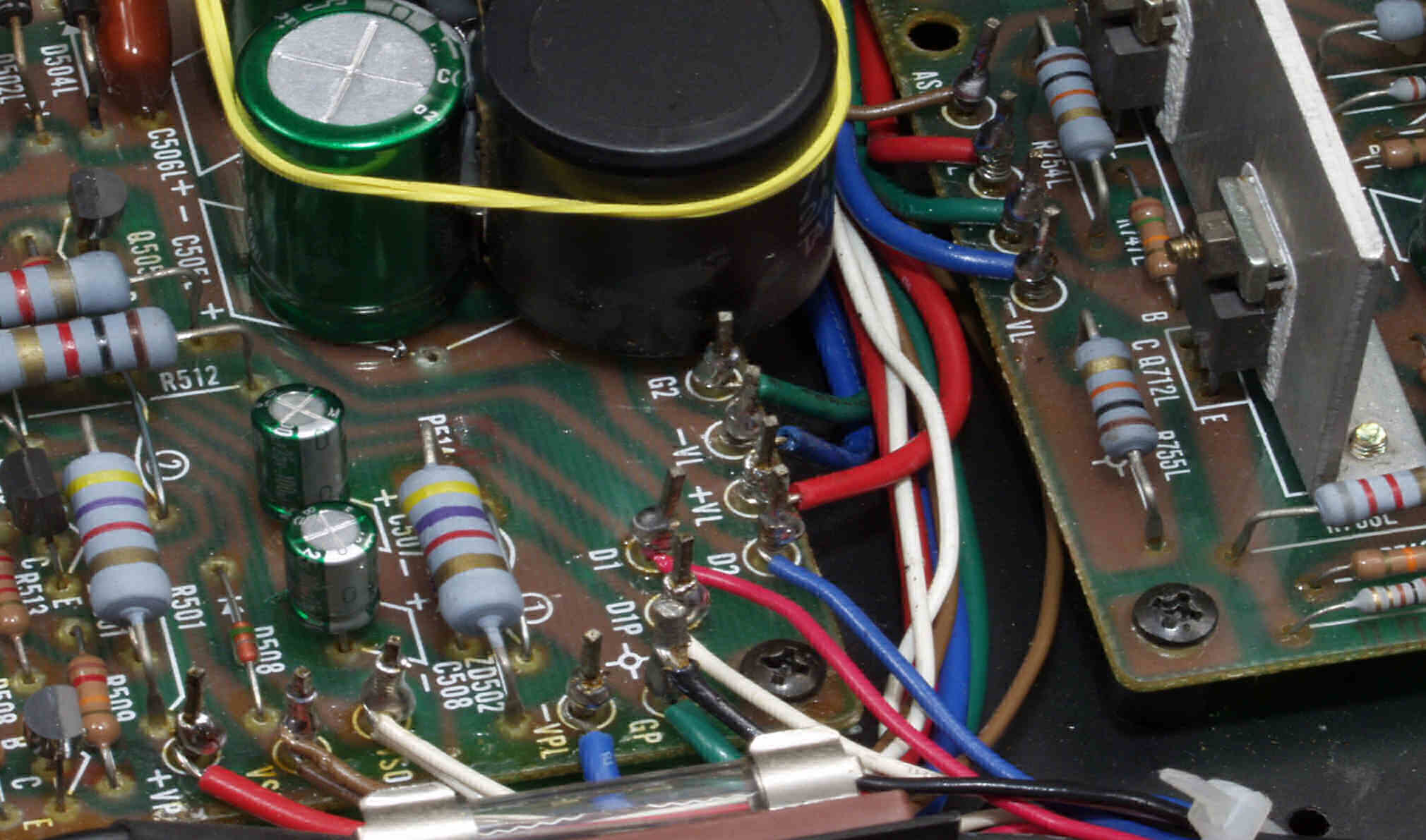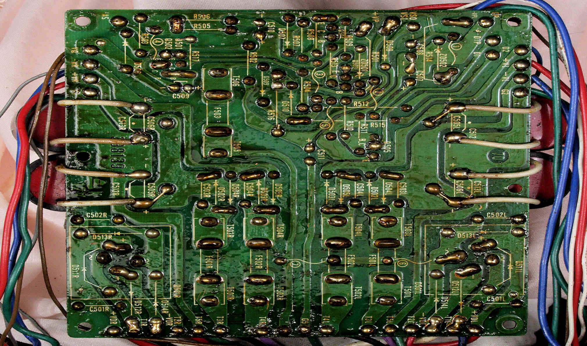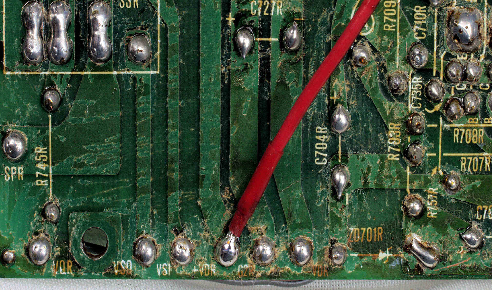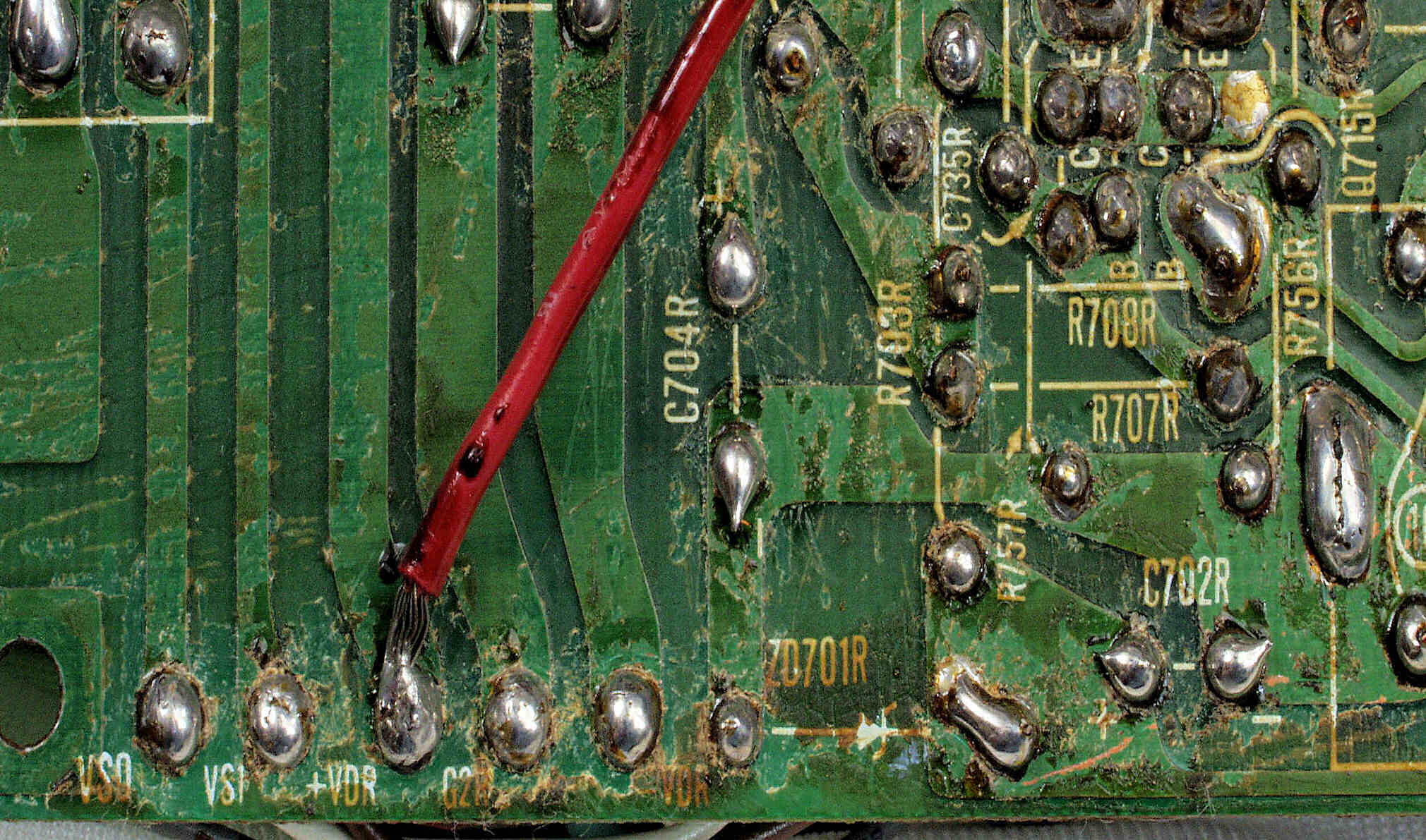 | C7C. 修理後 R側ドライブ基板−電源基板へのラッピング線に半田を浸み込ませる |