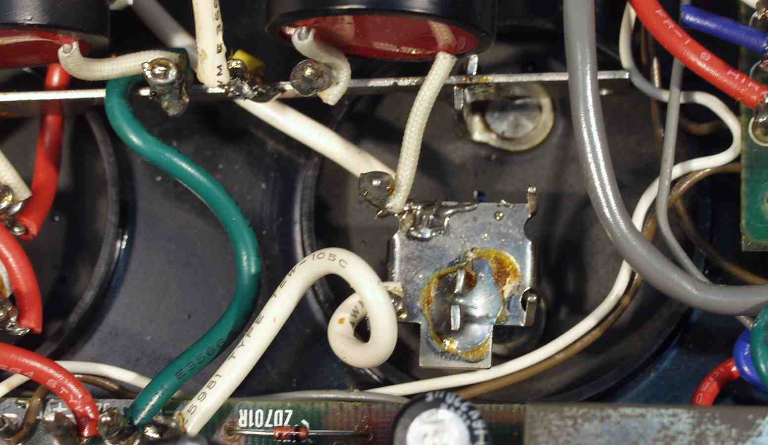 | A3. 点検中 電源トランスの100Vの1次巻き線の前に入るフューズ 上が断線したトランスに入っていた物、焼けた後が有る |