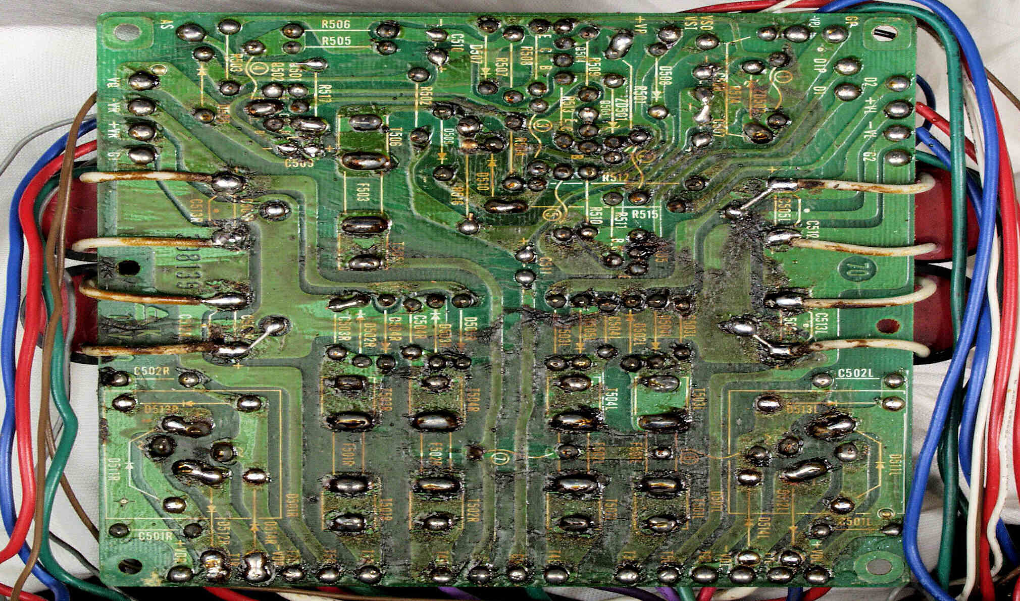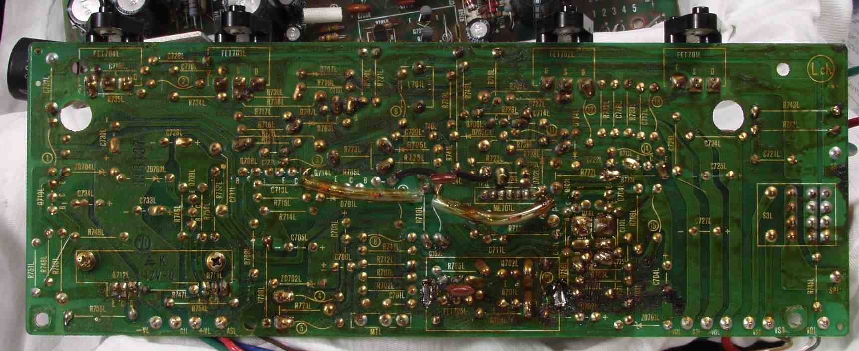| C2C. 修理前 Lドライブ基板裏 熱の為焼けた基板 C−1C.と比較すると良く解る |