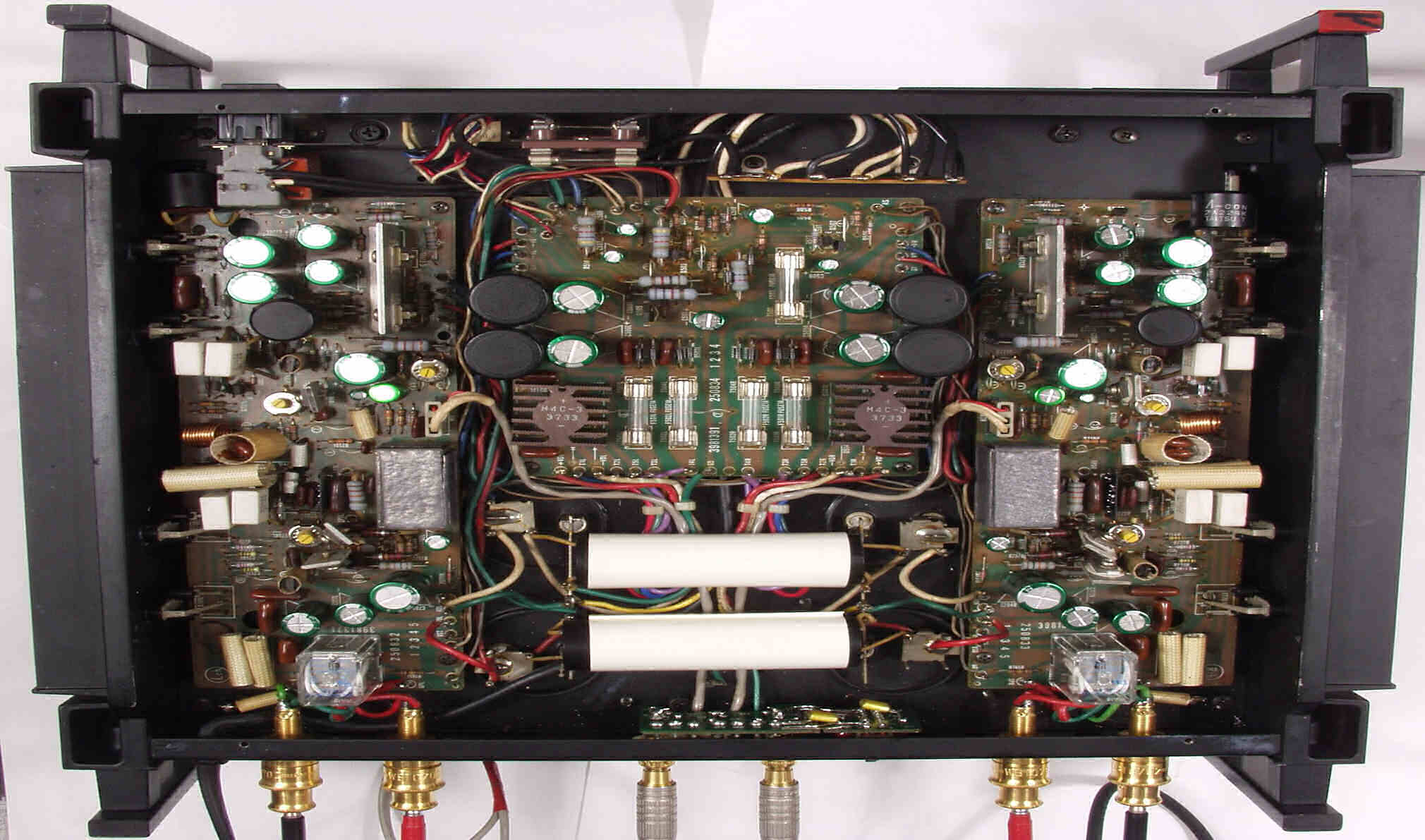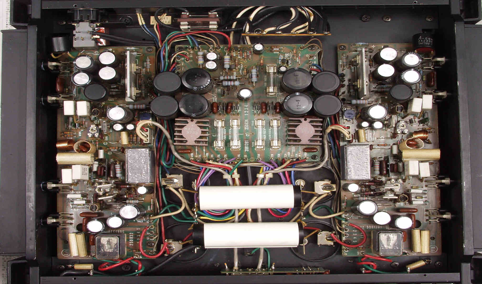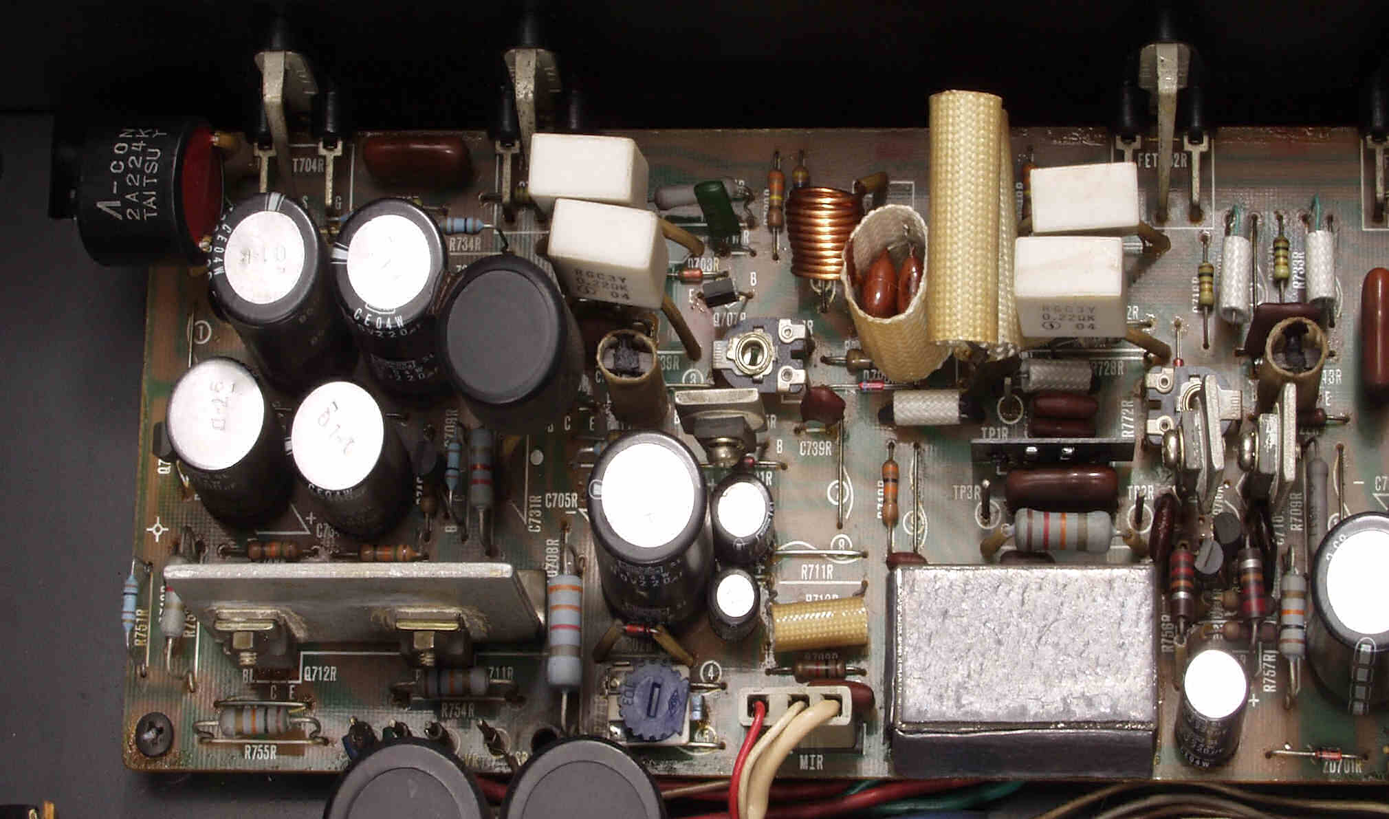 A2. 点検中 電解コンデンサーの頭のビニールが剥けている、初段FETAMPのシールドケースに鉛が貼ってある