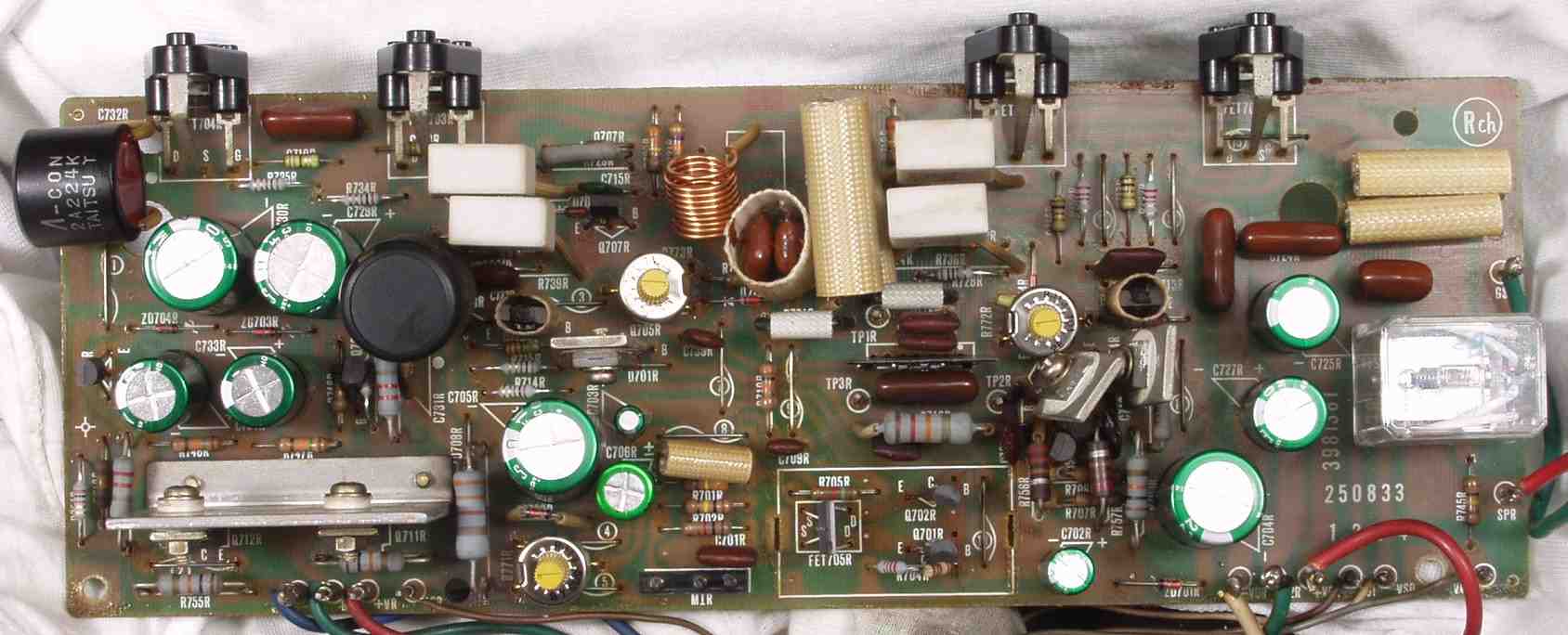 C1B. 修理後 Rドライブ基板 初段FET、バランス/バイアス調整用半固定VR3個、SP接続リレー交換