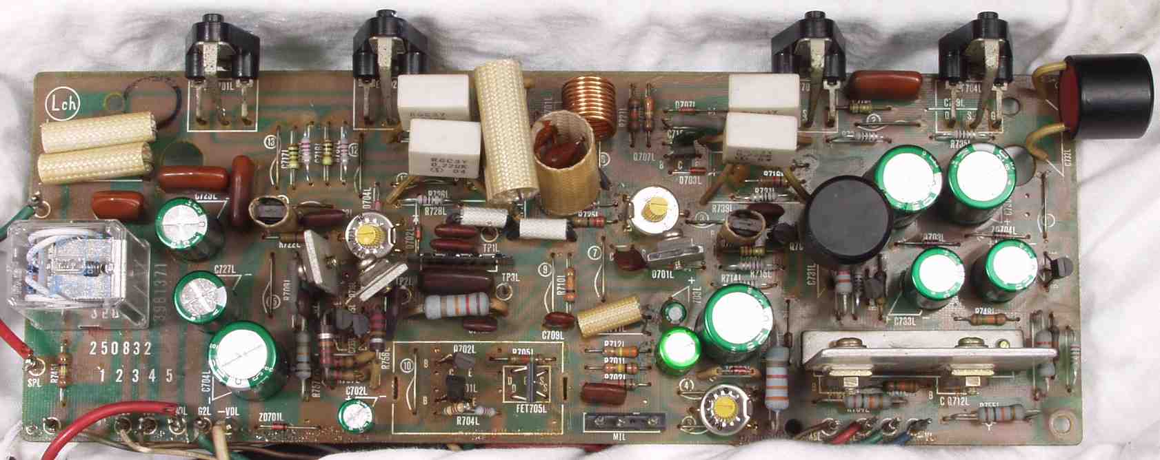 C2B. 修理後 Lドライブ基板 初段FET、バランス/バイアス調整用半固定VR3個、SP接続リレー交換