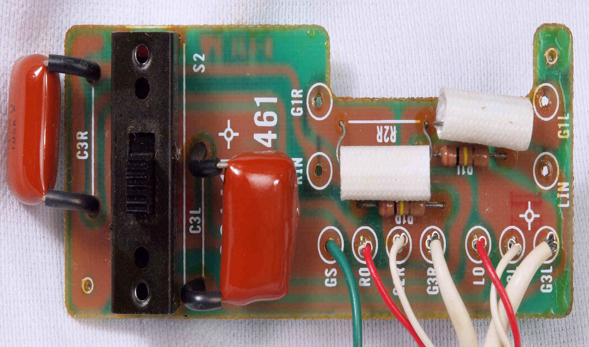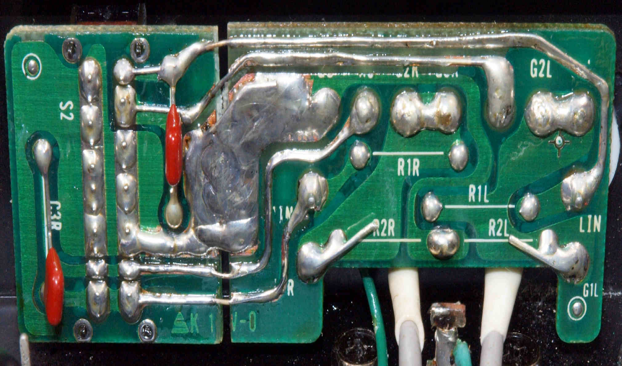 | C67. 修理(半田補正)後 RCA端子基板裏 半田を全部やり直す フイルムコンデンサー2個増設 |