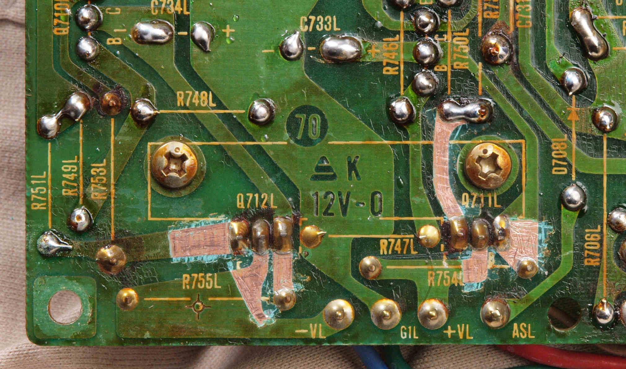 | C14. 修理中 R側ドライブ基板裏 定電圧TR(トランジスター)の足の銅箔を広げる。 |
