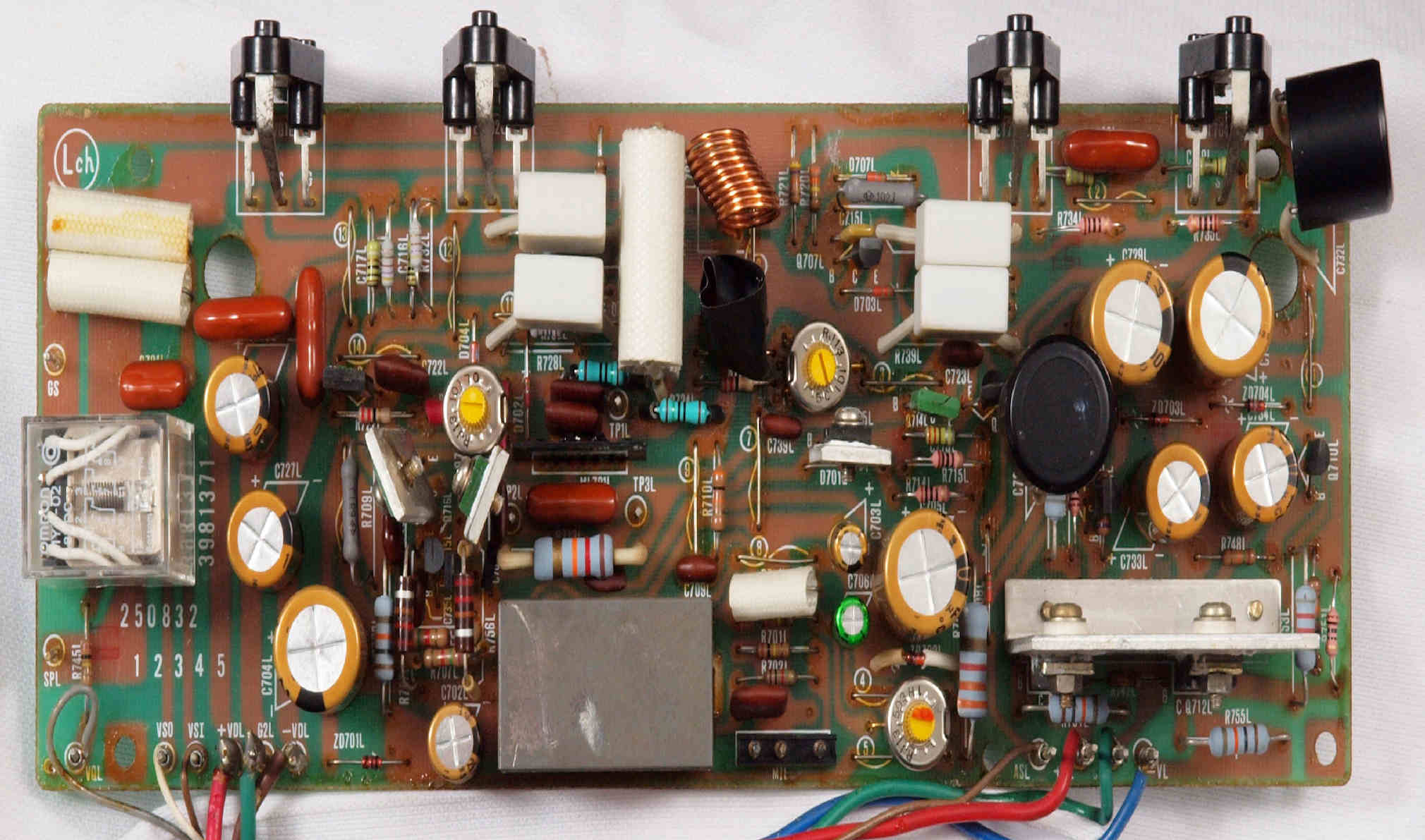 | C22. 修理後 L側ドライブ基板 初段FET、バランス/バイアス調整用半固定VR3個、SP接続リレー交換 ヒューズ入り抵抗全部、電解コンデンサー11個交換 |