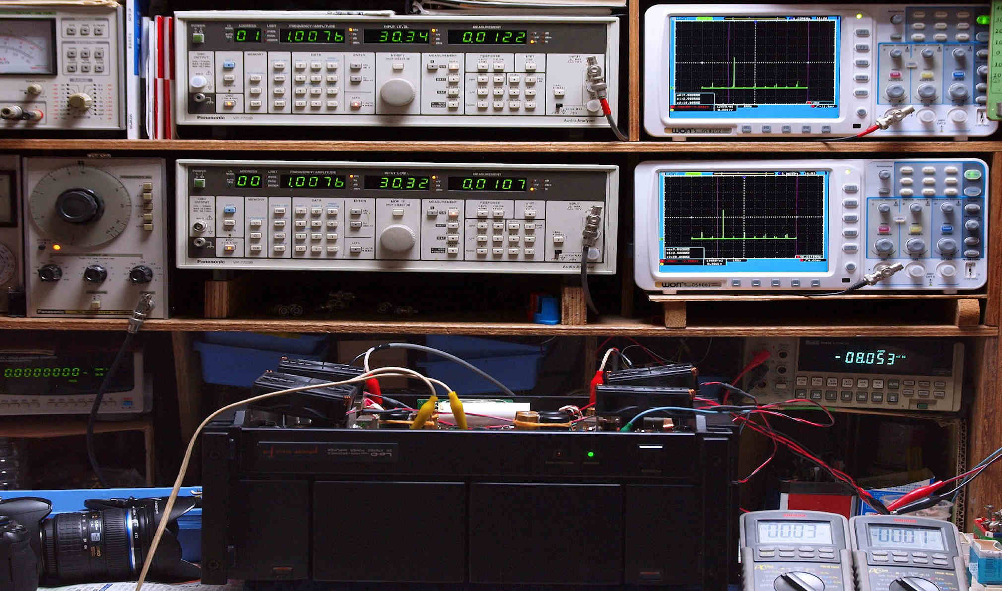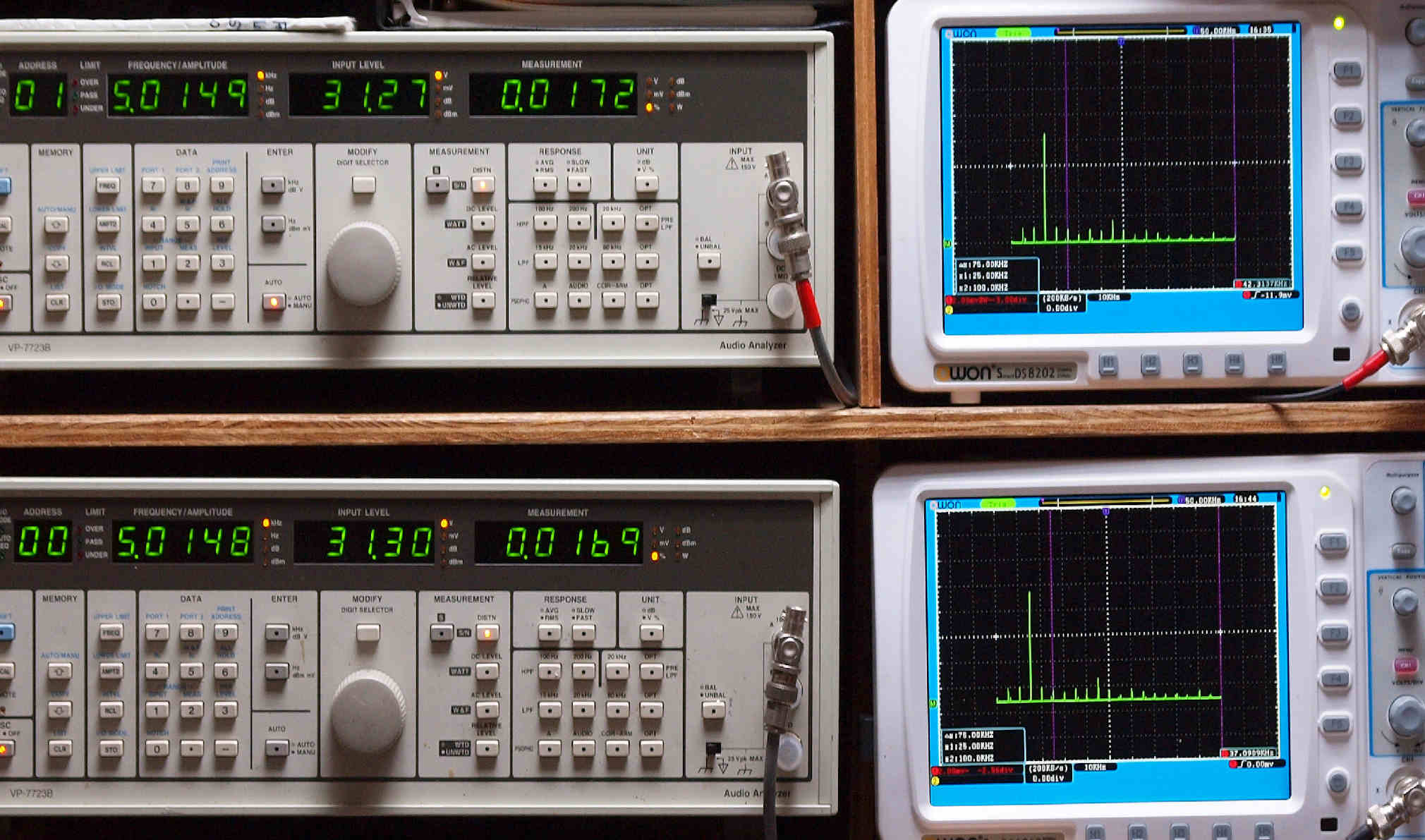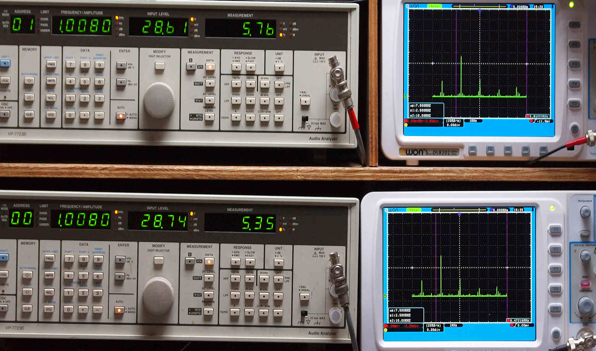 | T. バラック修理後の測定 T1. バラック修理後の出力・歪み率測定 「見方」。 上段中 右側SP出力を「Audio Analyzer Panasonic VP−7723B」により測定。 表示LED、 左端=メモリーNo、 中左=周波数測定、 中右=出力電圧測定、 右端=歪み率測定。 上段右端 VP−7723Bの基本波除去出力を「owon SDS8202(200MHZ)」で「FFT分析」表示。 下段中 左側SP出力を「Audio Analyzer Panasonic VP−7723B」により測定。 表示LED、 左端=メモリーNo、 中左=周波数測定、 中右=出力電圧測定、 右端=歪み率測定。 下段右端 VP−7723Bの基本波除去出力を「owon SDS6062(200MHZ)」で「FFT分析」表示。 下段左端 オーディオ発振器 VP−7201A より50Hz〜100kHzの信号を出し(歪み率=約0.003%)、ATT+分配器を通し、AMPに入力。 よって、ダイアル設定出力レベルより低くなります。測定機器の仕様や整備の様子はこちら、「VP−7723B」「VP−7201A」。 FFT画面の見方はこちら。 |