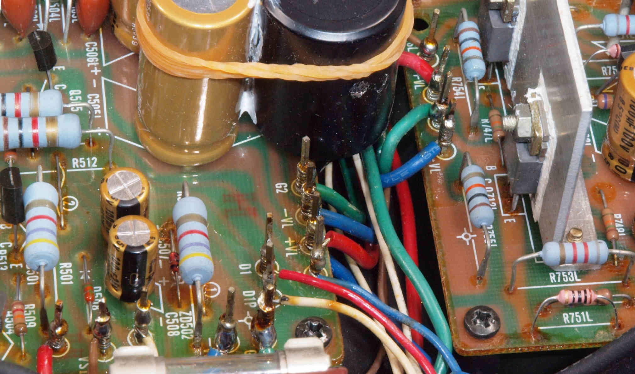 | C54. 修理後 電源基板 ヒューズ入り抵抗全部、電解コンデンサー9個交換。 輪ゴムは接着材が硬化するまで固定する。 |