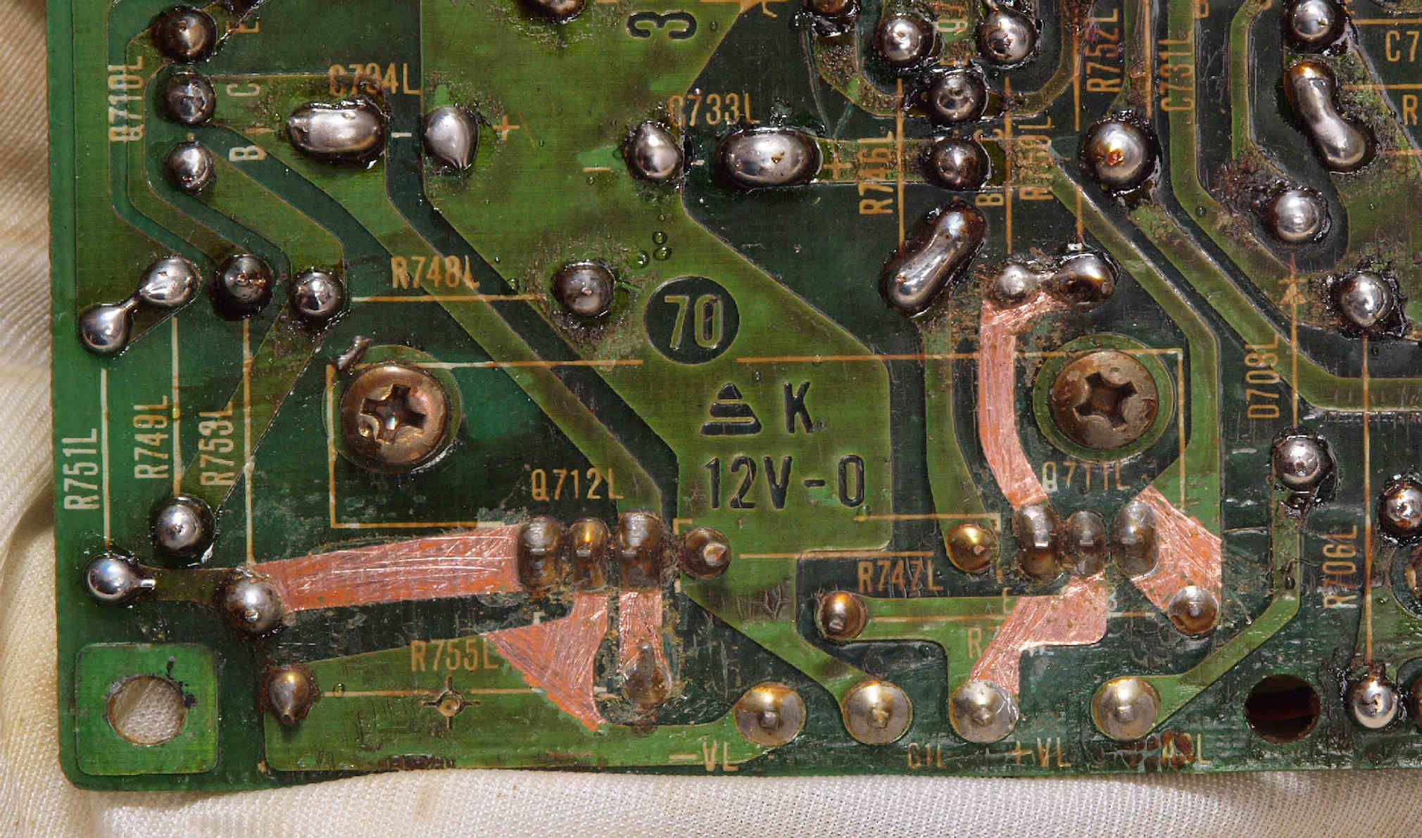 | C24. 修理中 L側ドライブ基板裏 定電圧TR(トランジスター)の足の銅箔を広げる。 |