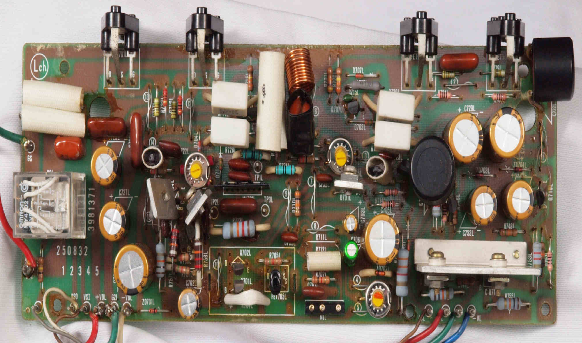 | C22. 修理後 L側ドライブ基板 初段FET、バランス/バイアス調整用半固定VR3個、SP接続リレー交換 ヒューズ入り抵抗全部、電解コンデンサー11個交換 |