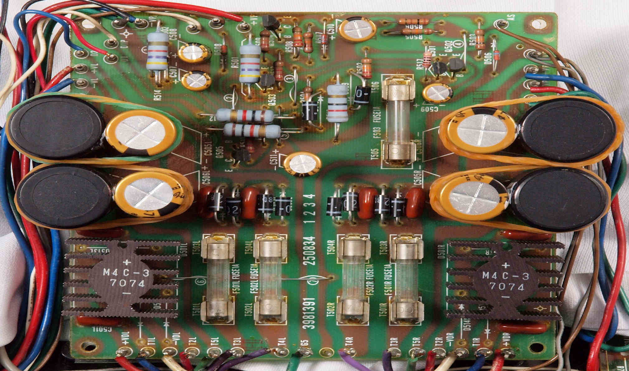 | C54. 修理後 電源基板 ヒューズ入り抵抗全部、電解コンデンサー9個交換。 輪ゴムは接着材が硬化するまで固定する。 |