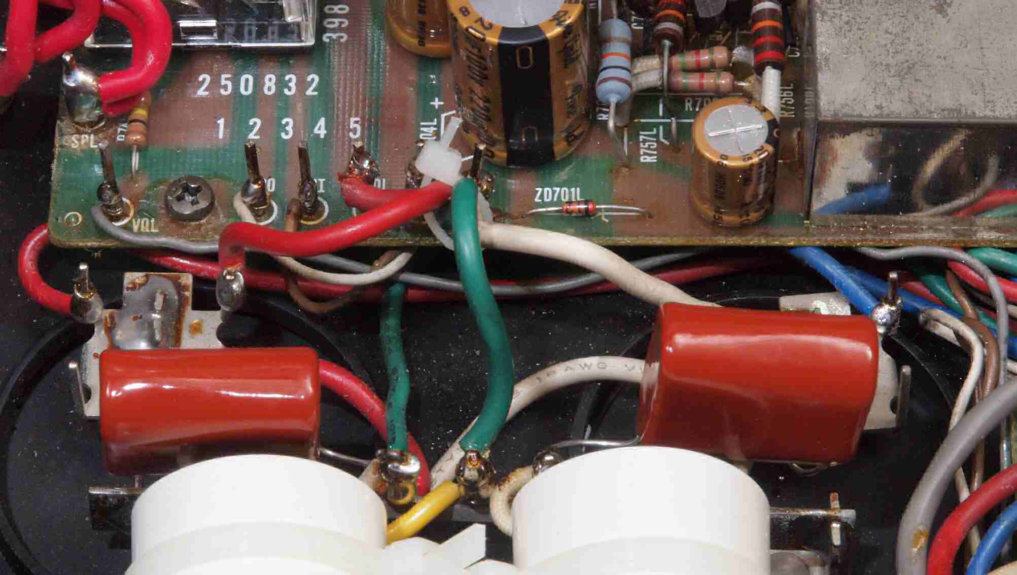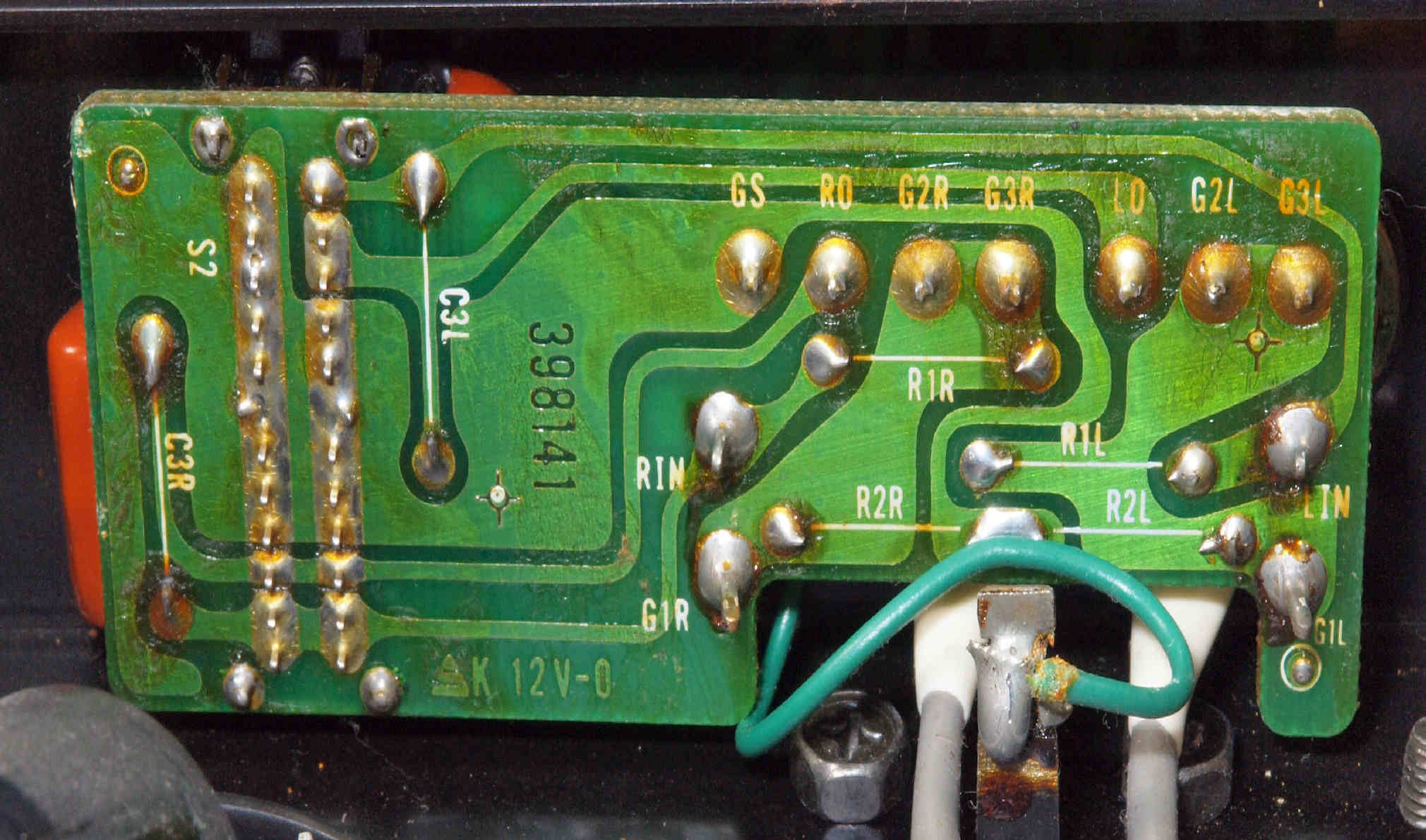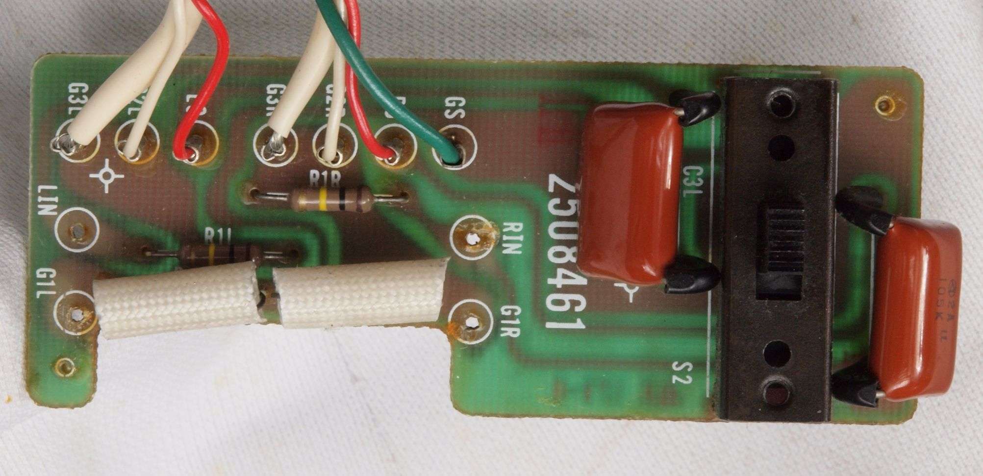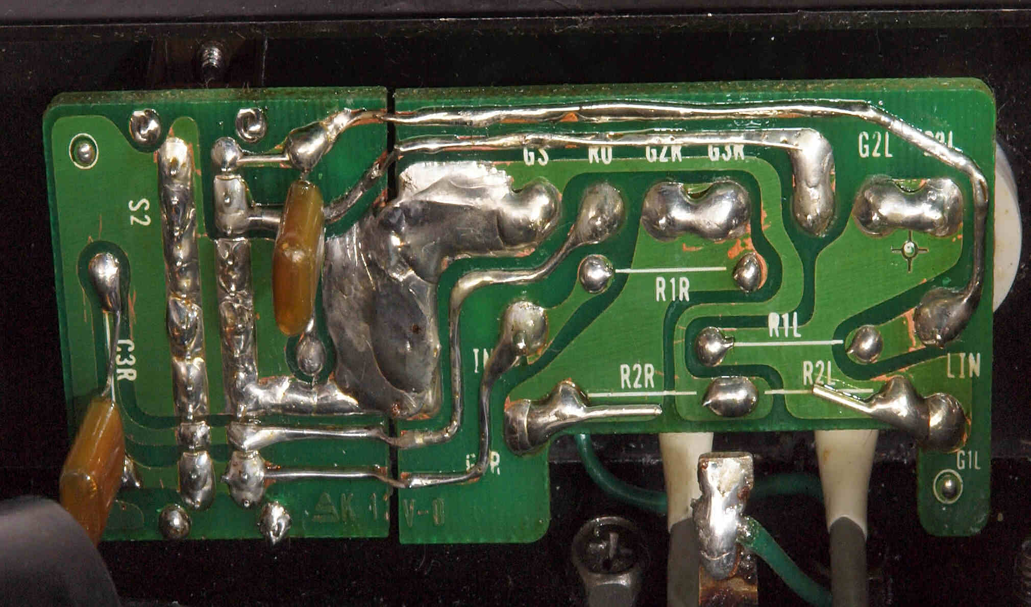 | C67. 修理(半田補正)後 RCA端子基板裏 半田を全部やり直す。 フイルムコンデンサー2個増設。 |