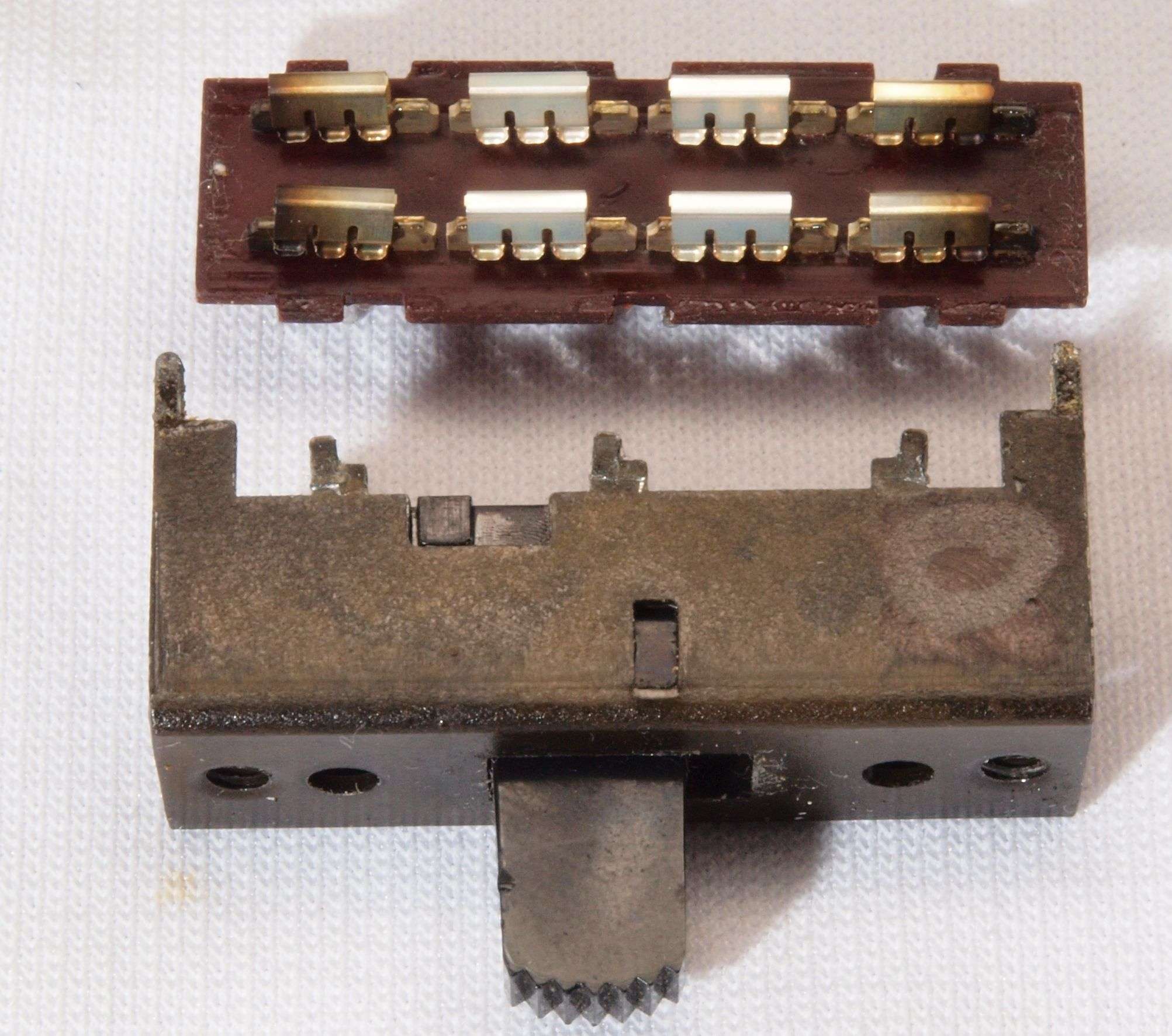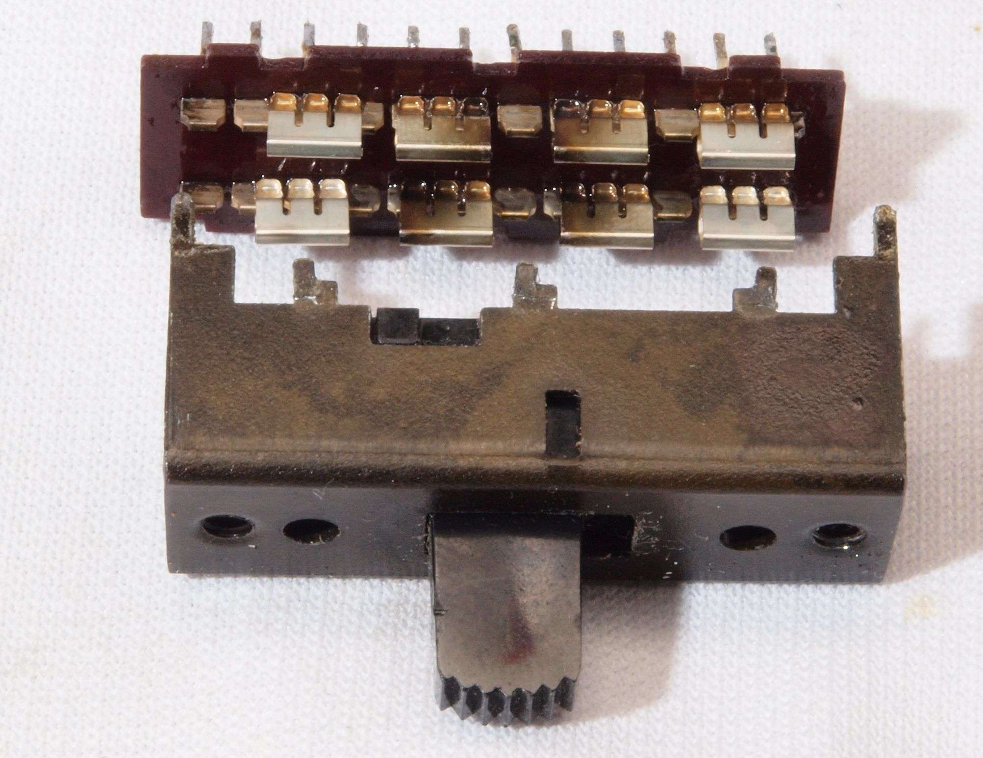 | C6A. 修理中 RCA端子基板の切り換えSW分解。使用するのは端の1回路なので、綺麗な接触子に交換して磨く。 |