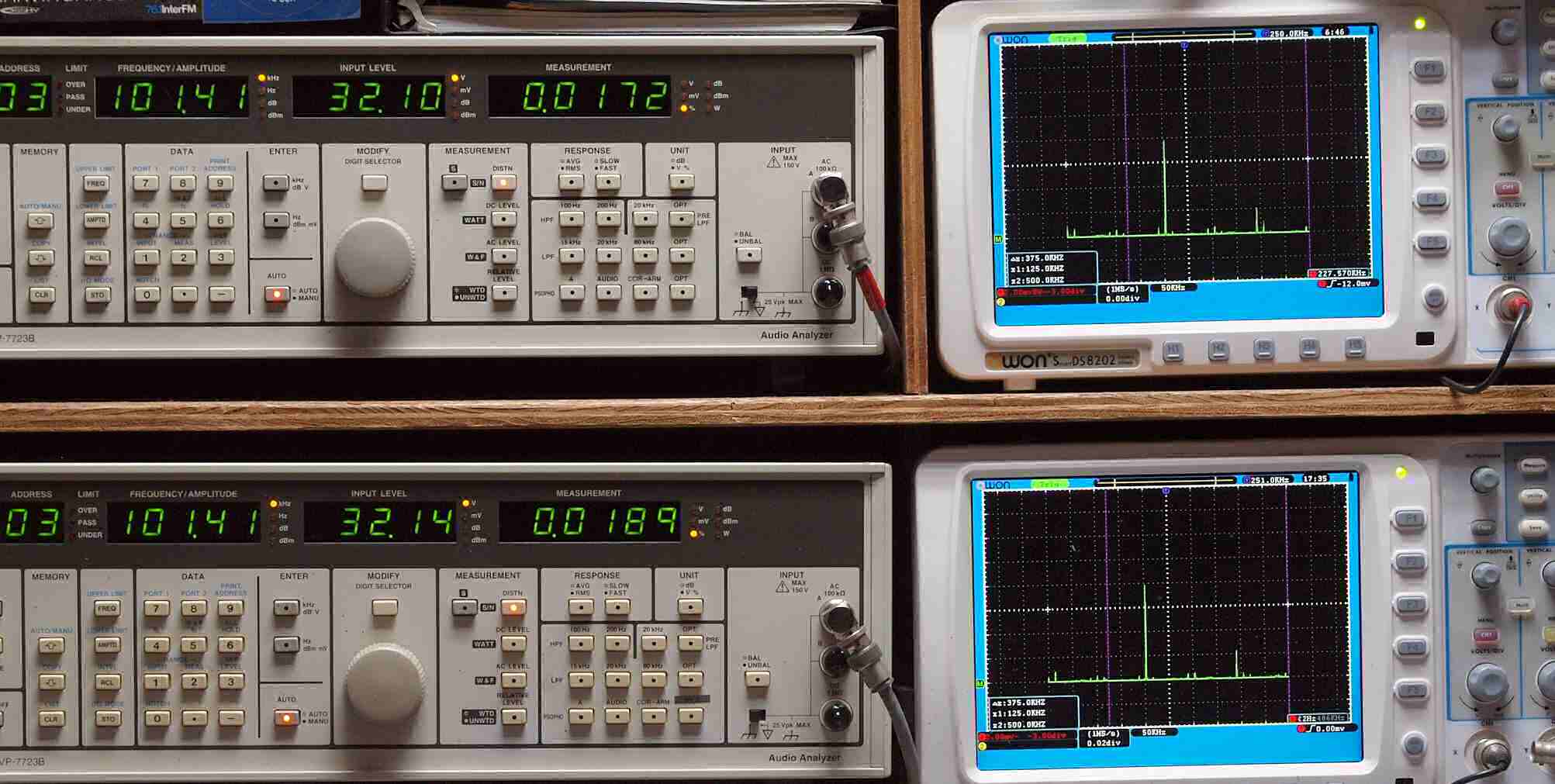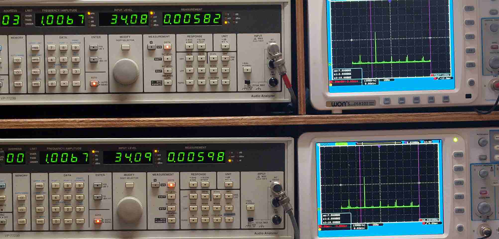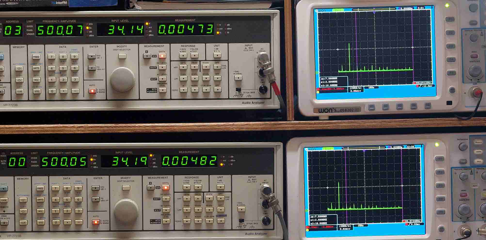 | E. 測定・調整 E1. 出力・歪み率測定・調整 「見方」。 上段中 右側SP出力を「Audio Analyzer Panasonic VP−7723B」により測定。 表示LED、 左端=メモリーNo、 中左=周波数測定、 中右=出力電圧測定、 右端=歪み率測定。 上段右端 VP−7723Bの基本波除去出力を「owon SDS8202(200MHZ)」で「FFT分析」表示。 下段中 左側SP出力を「Audio Analyzer Panasonic VP−7723B」により測定。 表示LED、 左端=メモリーNo、 中左=周波数測定、 中右=出力電圧測定、 右端=歪み率測定。 下段右端 VP−7723Bの基本波除去出力を「owon SDS6062(200MHZ)」で「FFT分析」表示。 下段左端 オーディオ発振器 VP−7201A より50Hz〜100kHzの信号を出し(歪み率=約0.003%)、ATT+分配器を通し、AMPに入力。 よって、ダイアル設定出力レベルより低くなります。測定機器の仕様や整備の様子はこちら、「VP−7723B」「VP−7201A」。 FFT画面の見方はこちら。 |