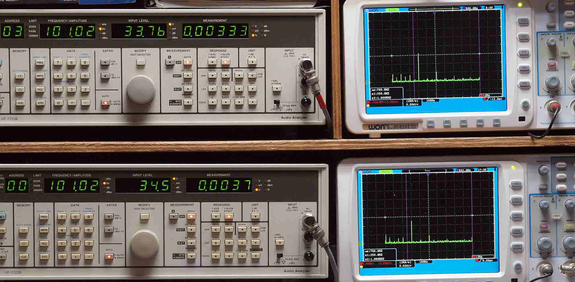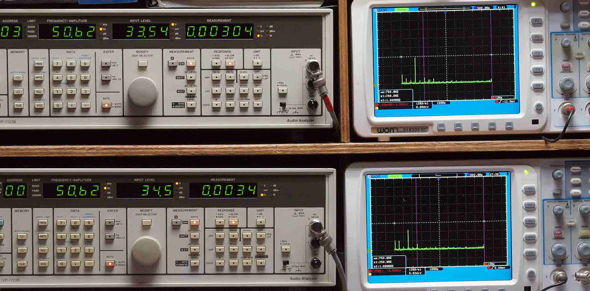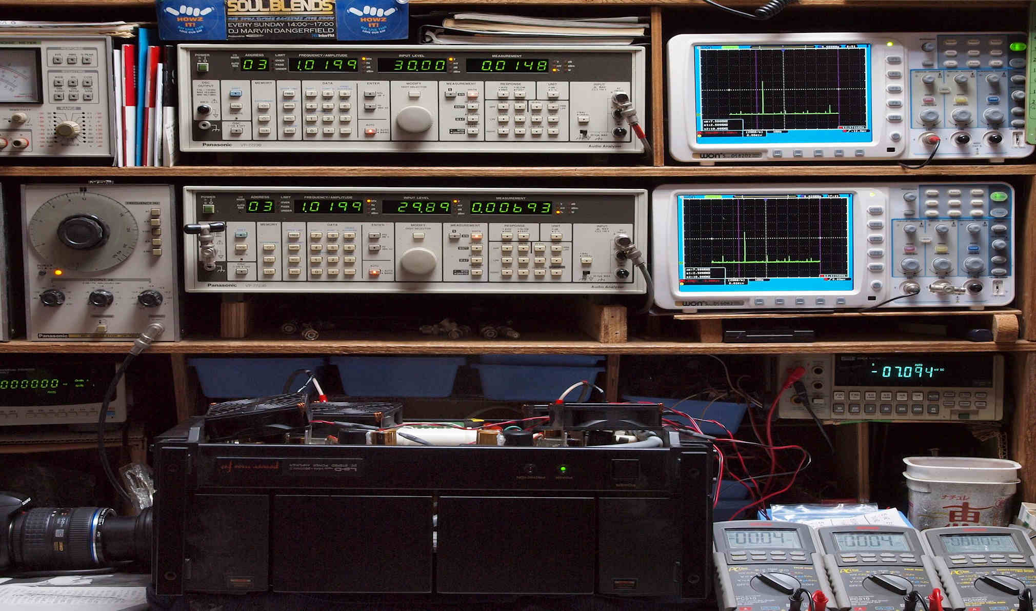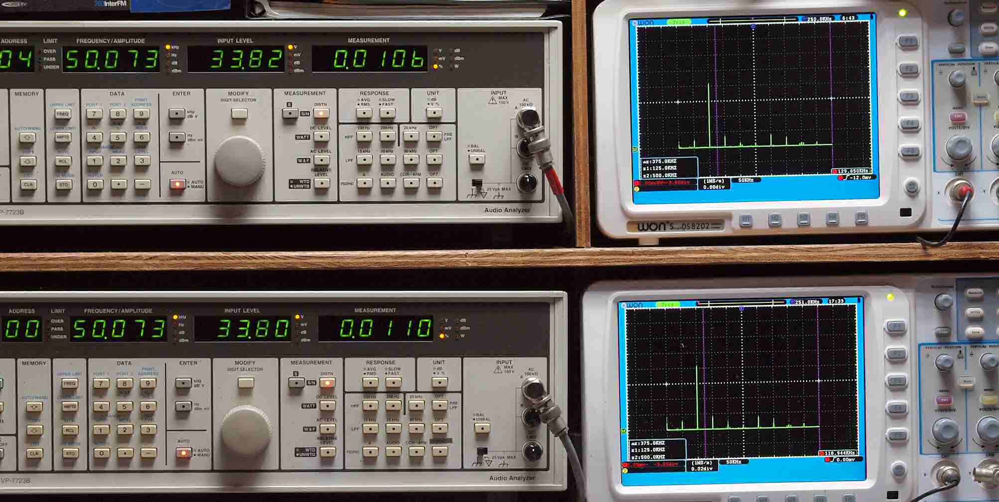 | E. 測定・調整 E1. 出力・歪み率測定・調整 「見方」。 上段中 右側SP出力を「Audio Analyzer Panasonic VP−7723B」により測定。 表示LED、 左端=メモリーNo、 中左=周波数測定、 中右=出力電圧測定、 右端=歪み率測定。 上段右端 VP−7723Bの基本波除去出力を「owon SDS8202(200MHZ)」で「FFT分析」表示。 下段中 左側SP出力を「Audio Analyzer Panasonic VP−7723B」により測定。 表示LED、 左端=メモリーNo、 中左=周波数測定、 中右=出力電圧測定、 右端=歪み率測定。 下段右端 VP−7723Bの基本波除去出力を「owon SDS6062(200MHZ)」で「FFT分析」表示。 下段左端 オーディオ発振器 VP−7201A より50Hz〜100kHzの信号を出し(歪み率=約0.003%)、ATT+分配器を通し、AMPに入力。 よって、ダイアル設定出力レベルより低くなります。測定機器の仕様や整備の様子はこちら、「VP−7723B」「VP−7201A」。 FFT画面の見方はこちら。 |