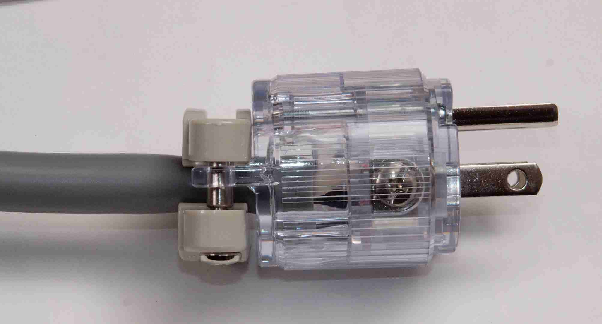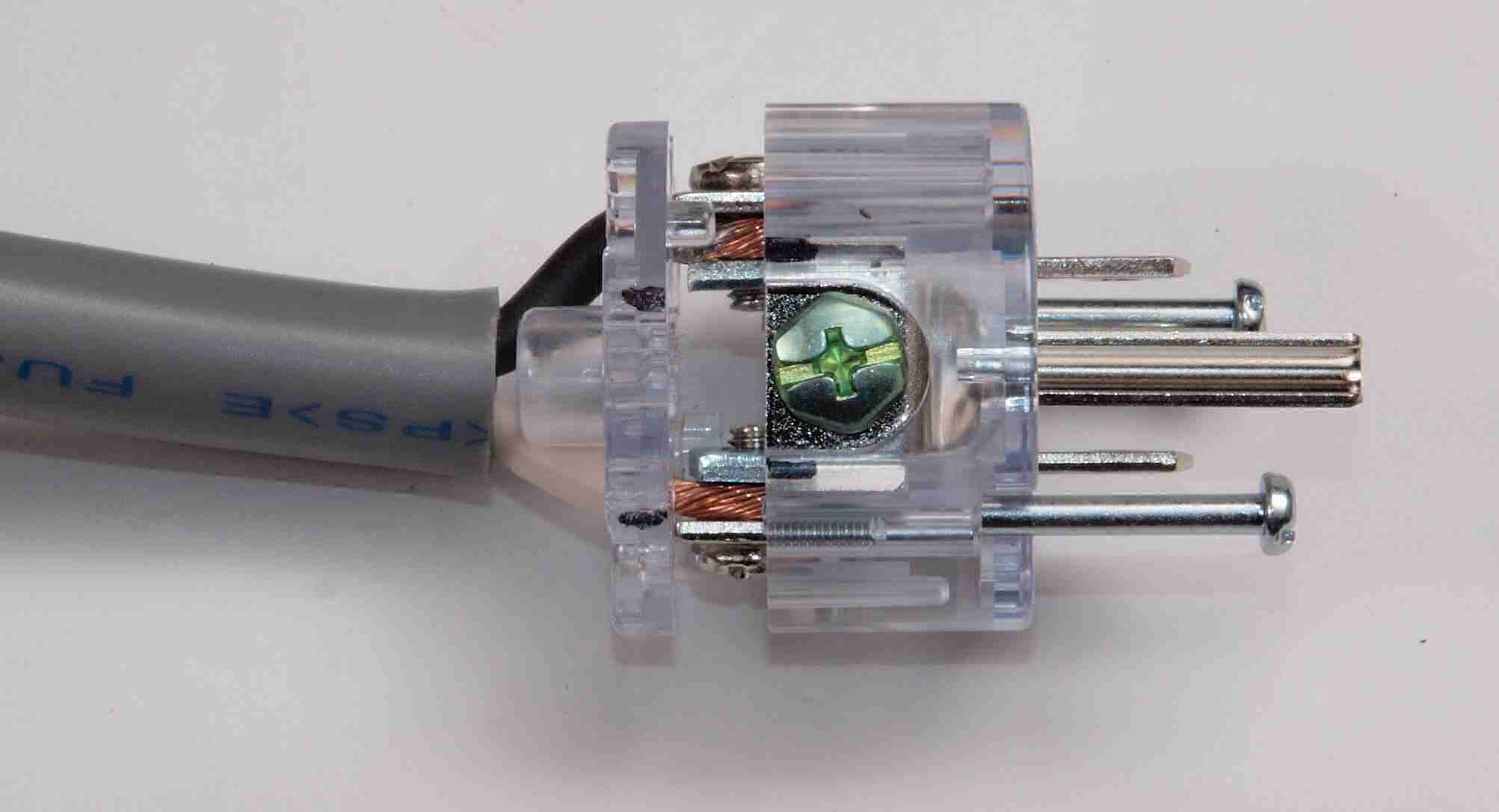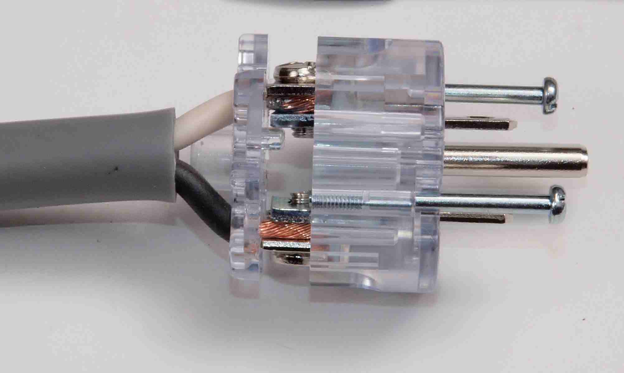 | C9A. 修理中 3Pプラグにケーブル取り付。 差し込み固定が一般ですが、時計方向に巻き付けると良い。 上の白線=巻き付いた端側、 下の黒線=挿入した側。止めビスは未締結です。 これで差し込み固定の3倍位接触面積が増し、接触抵抗が低くなる。 |