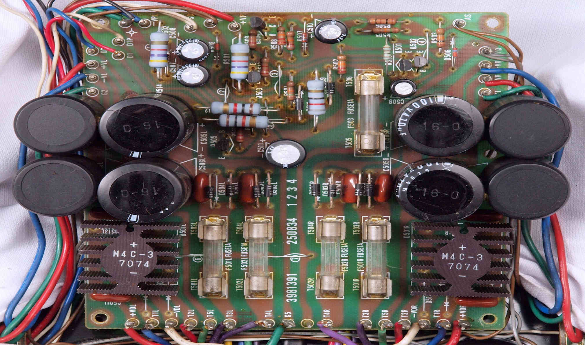 | C12. 修理後 R側ドライブ基板 初段FET、バランス・バイアス調整用半固定VR3個、SP接続リレー交換 ヒューズ入り抵抗全部、電解コンデンサー11個交換 |