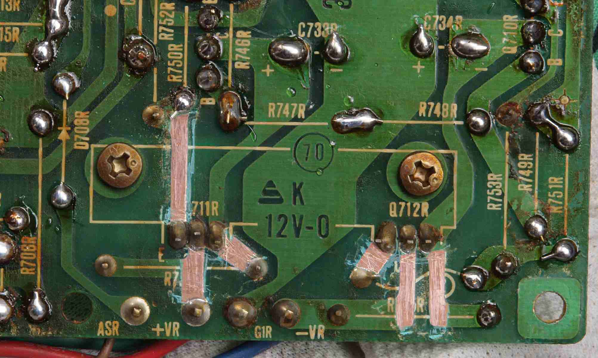 | C14. 修理中 R側ドライブ基板裏 定電圧TR(トランジスター)の足の銅箔を広げる。 |
