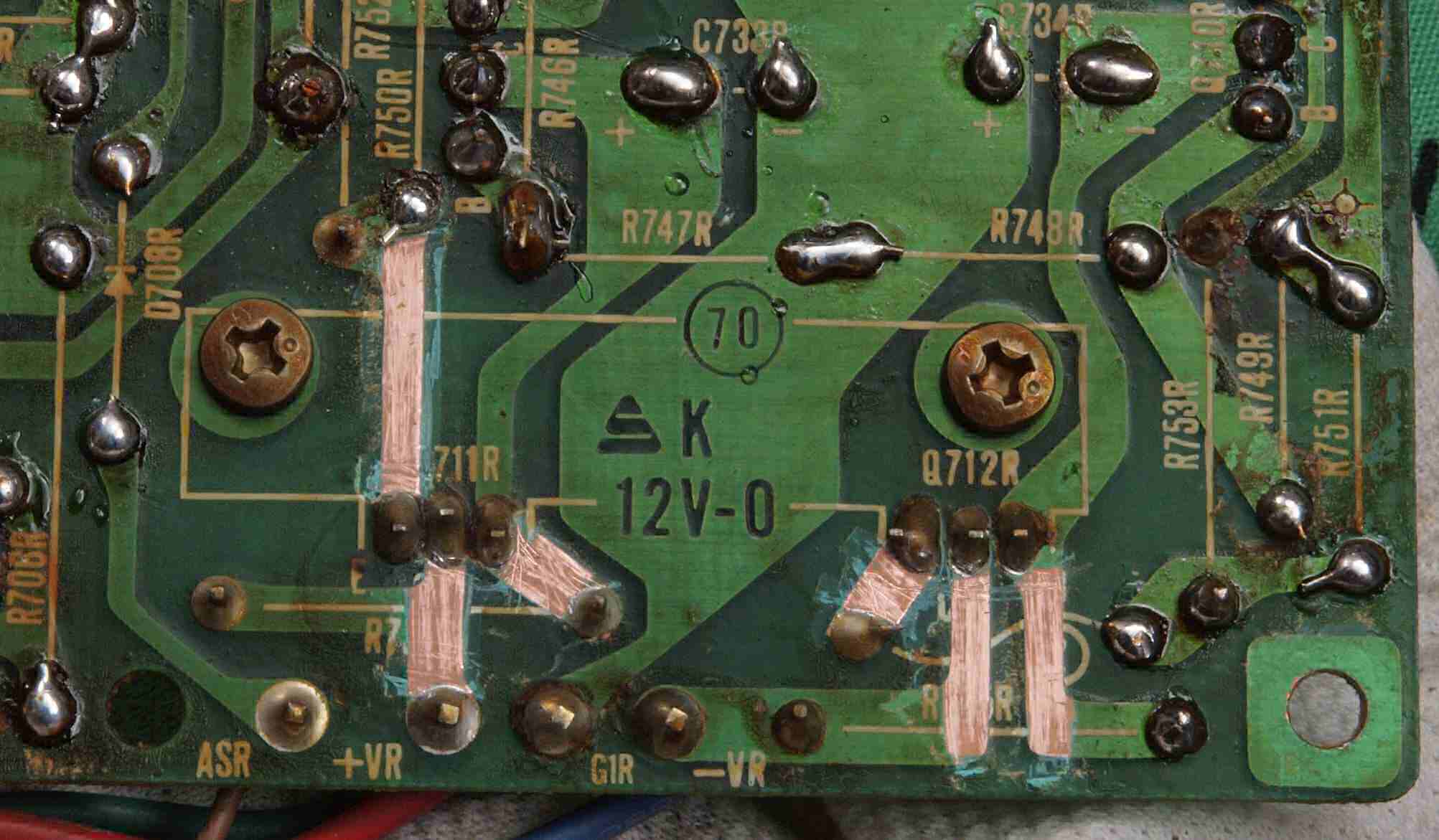 | CA6. 修理後 R側ドライブ基板−電源基板へのラッピング線に半田を浸み込ませる |