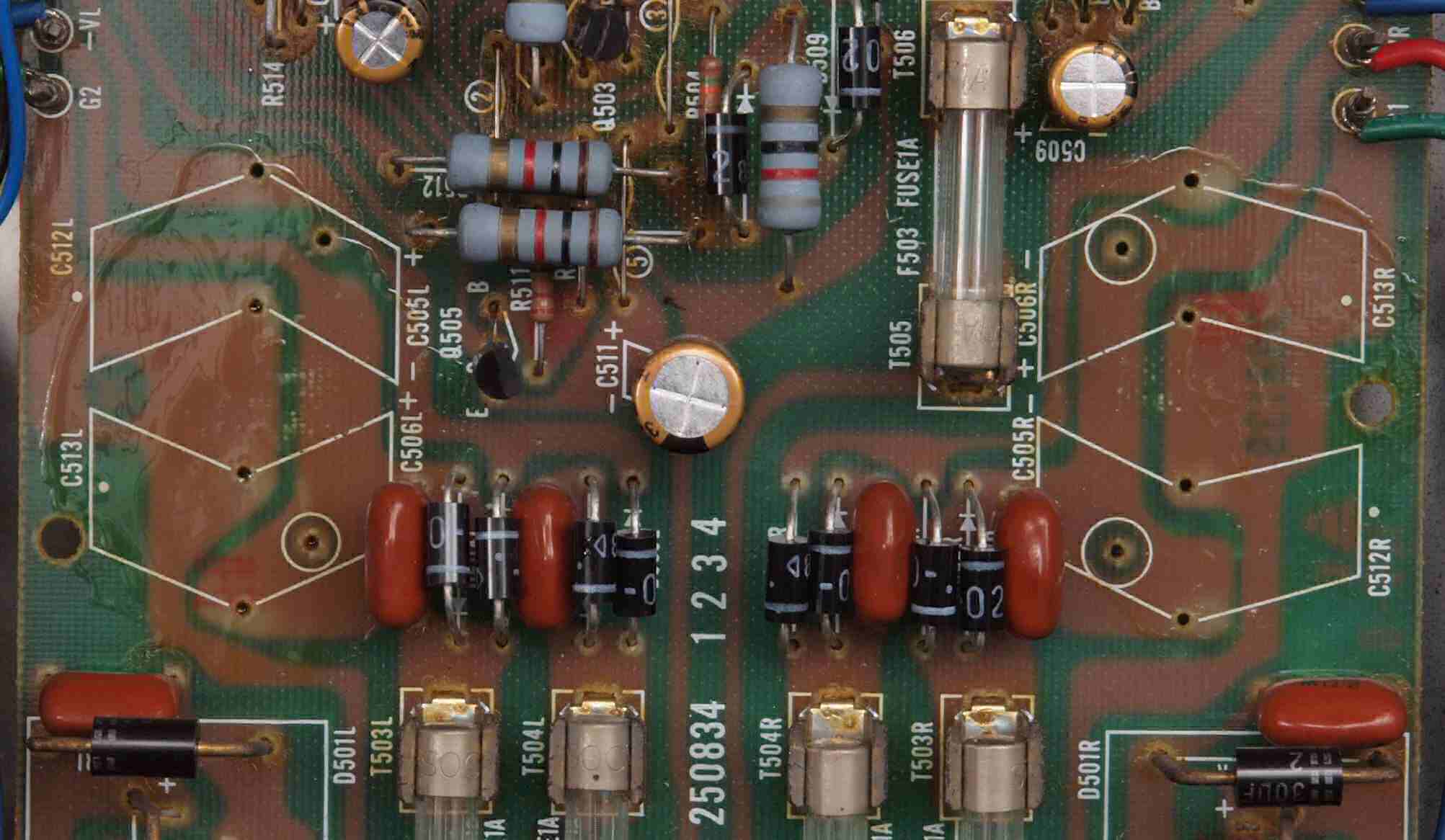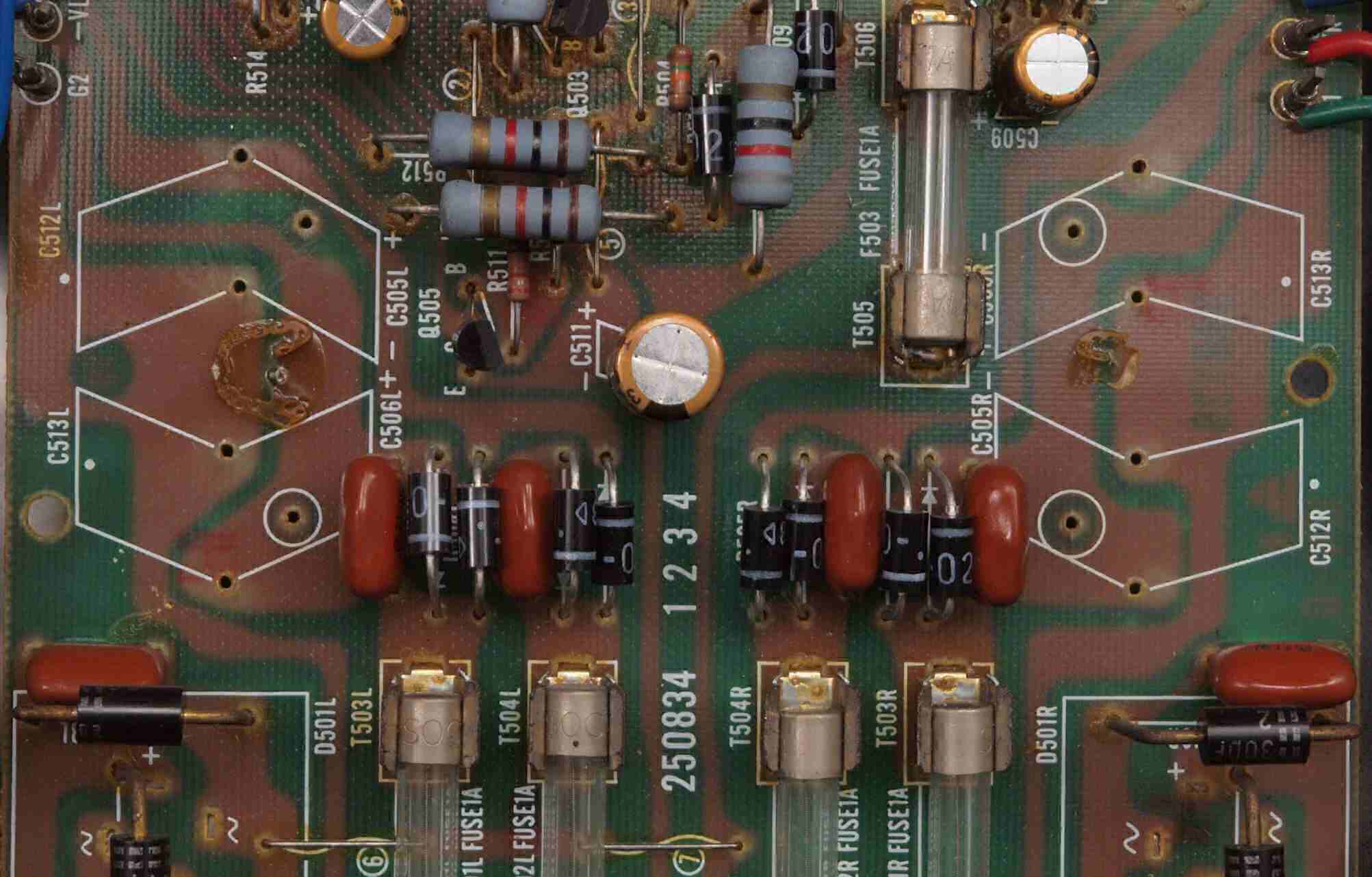 | C513. 修理中 電源基板。 トルエン溶媒の接着剤を取り去り、コートを塗布後。 |