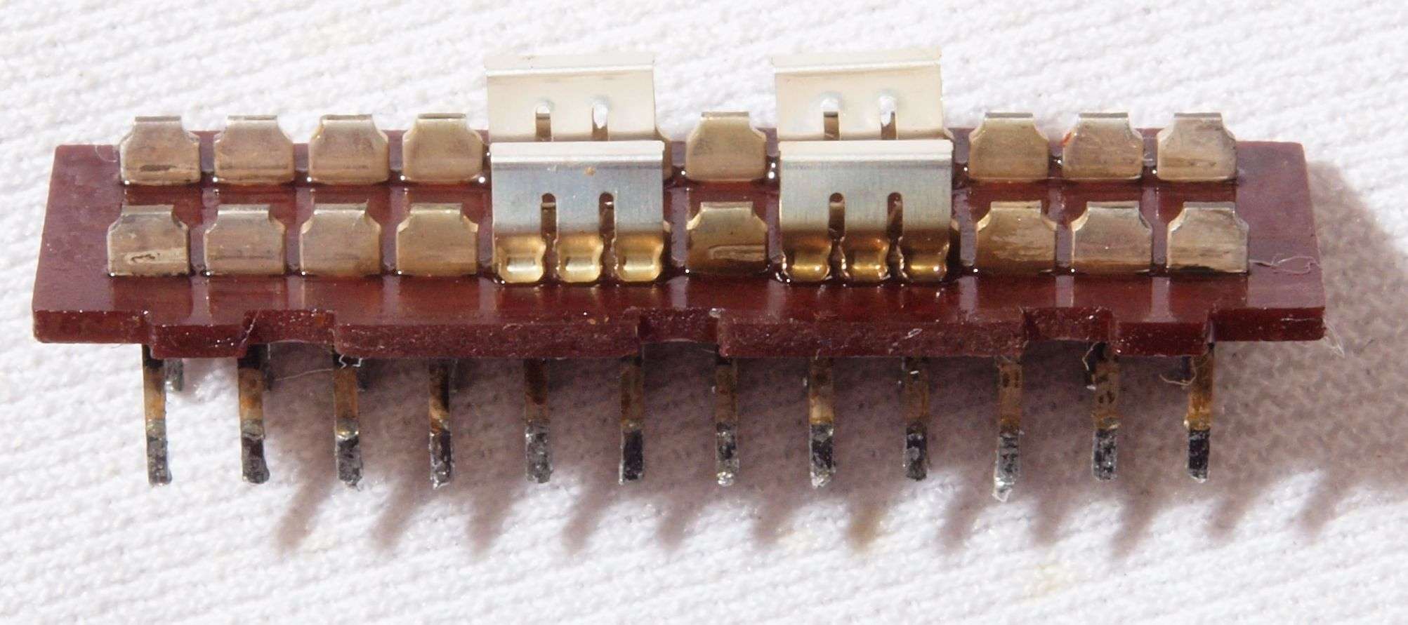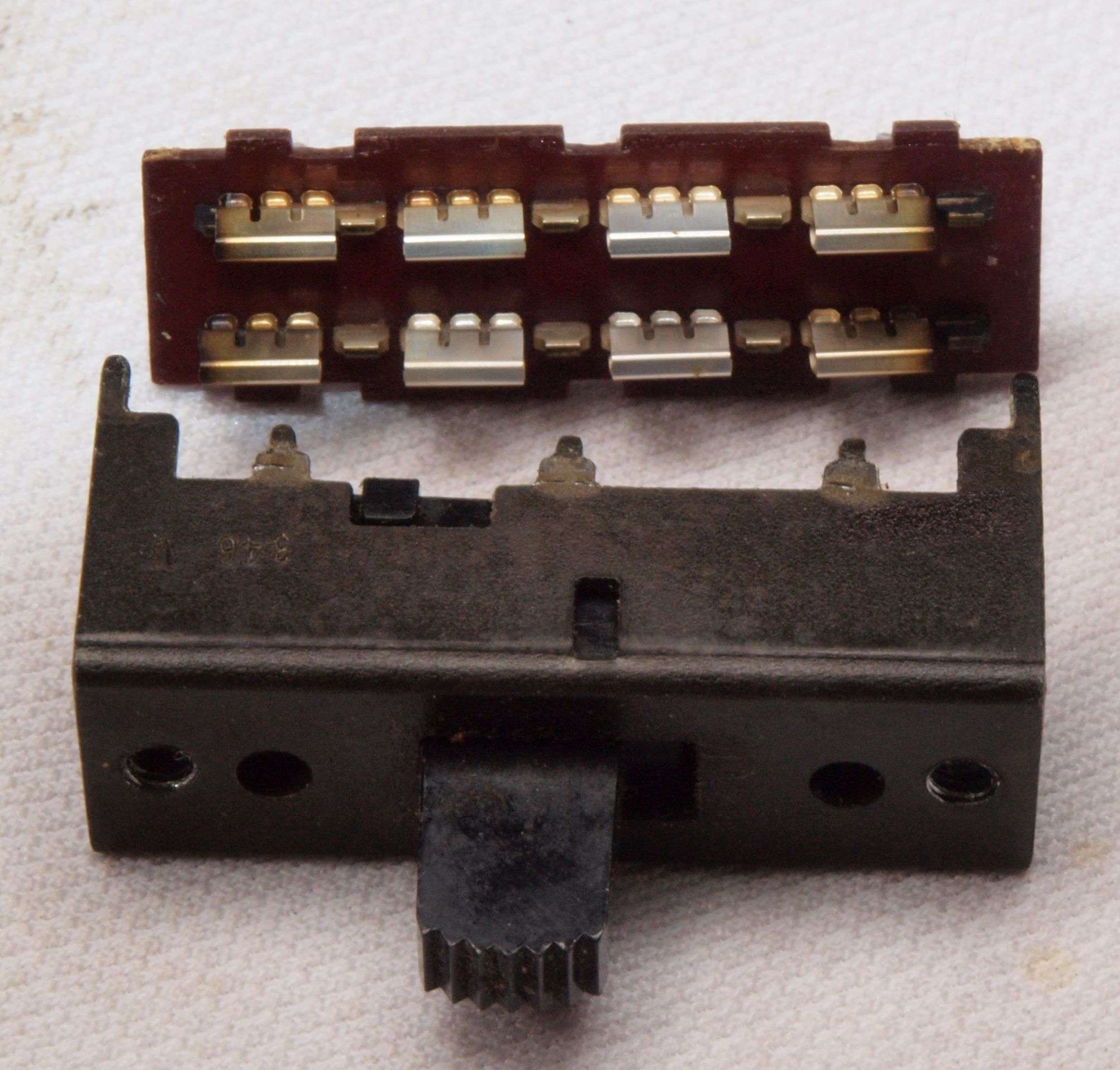 | C69. 修理中 RCA端子基板の切り換えSW分解。 使用するのは端の1回路のみ、内側の綺麗な接触子と交換して磨く。 |