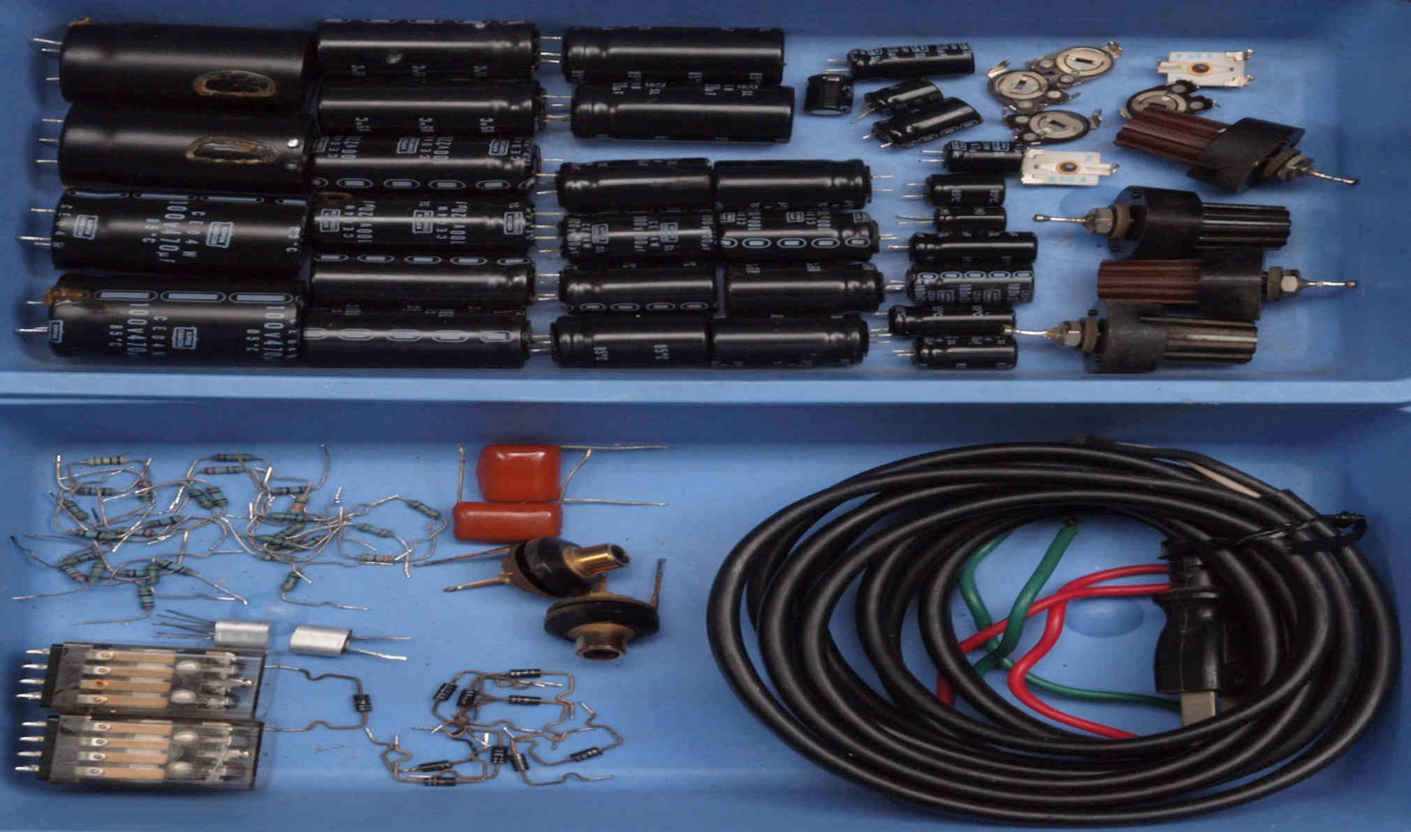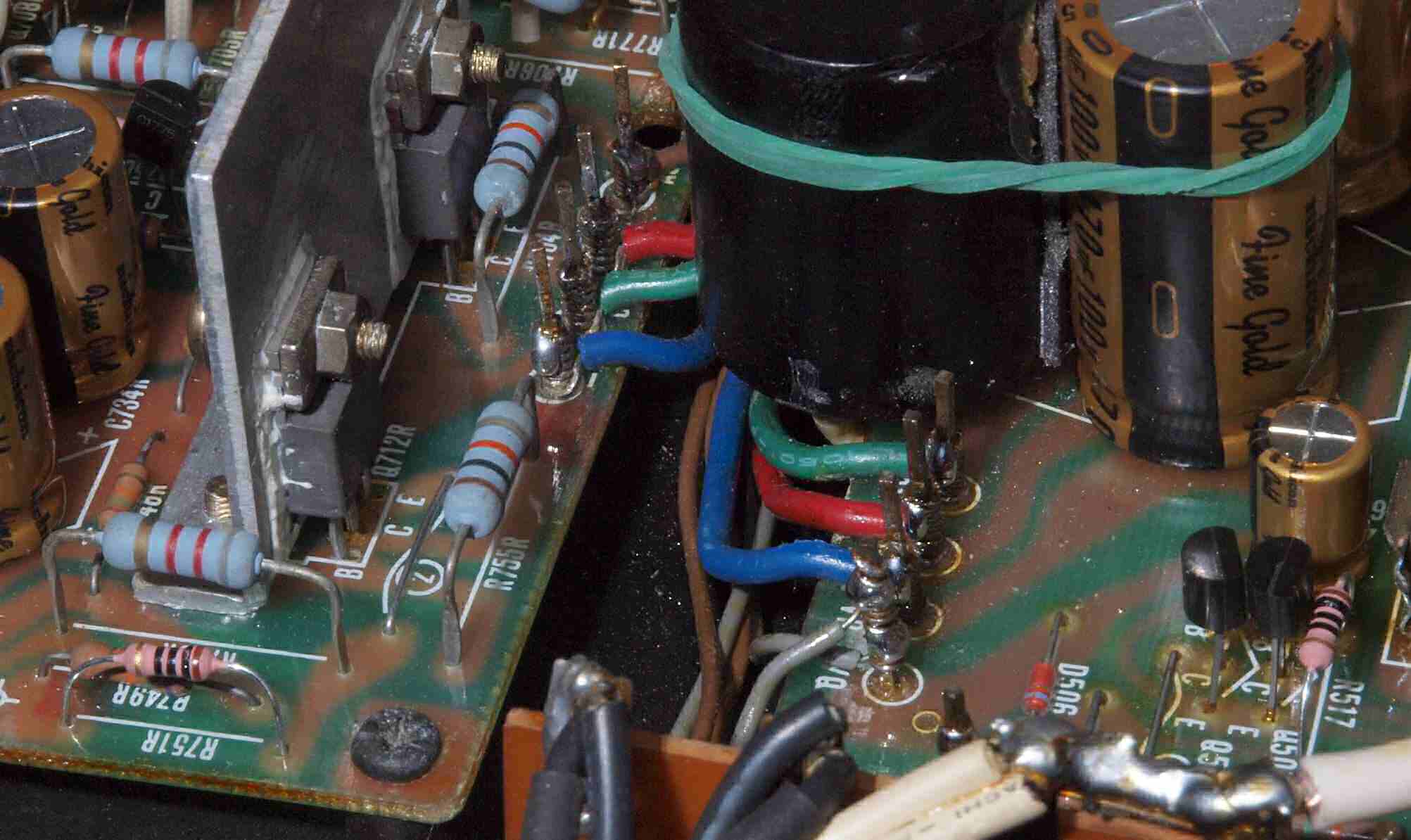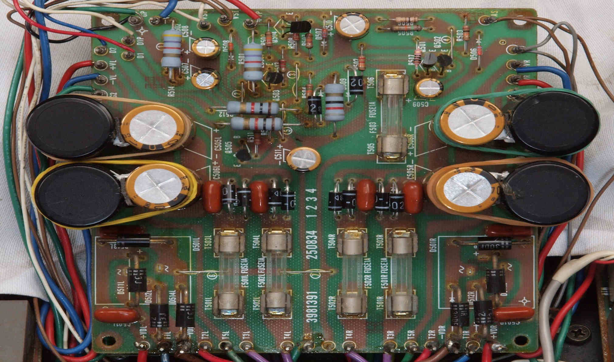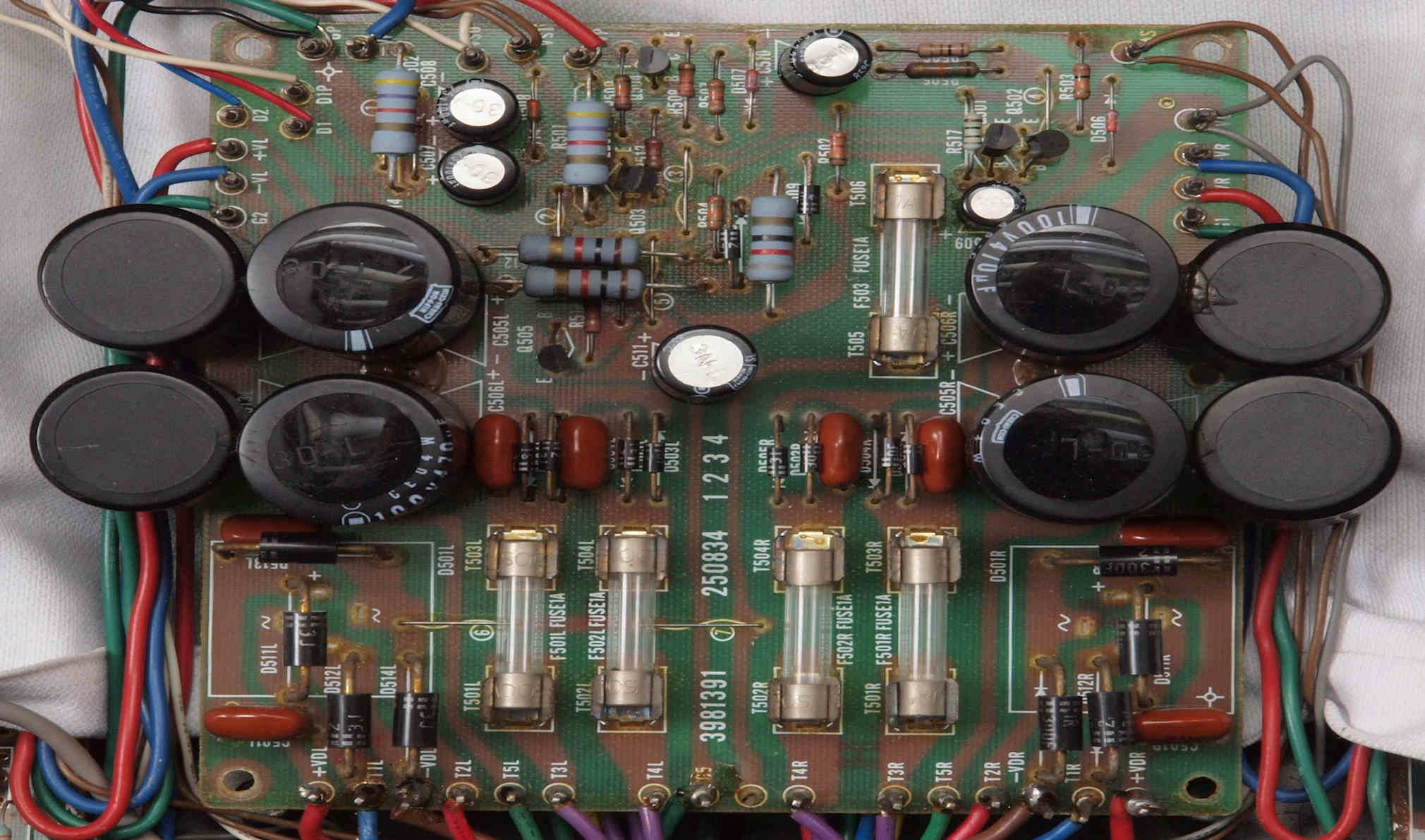 | C52. 修理後 電源基板 ヒューズ入り抵抗全部、電解コンデンサー9個、整流ダイオード10個交換。 輪ゴムは接着材が硬化するまで固定する。 |