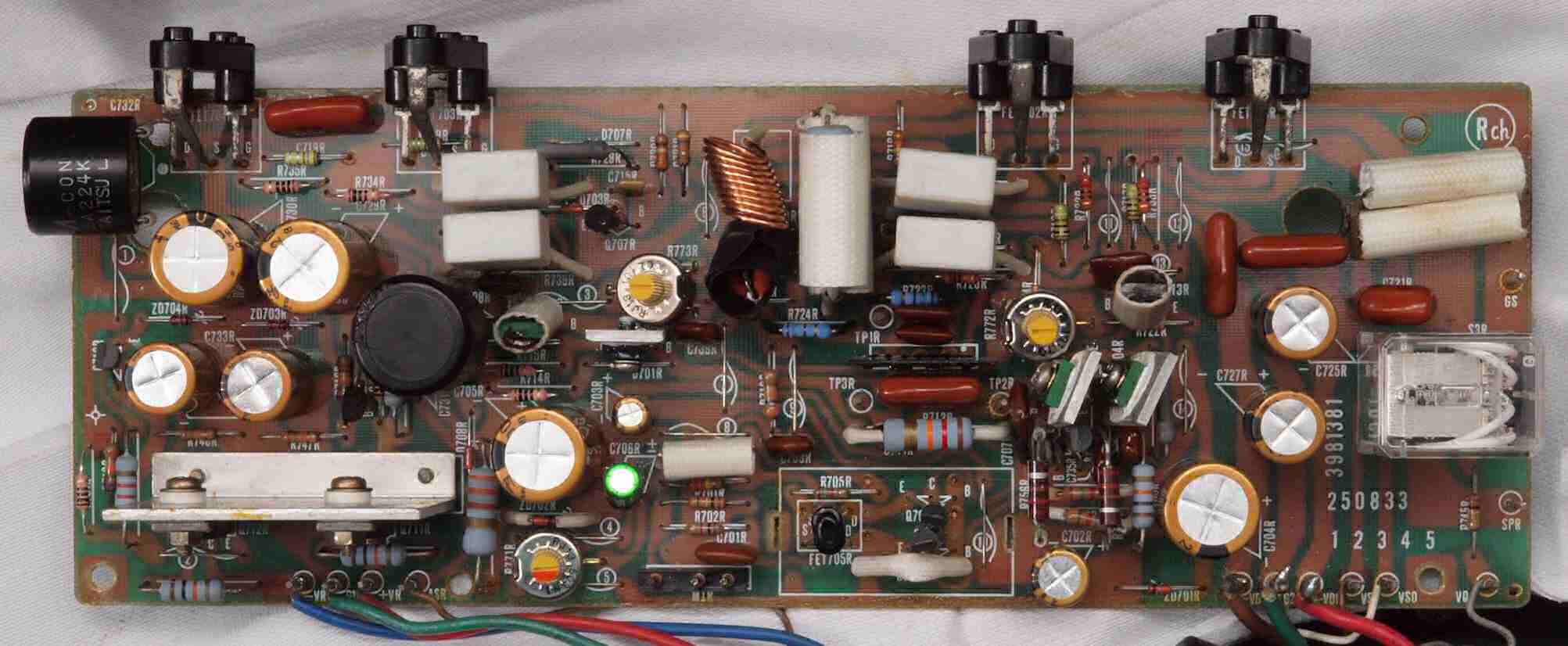 | C12. 修理後 R側ドライブ基板 初段FET、バランス・バイアス調整用半固定VR3個、SP接続リレー交換 ヒューズ入り抵抗全部、電解コンデンサー11個交換。写真撮影後TR(トランジスター)2個交換。 |