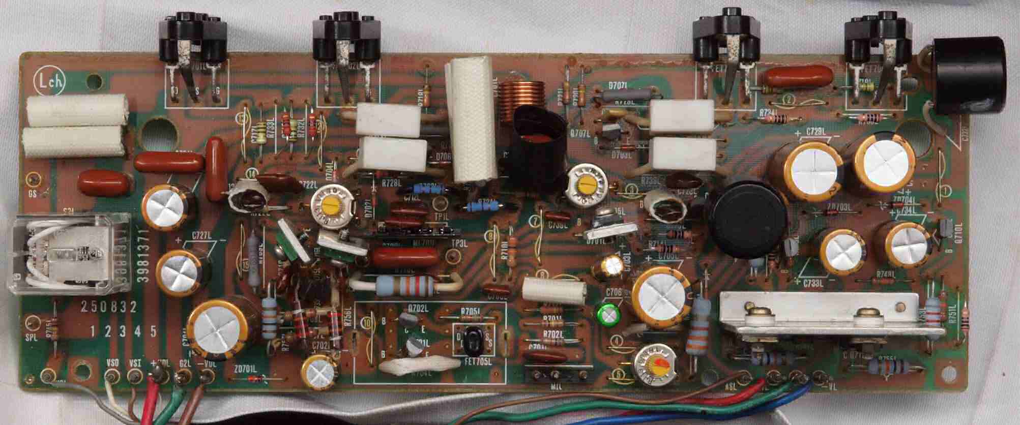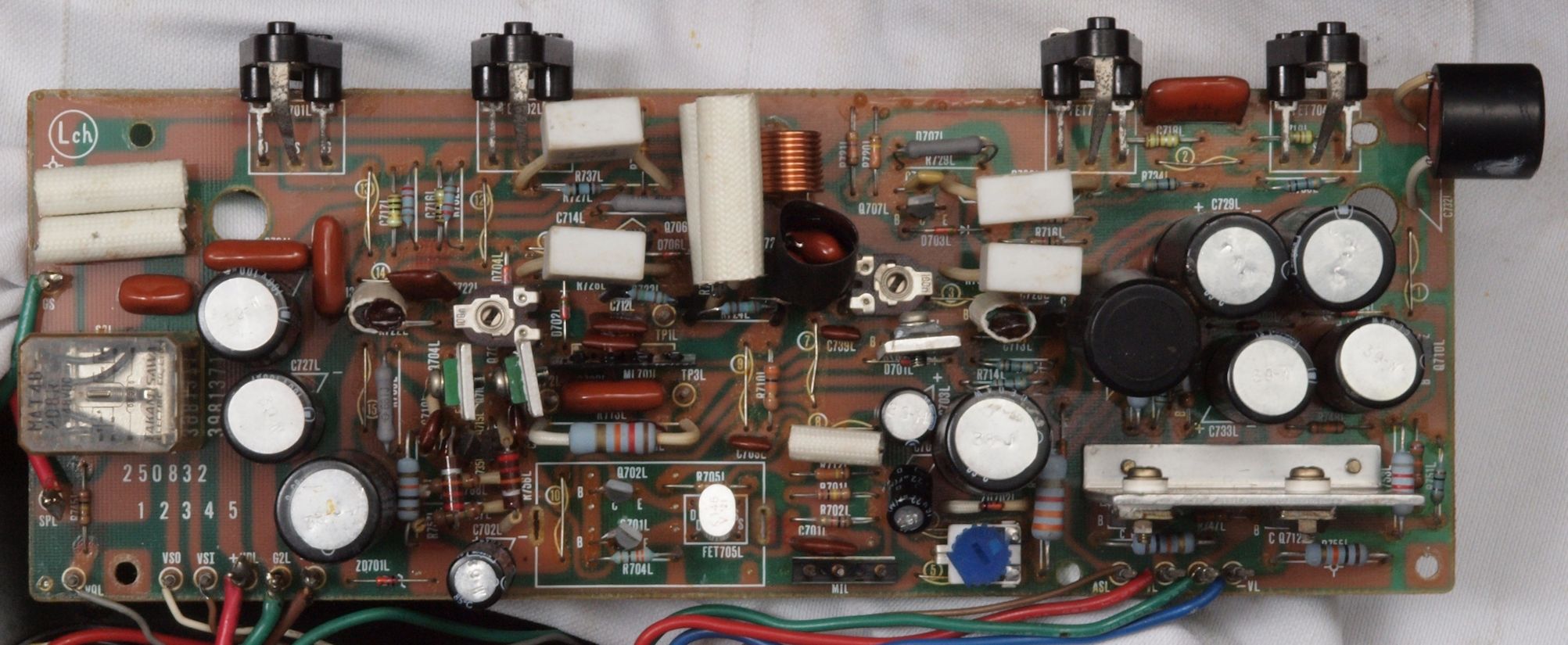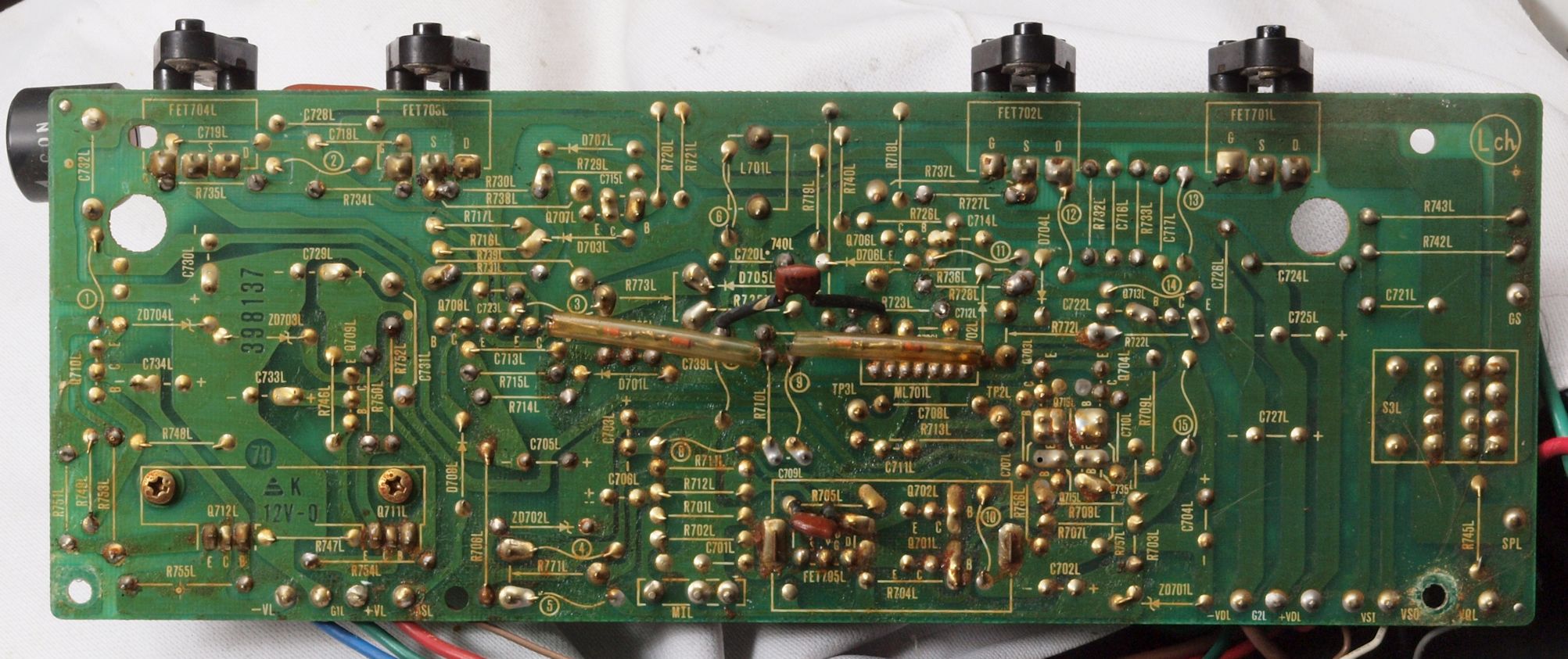 | C22. 修理後 L側ドライブ基板 初段FET、バランス/バイアス調整用半固定VR3個、SP接続リレー交換 ヒューズ入り抵抗全部、電解コンデンサー11個交換。写真撮影後TR(トランジスター)2個交換。 |