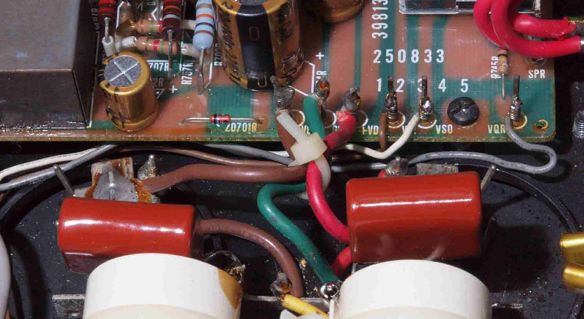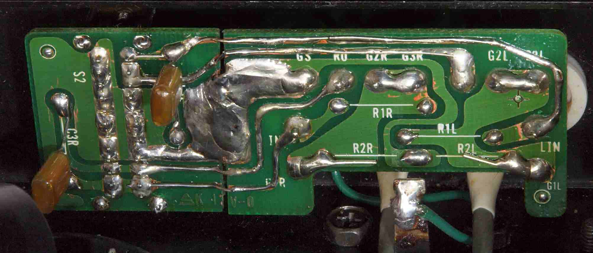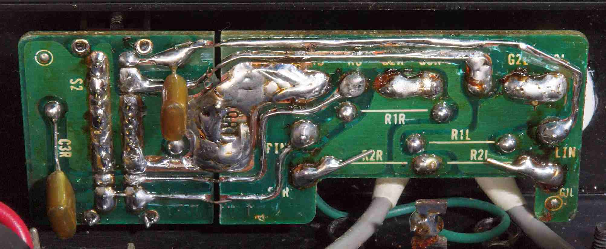 | C66. 修理(半田補正)後 RCA端子基板裏 半田を全部やり直す フイルムコンデンサー2個増設 |
