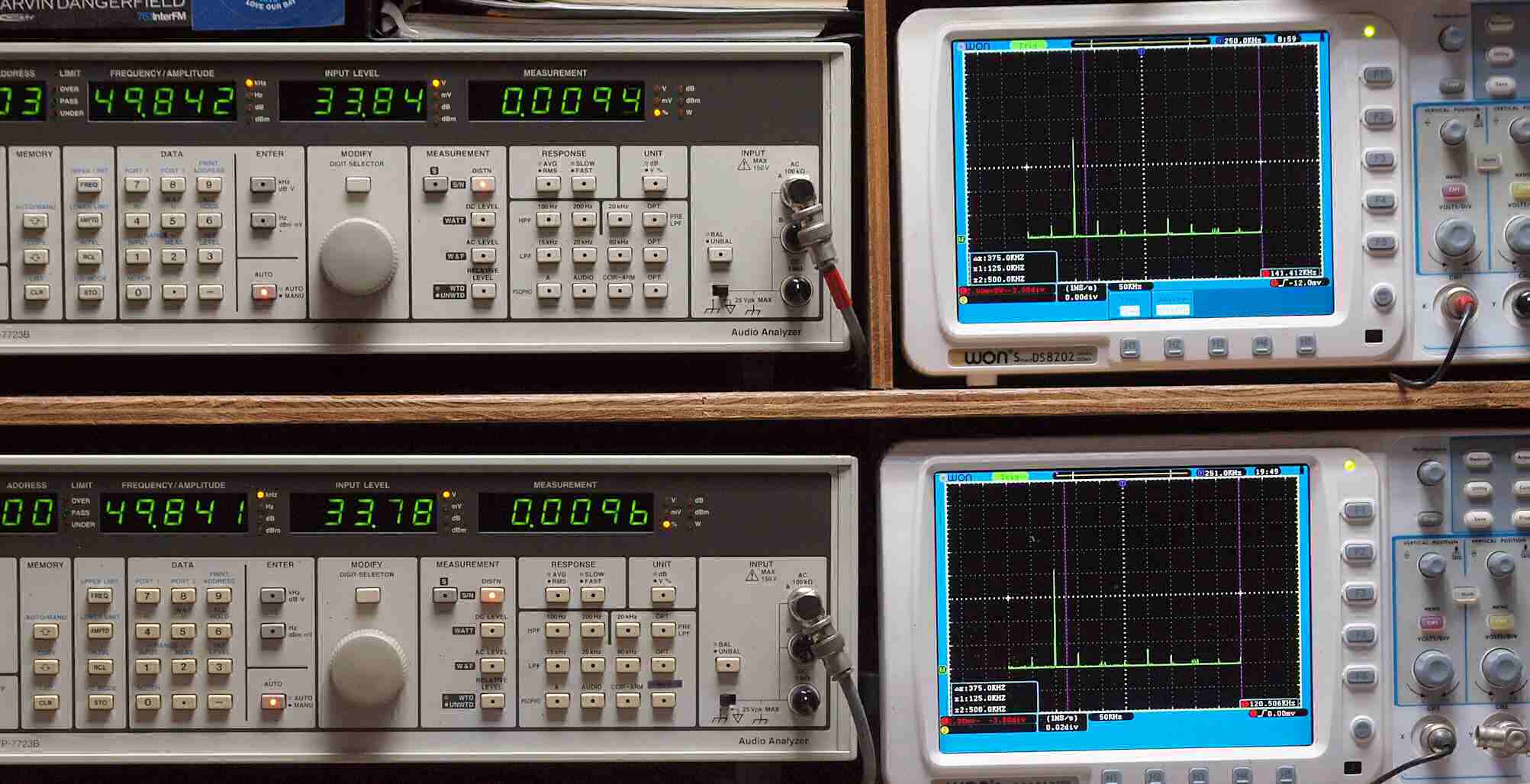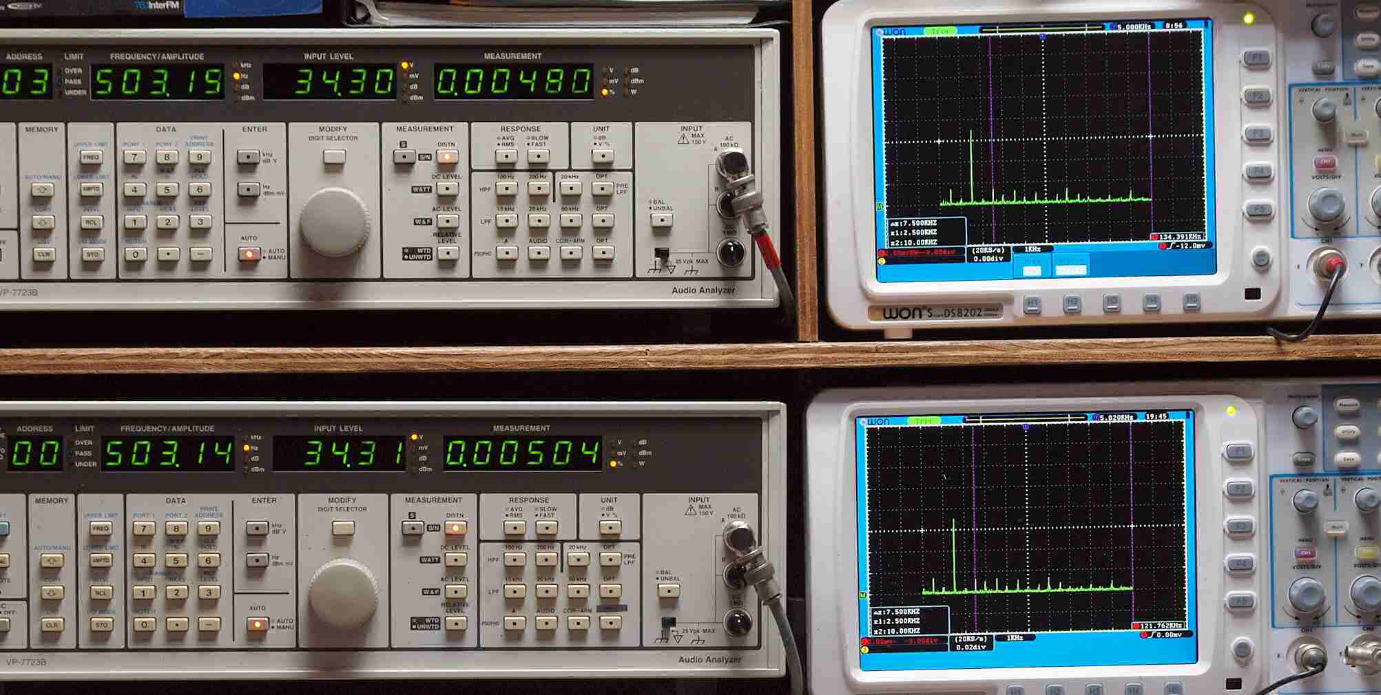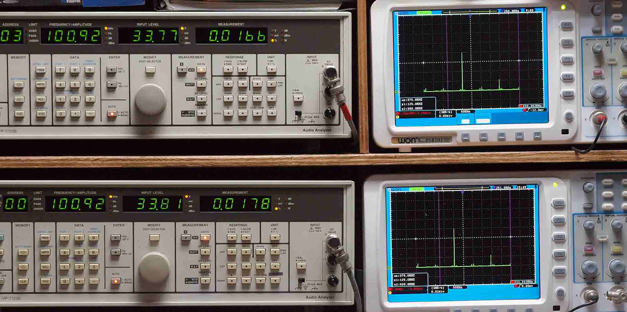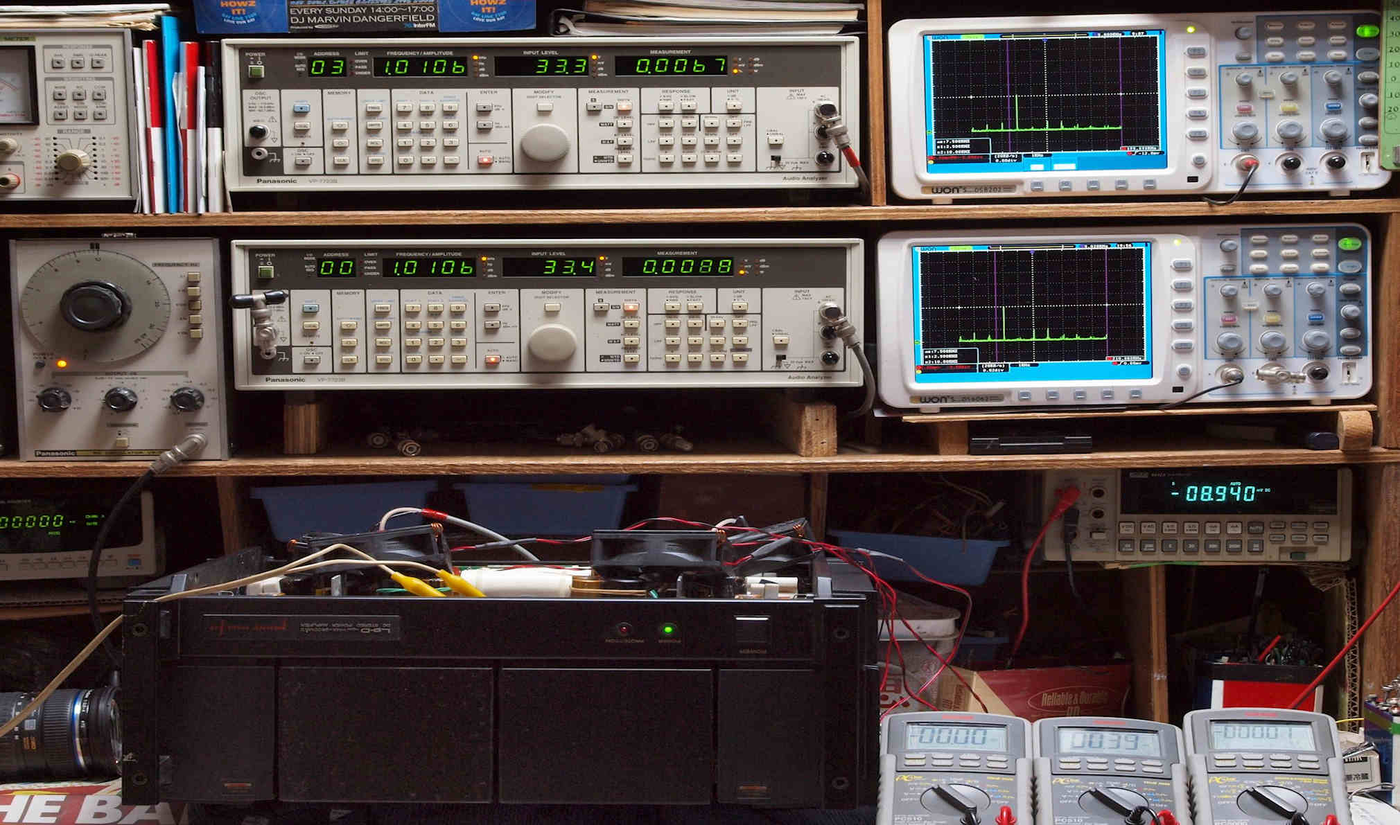| E. 測定・調整 E1. 出力・歪み率測定・調整 「見方」。 上段中 右側SP出力を「Audio Analyzer Panasonic VP−7723B」により測定。 表示LED、 左端=メモリーNo、 中左=周波数測定、 中右=出力電圧測定、 右端=歪み率測定。 上段右端 VP−7723Bの基本波除去出力を「owon SDS8202(200MHZ)」で「FFT分析」表示。 下段中 左側SP出力を「Audio Analyzer Panasonic VP−7723B」により測定。 表示LED、 左端=メモリーNo、 中左=周波数測定、 中右=出力電圧測定、 右端=歪み率測定。 下段右端 VP−7723Bの基本波除去出力を「owon SDS6062(200MHZ)」で「FFT分析」表示。 下段左端 オーディオ発振器 VP−7201A より50Hz〜100kHzの信号を出し(歪み率=約0.003%)、ATT+分配器を通し、AMPに入力。 よって、ダイアル設定出力レベルより低くなります。測定機器の仕様や整備の様子はこちら、「VP−7723B」「VP−7201A」。 FFT画面の見方はこちら。 |