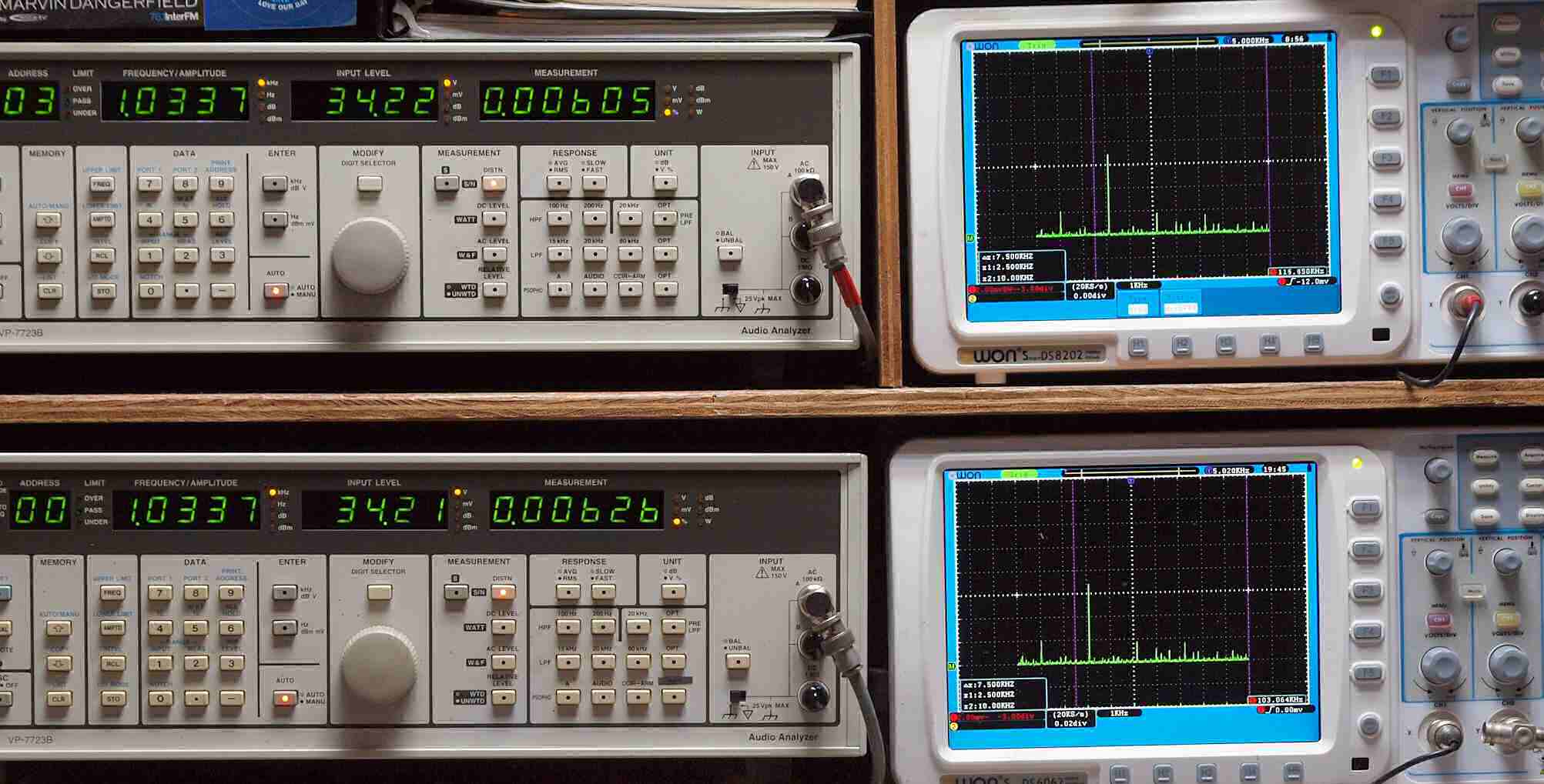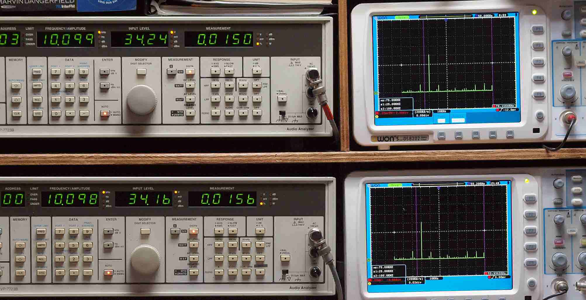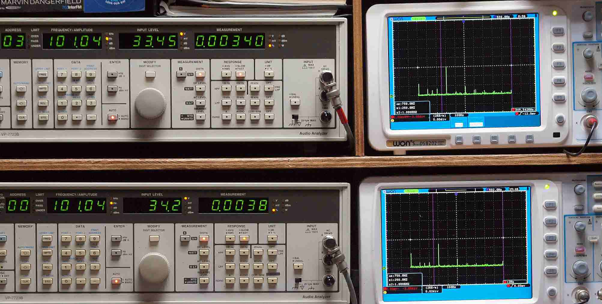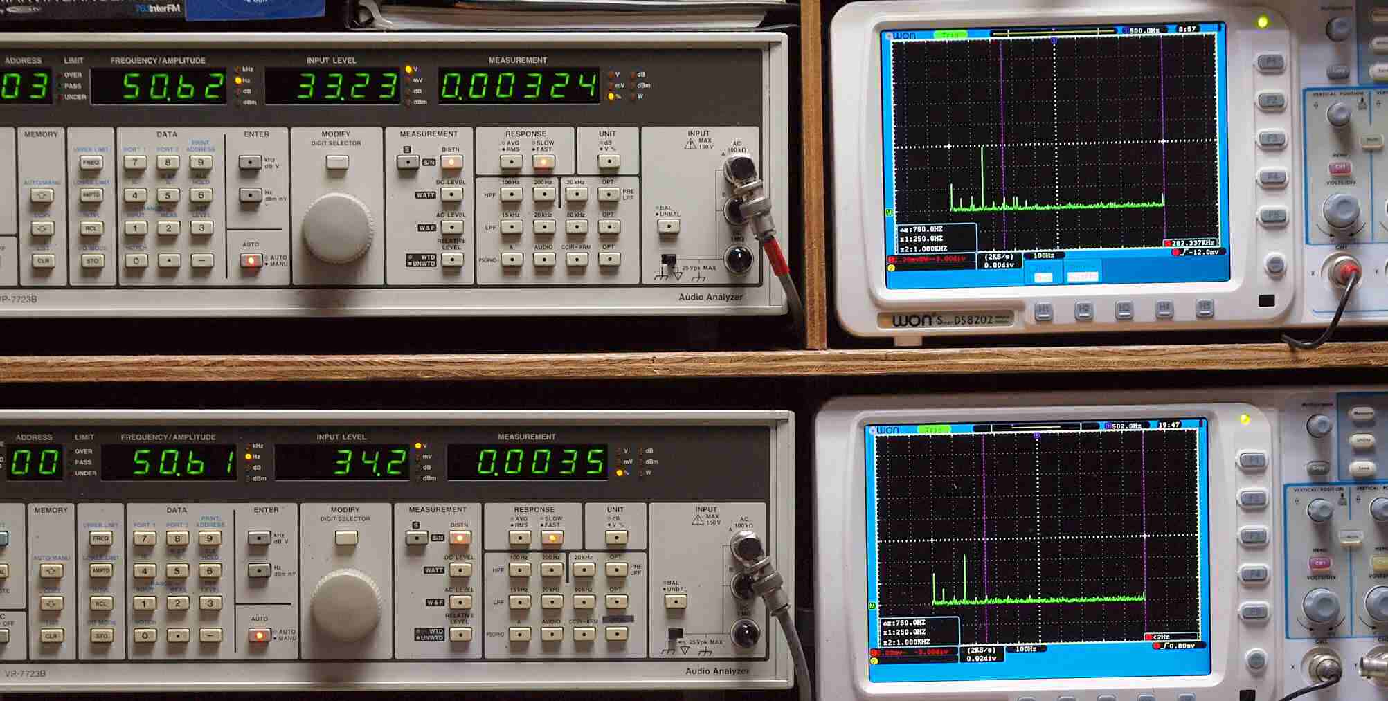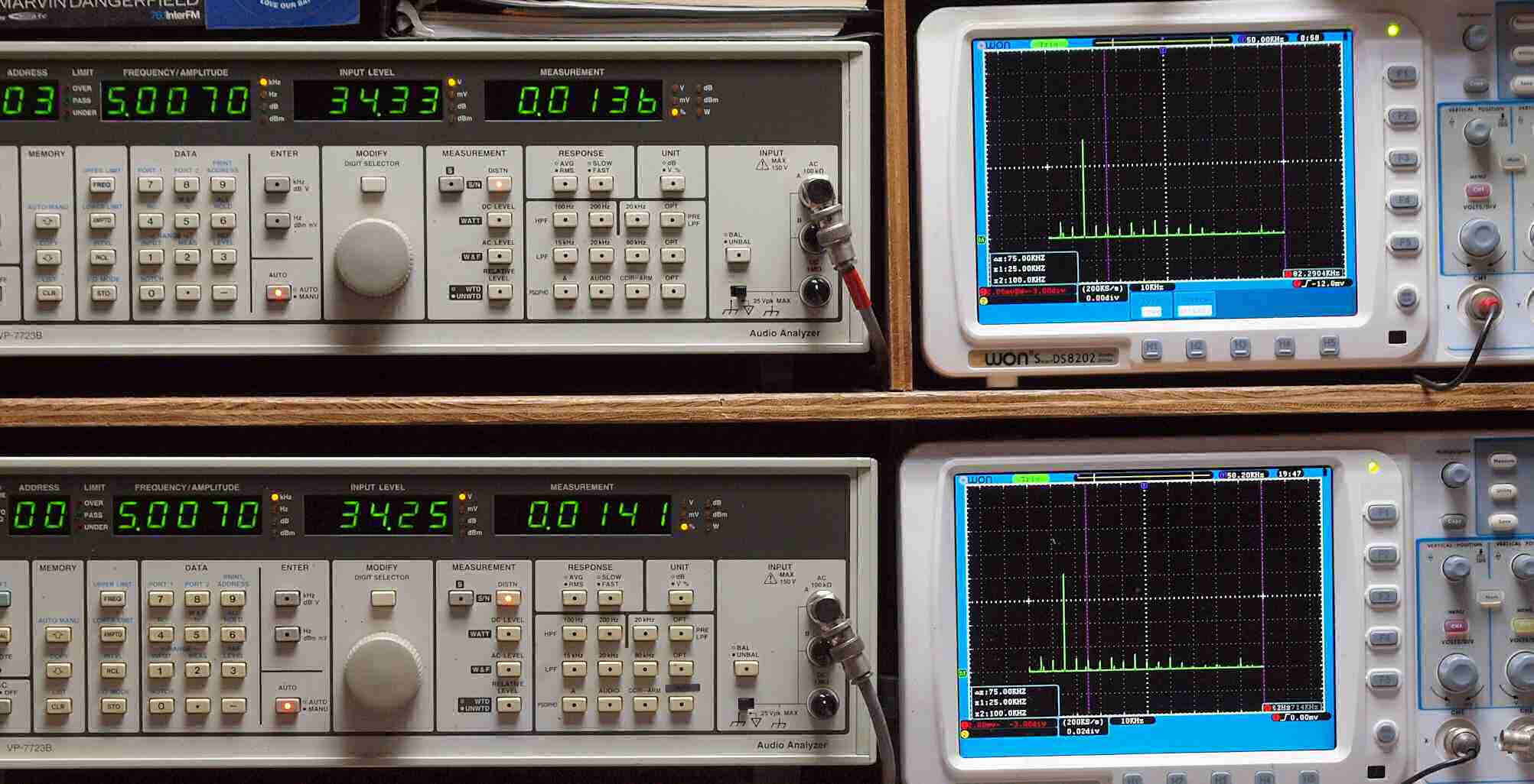 | E. 測定・調整 E1. 出力・歪み率測定・調整 「見方」。 上段中 右側SP出力を「Audio Analyzer Panasonic VP−7723B」により測定。 表示LED、 左端=メモリーNo、 中左=周波数測定、 中右=出力電圧測定、 右端=歪み率測定。 上段右端 VP−7723Bの基本波除去出力を「owon SDS8202(200MHZ)」で「FFT分析」表示。 下段中 左側SP出力を「Audio Analyzer Panasonic VP−7723B」により測定。 表示LED、 左端=メモリーNo、 中左=周波数測定、 中右=出力電圧測定、 右端=歪み率測定。 下段右端 VP−7723Bの基本波除去出力を「owon SDS6062(200MHZ)」で「FFT分析」表示。 下段左端 オーディオ発振器 VP−7201A より50Hz〜100kHzの信号を出し(歪み率=約0.003%)、ATT+分配器を通し、AMPに入力。 よって、ダイアル設定出力レベルより低くなります。測定機器の仕様や整備の様子はこちら、「VP−7723B」「VP−7201A」。 FFT画面の見方はこちら。 |