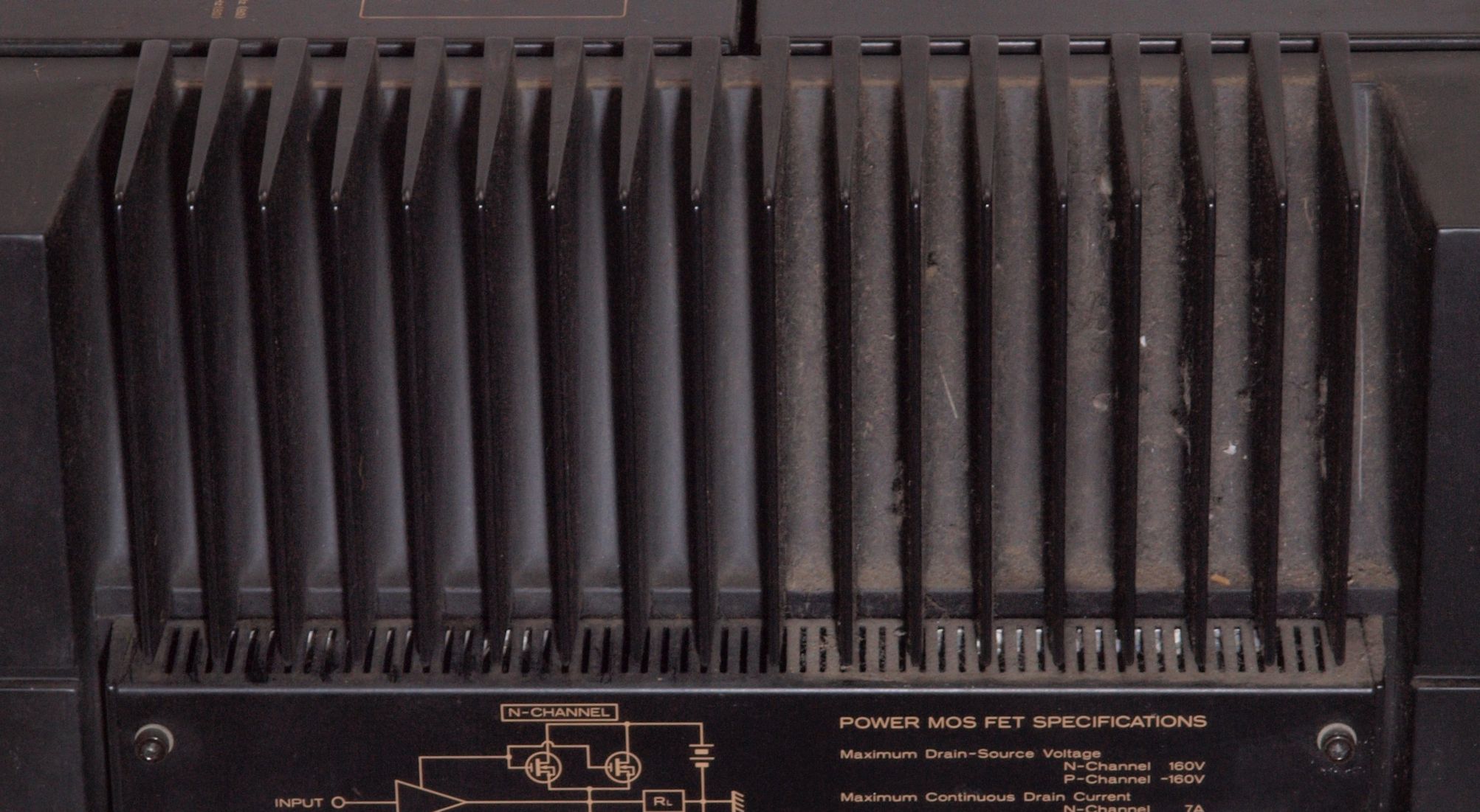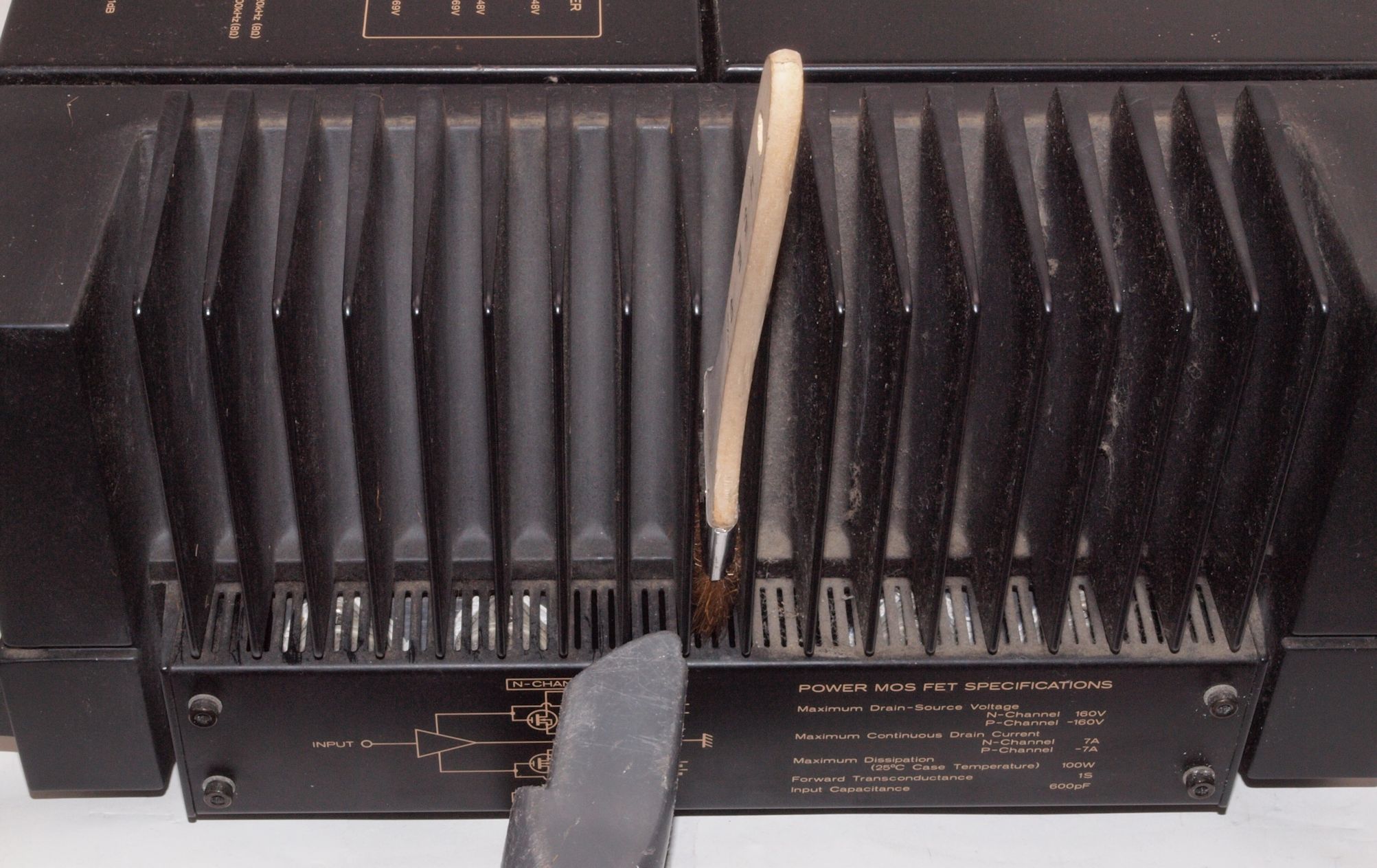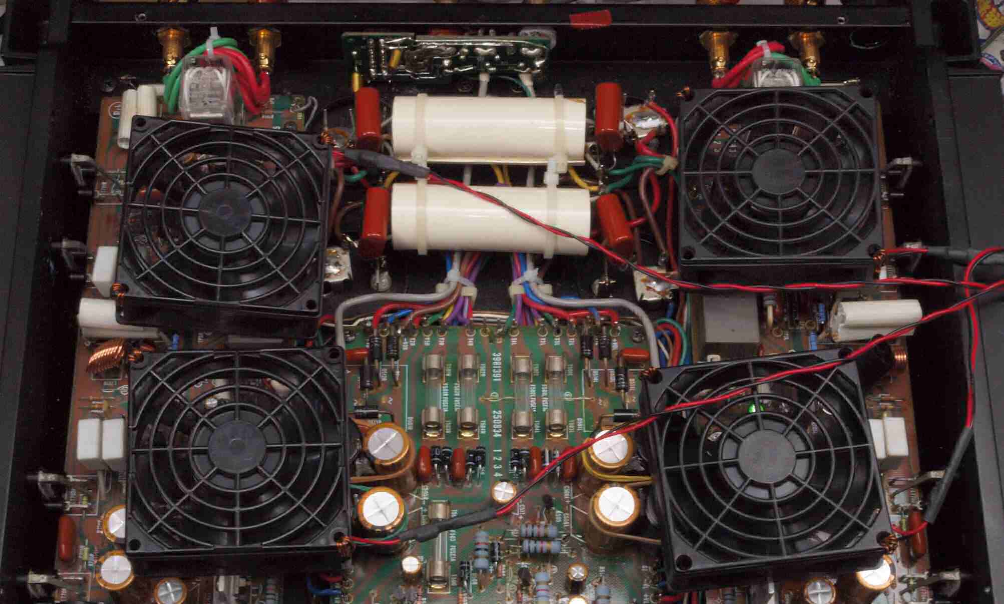| E3. フルパワーなので、24V高速フアンが全回転でクーリング。 終段FET(電界効果トランジスター)用電源には、さらにフイルムコンデンサー追加する。 |