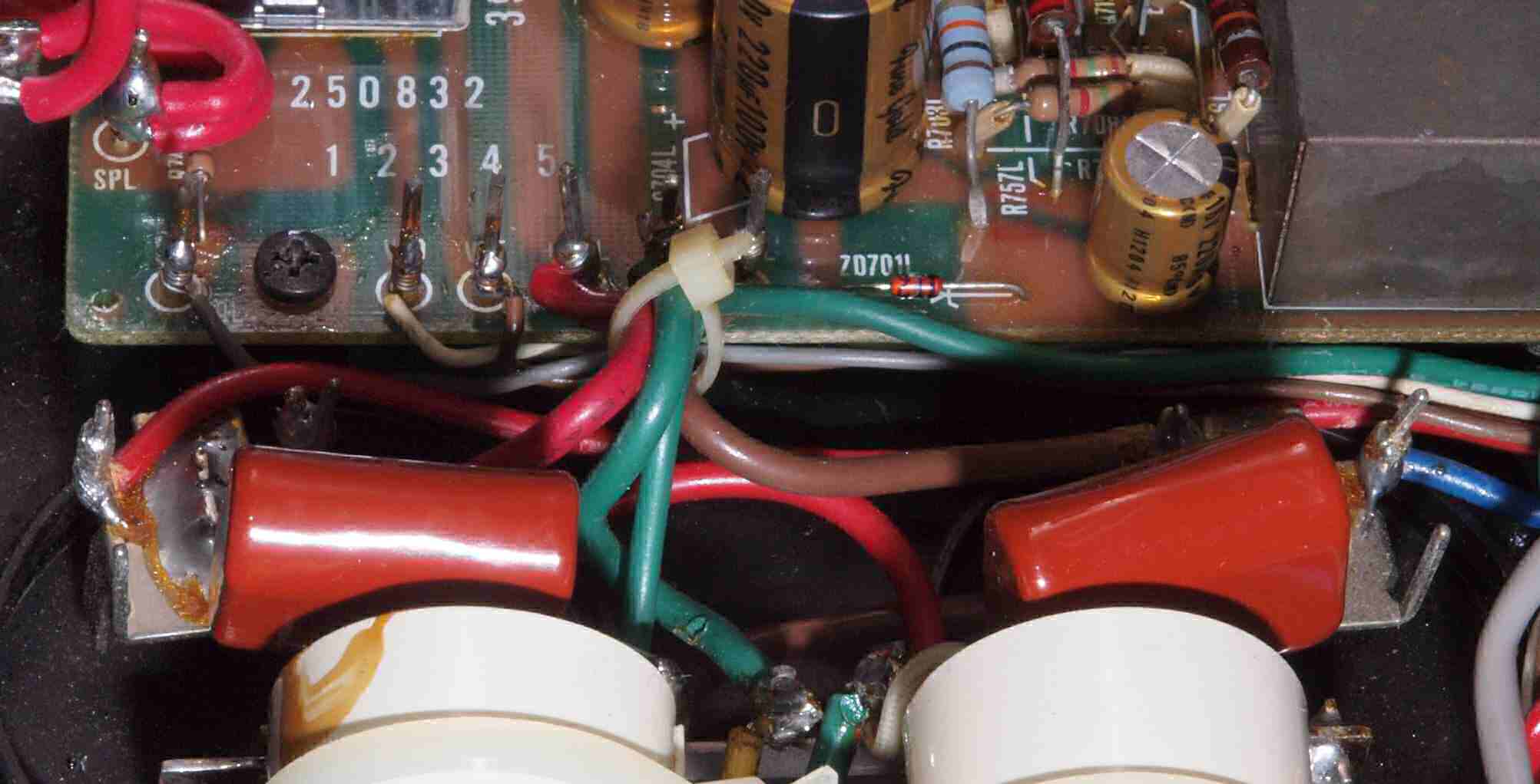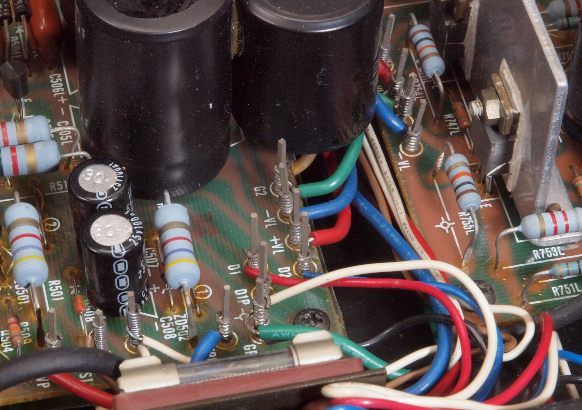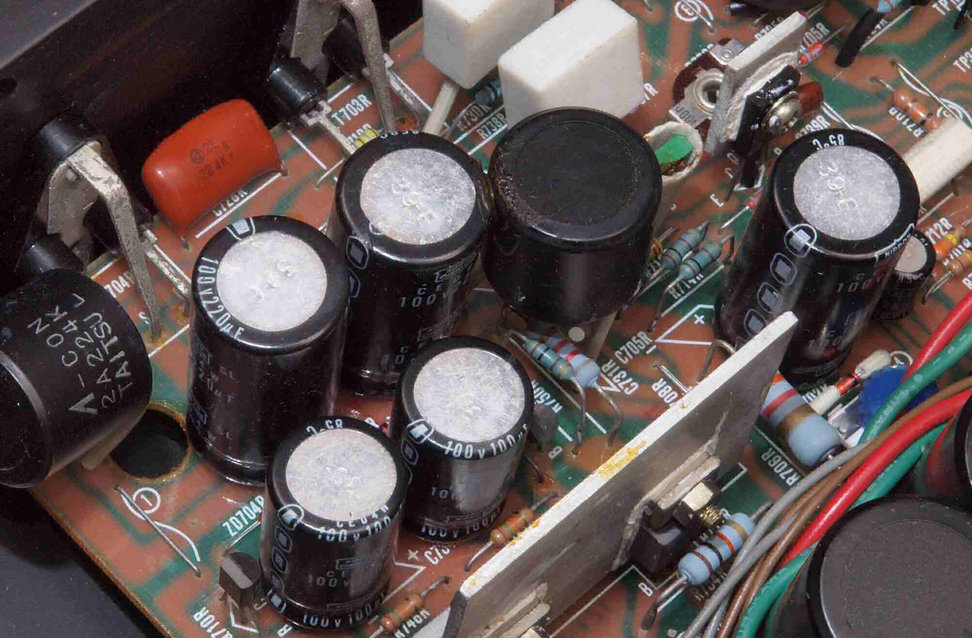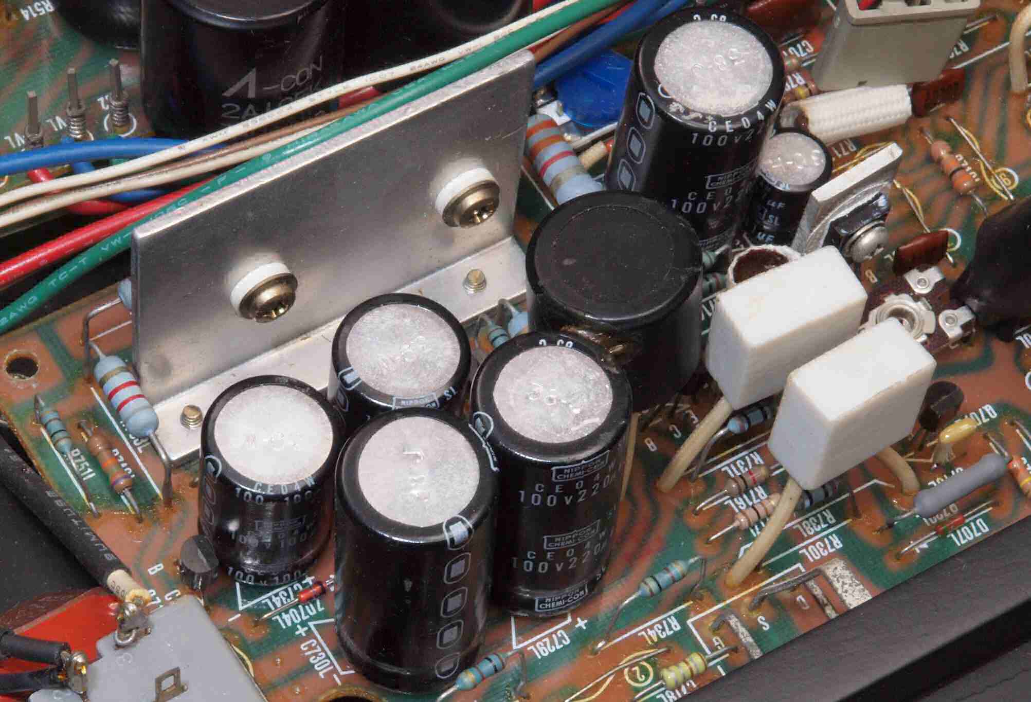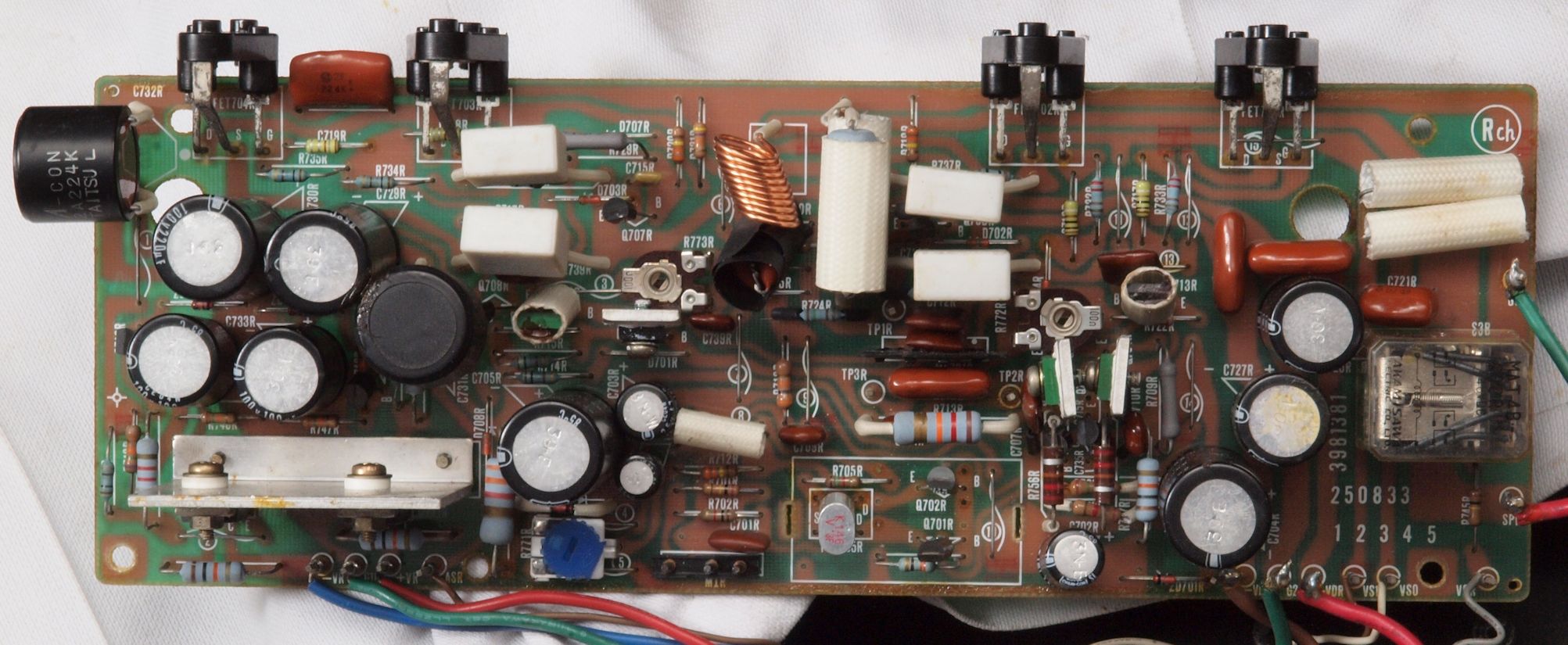| A32. 点検中 R側ドライブ基板の電解コンデンサー、頭のビニールの剥けは少ない。 |