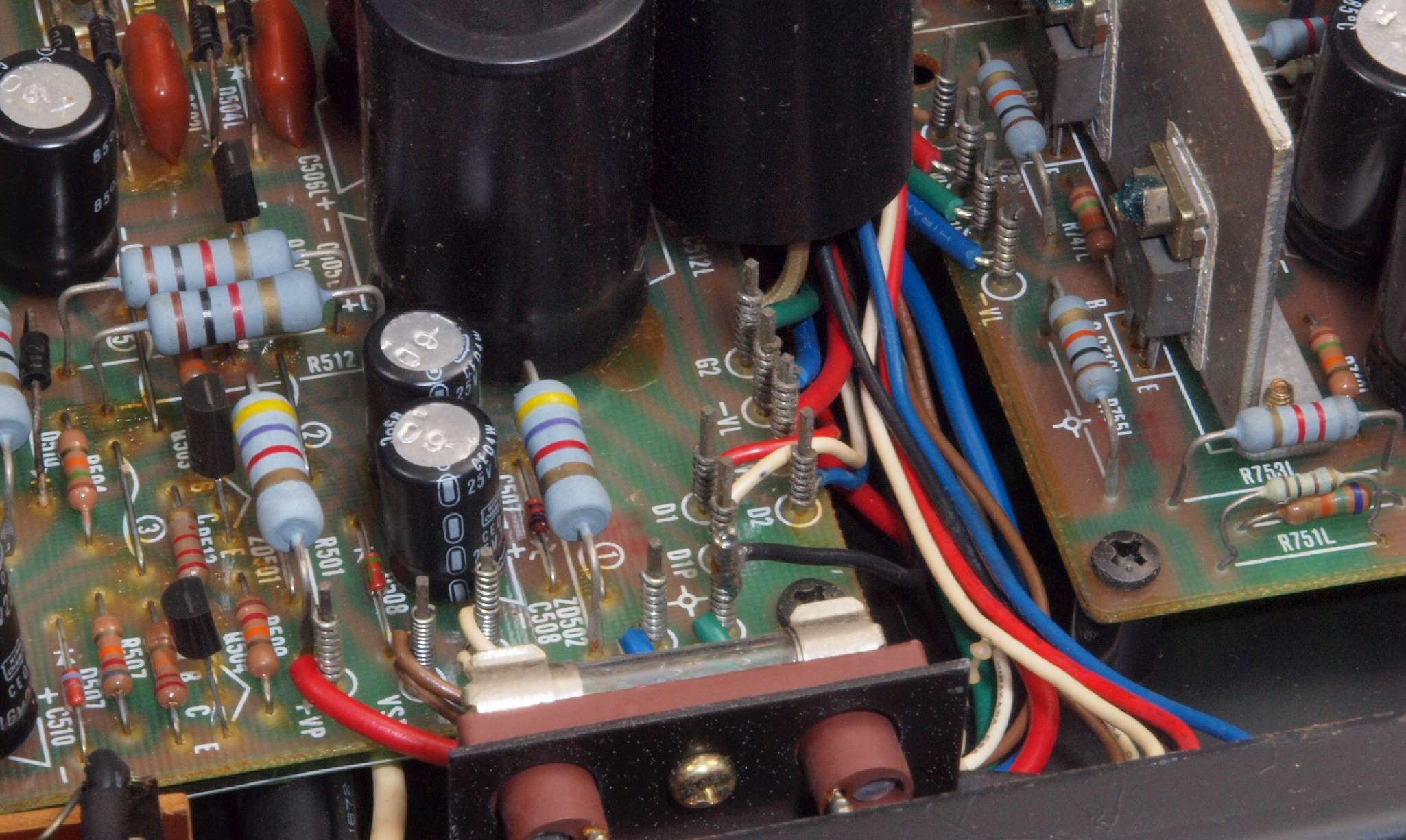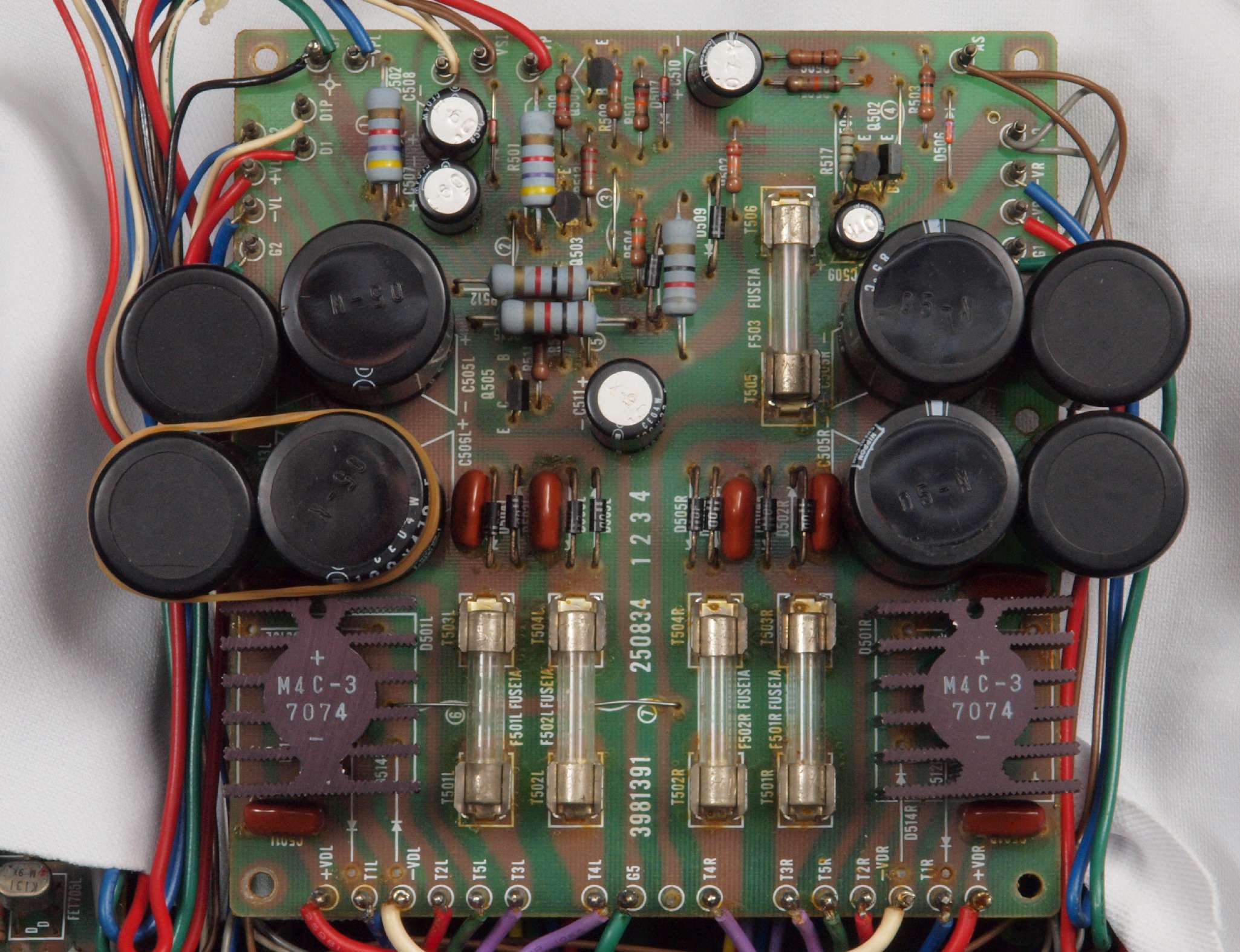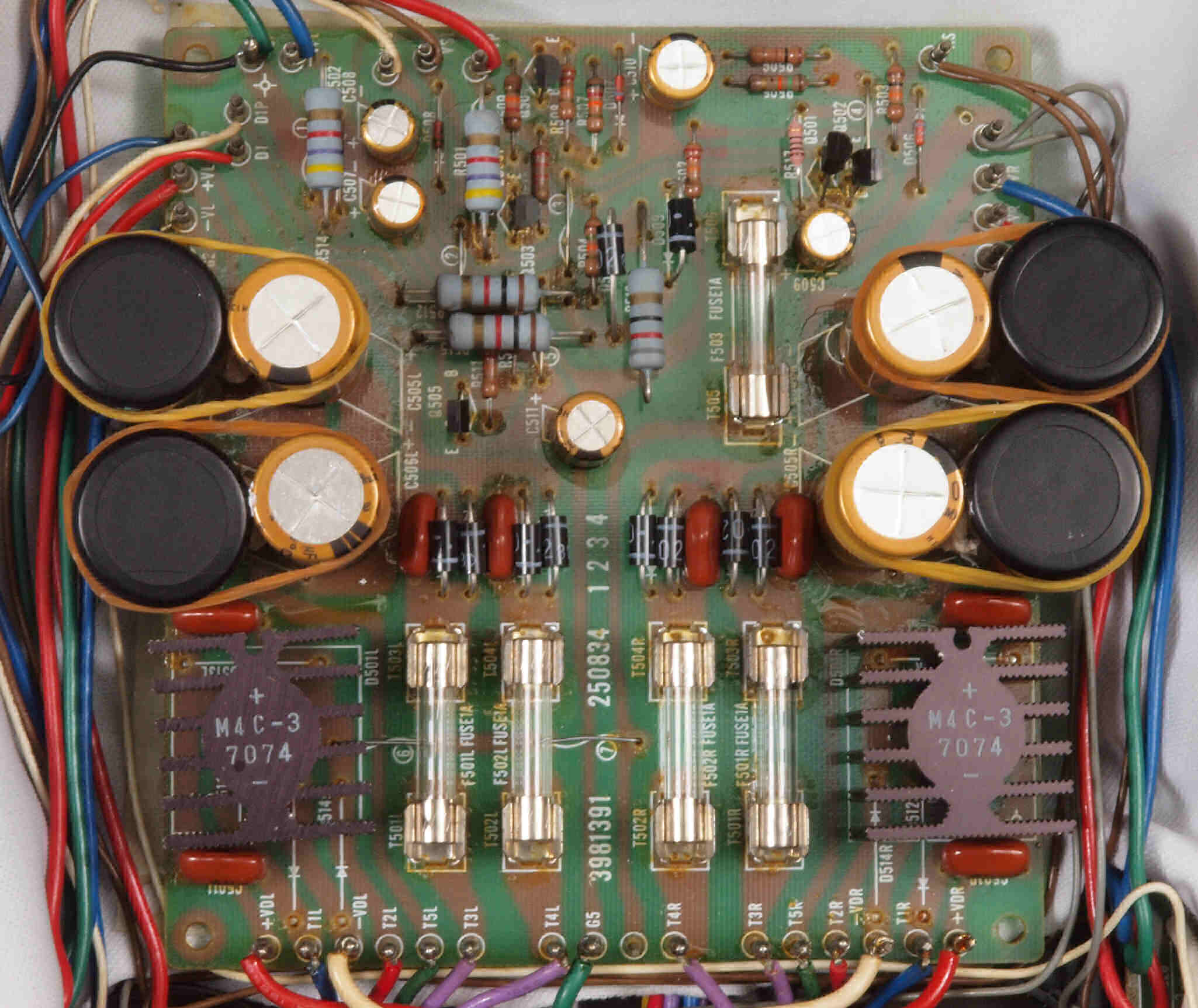 | C22. 修理後 L側ドライブ基板。 初段FET、バランス/バイアス調整用半固定VR3個、SP接続リレー交換 ヒューズ入り抵抗全部、電解コンデンサー11個、足黒TR(トランジスター)1個交換。 |