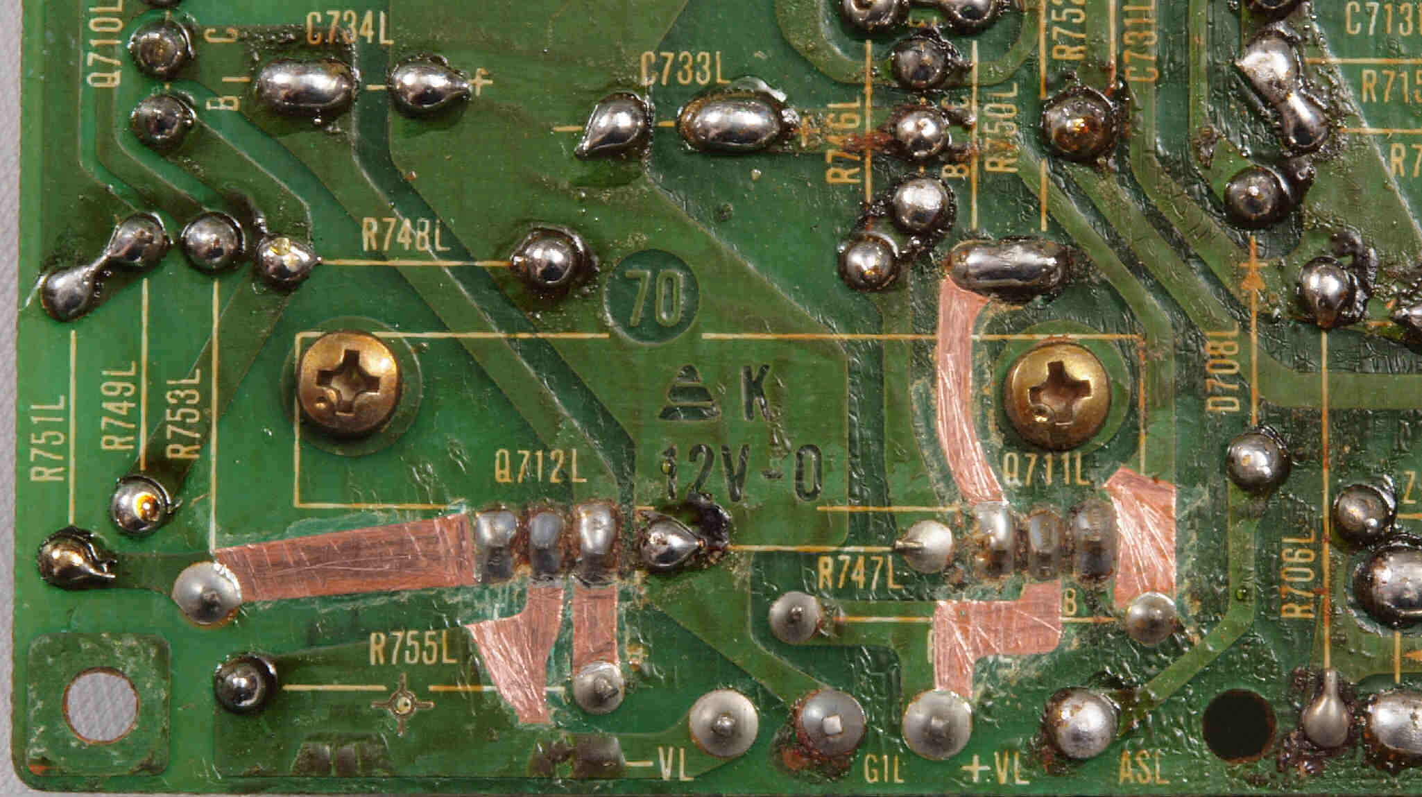 | C24. 修理中 L側ドライブ基板裏 定電圧TR(トランジスター)の足の銅箔を広げる。 |