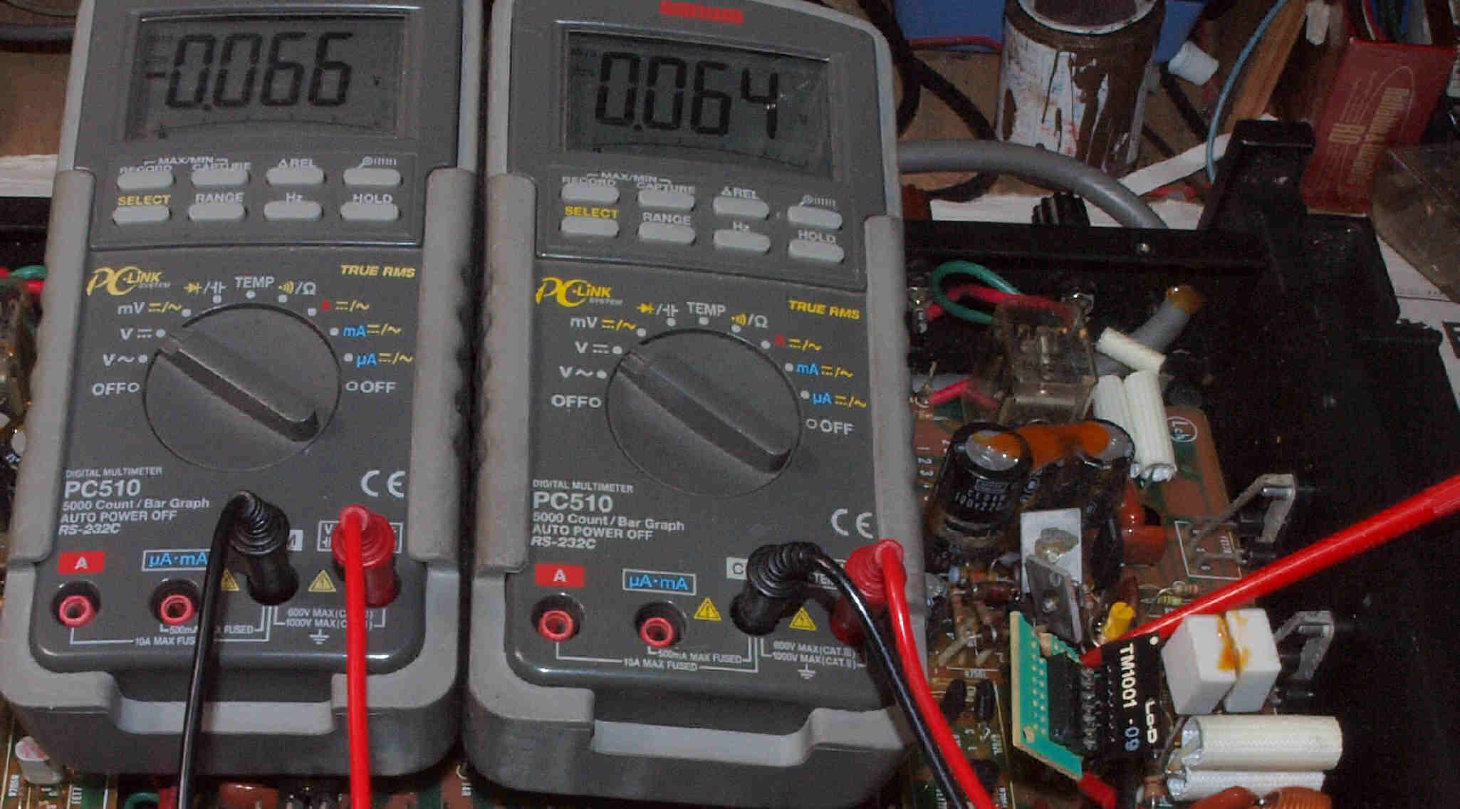 | A42. 点検中 電解コンデンサー外観比較、220μ/100V |