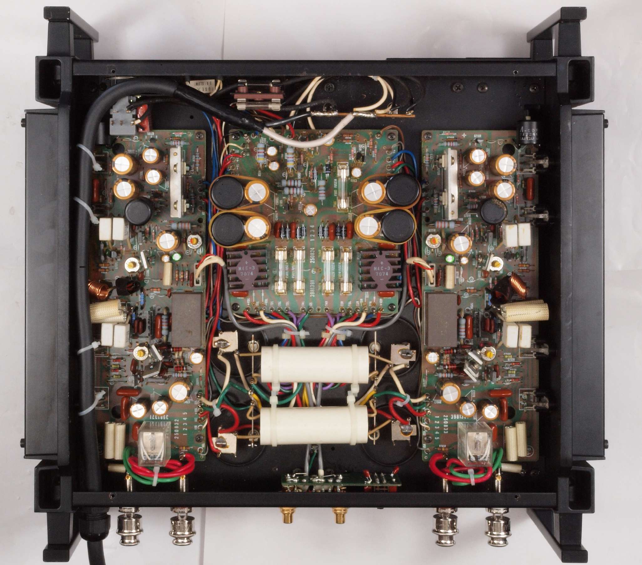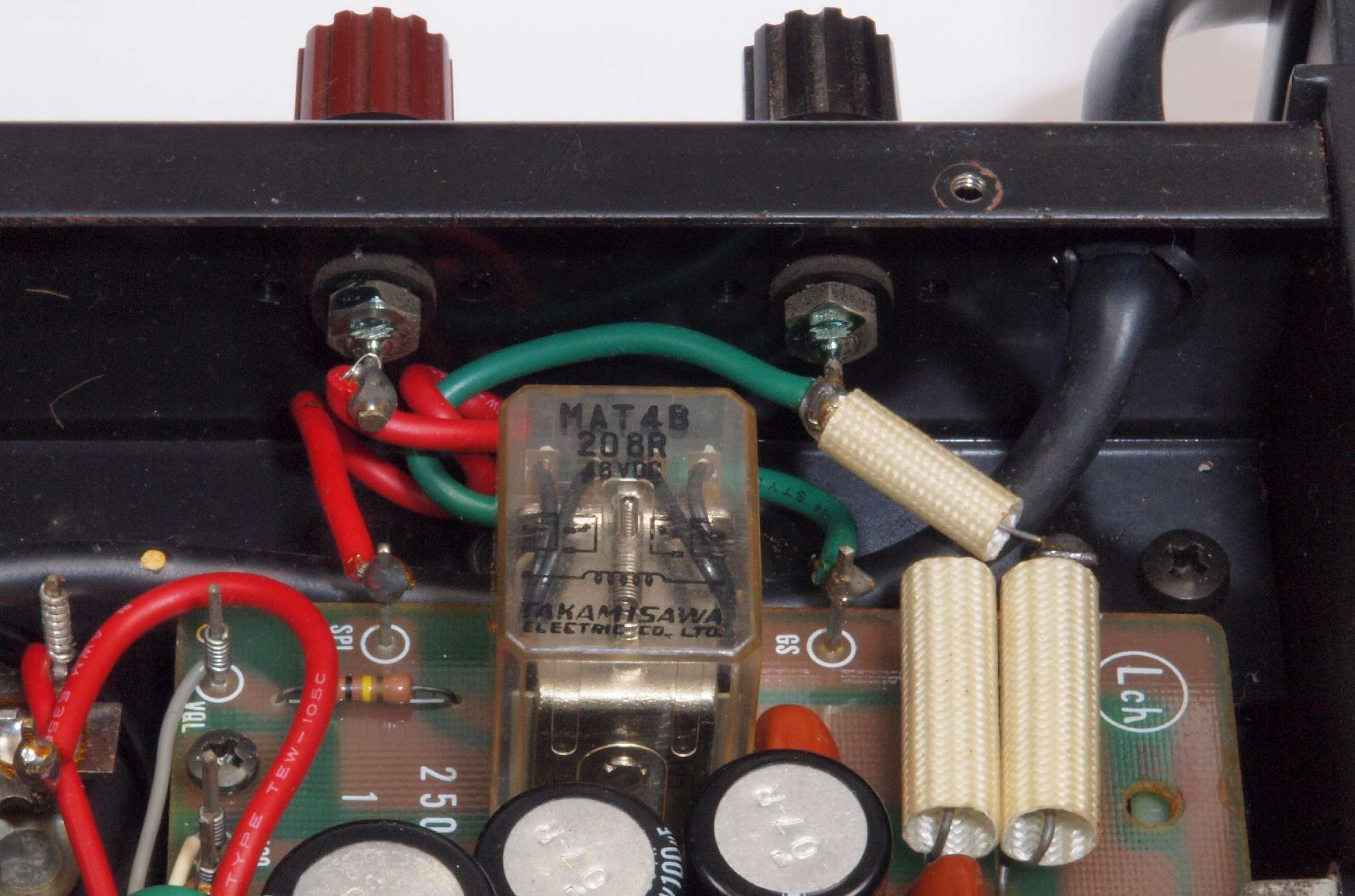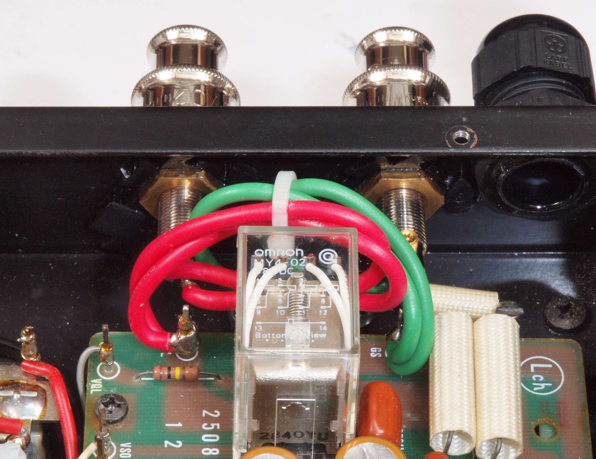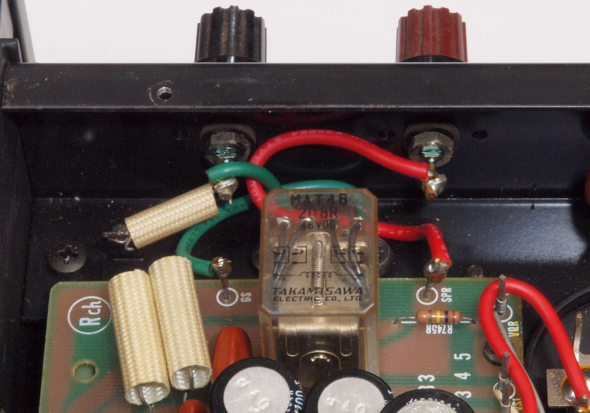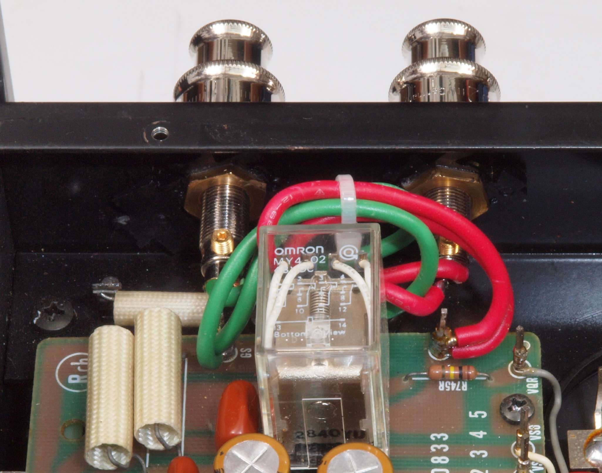 | C66. 修理後 入力RCA端子基板。 フイルムコンデンサー2個交換。 |