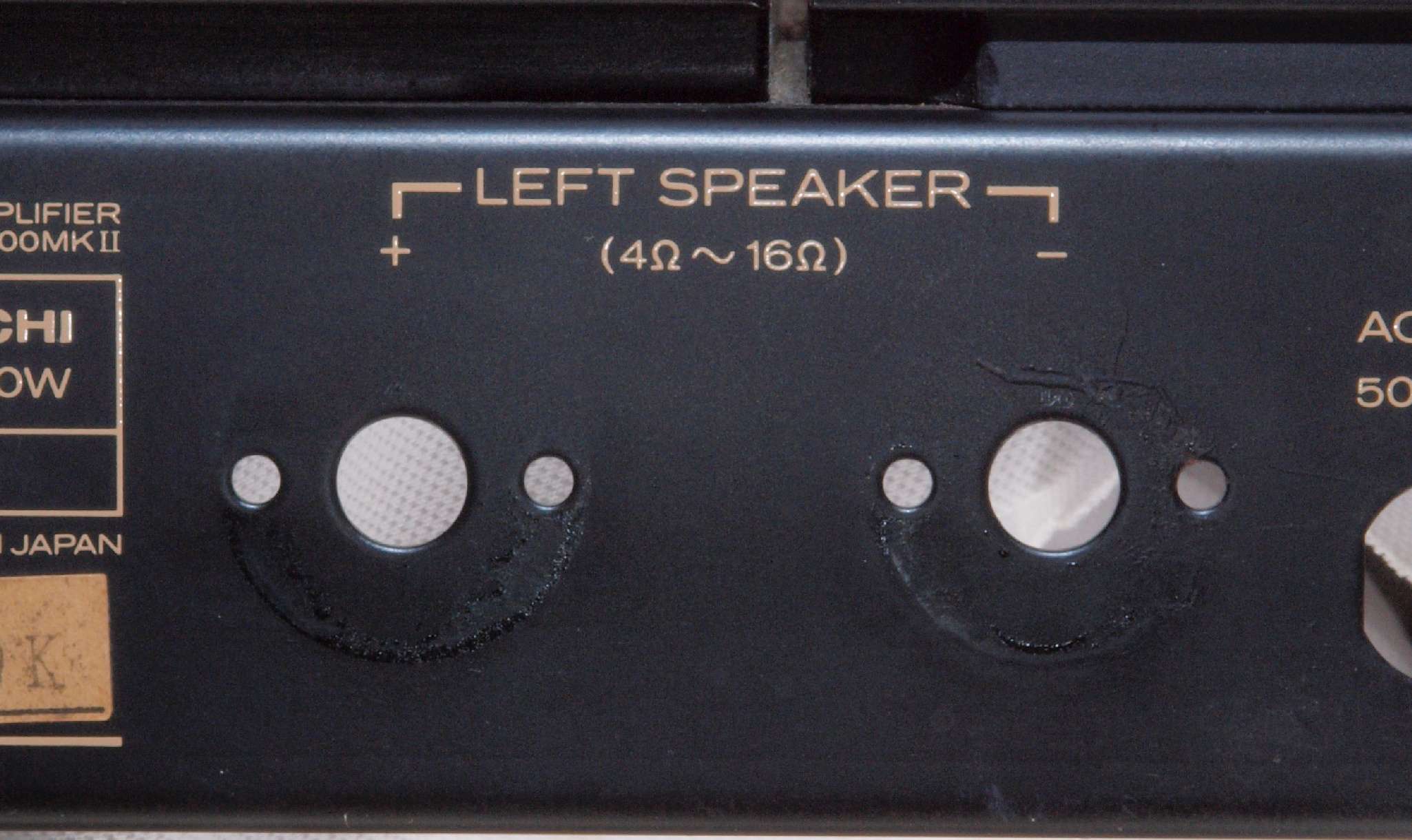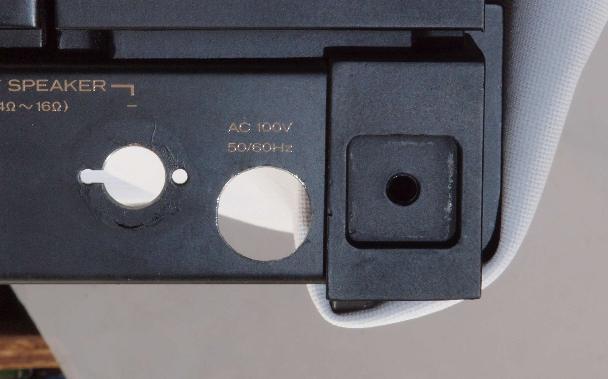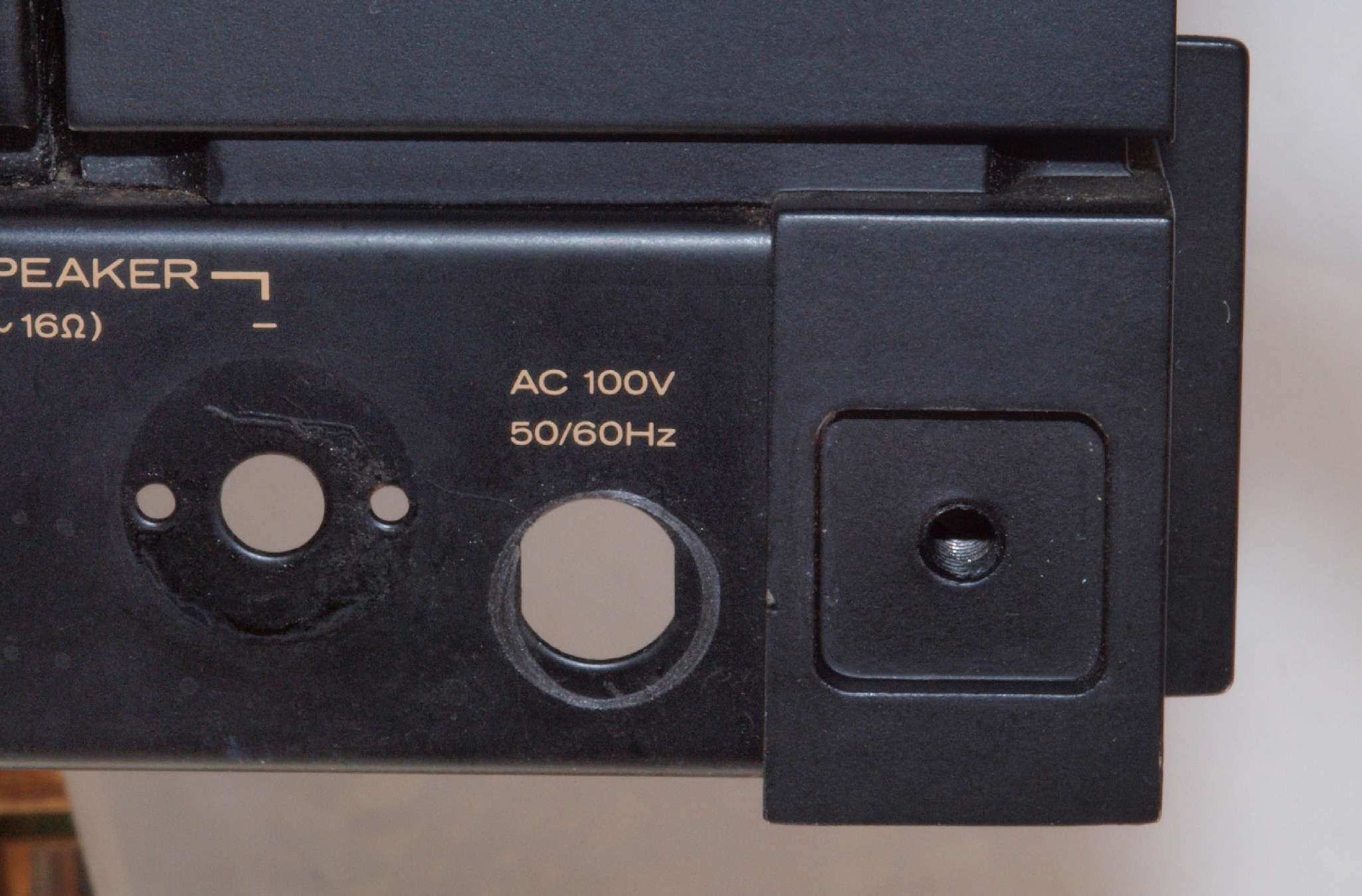 | C92. 修理中 電源ケーブル取り付け部穴加工前。 SP接続端子との距離を取る為に、下右方向へ広げる為、昔ながらのヤスリで削る。 |