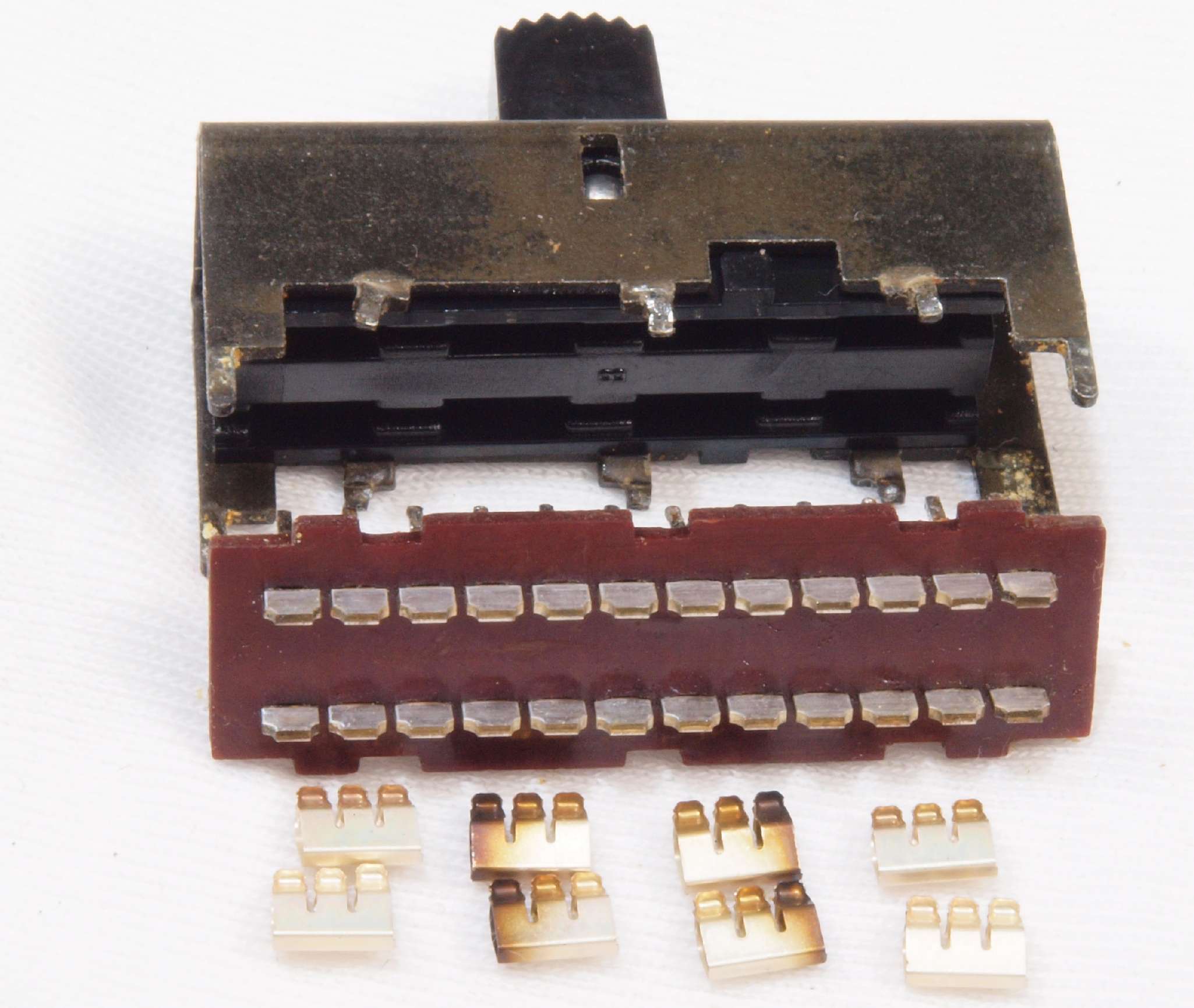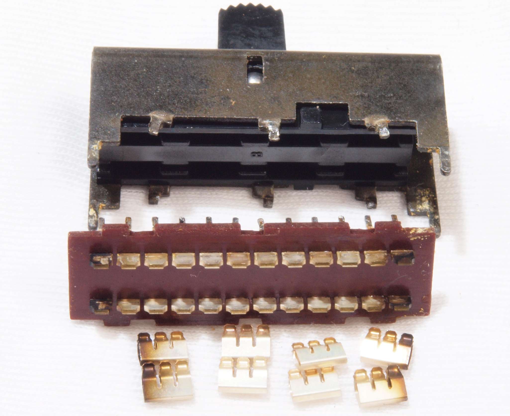 | C6C. 修理中 RCA端子基板の切り換えSW分解。端子を洗浄する。 使用するのは端の1回路のみ、内側の綺麗な接触子と交換して組む。 |