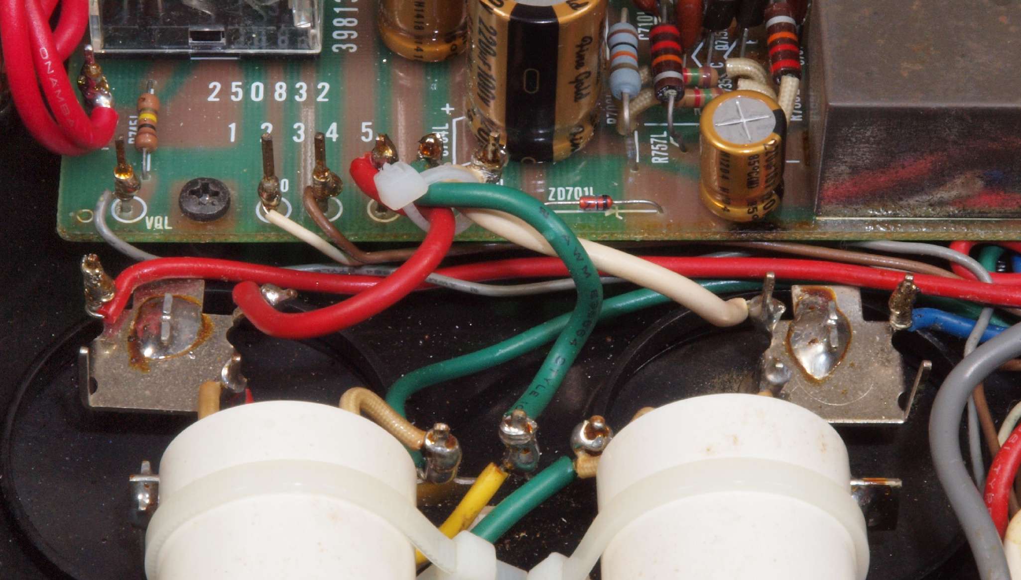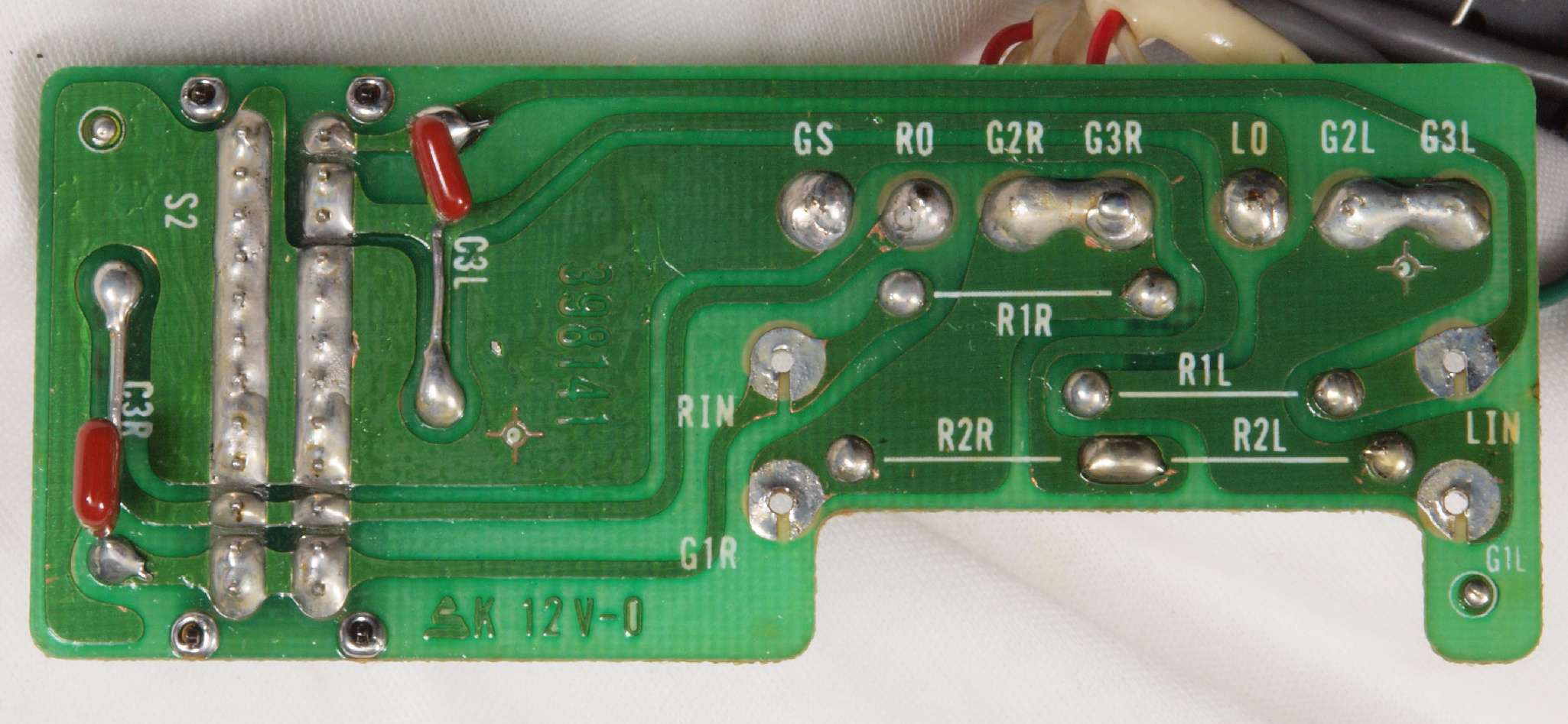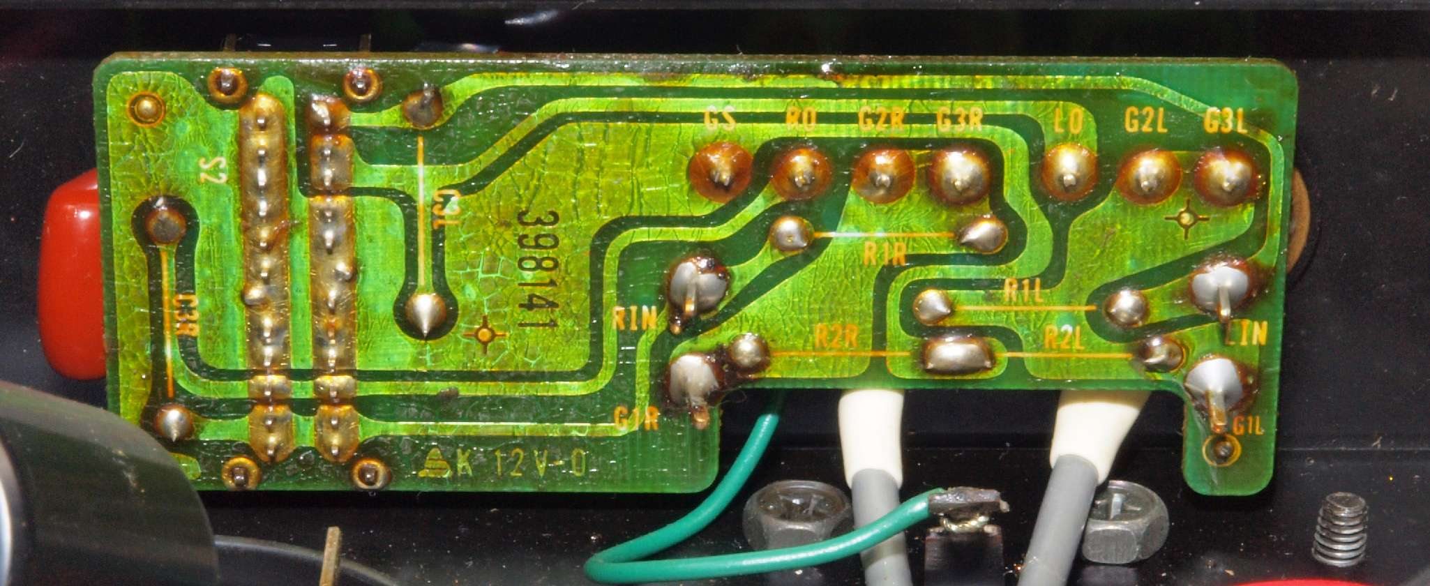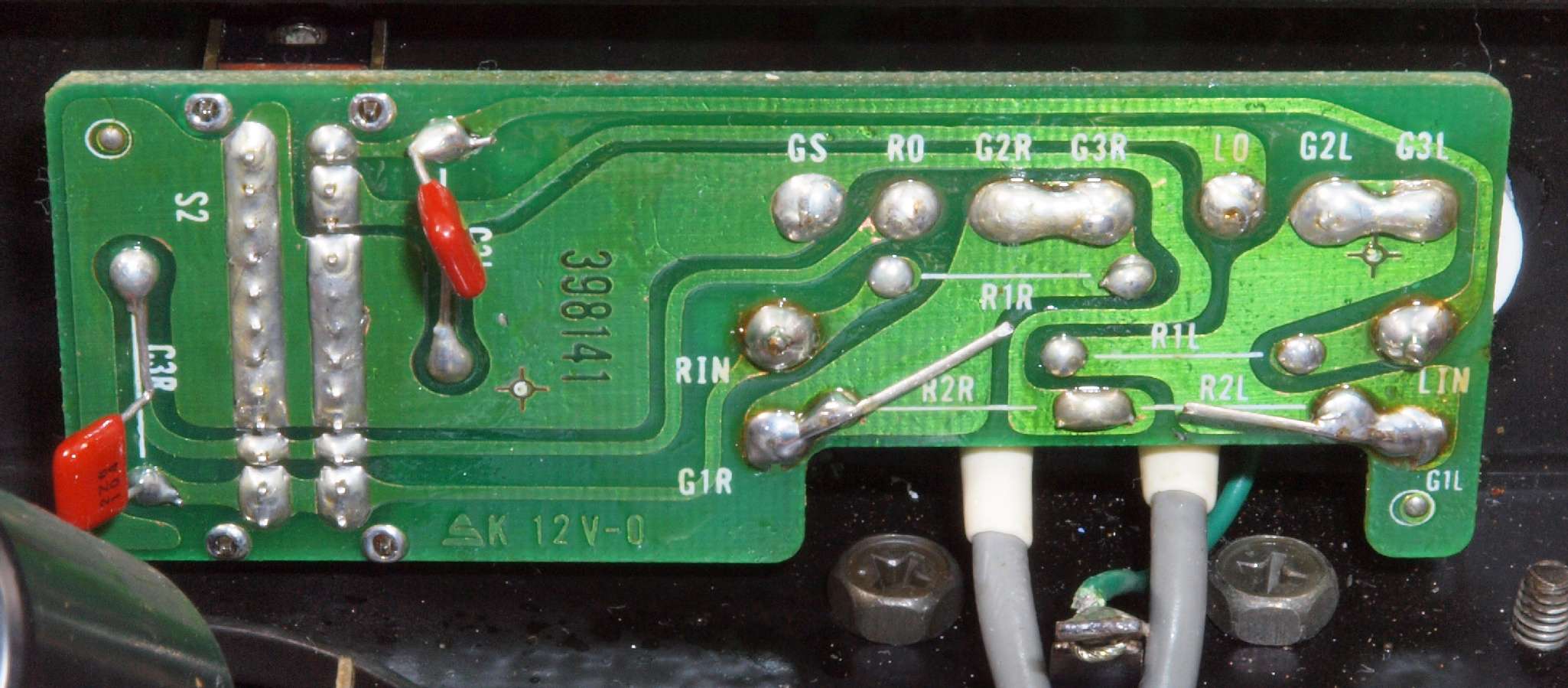 | C69. 修理(半田補正)後 RCA端子基板裏 半田を全部やり直す フイルムコンデンサー2個増設 |