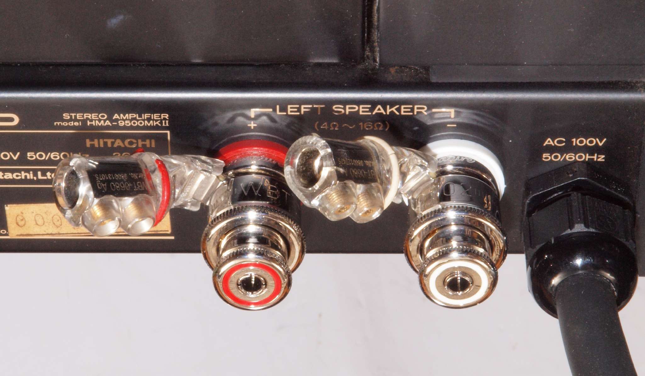 | C86. 修理後 L−SP端子裏配線。 WBTのネジ止めを生かし、ネジ止め接続+半田接続のW配線にした。理由はこちら |