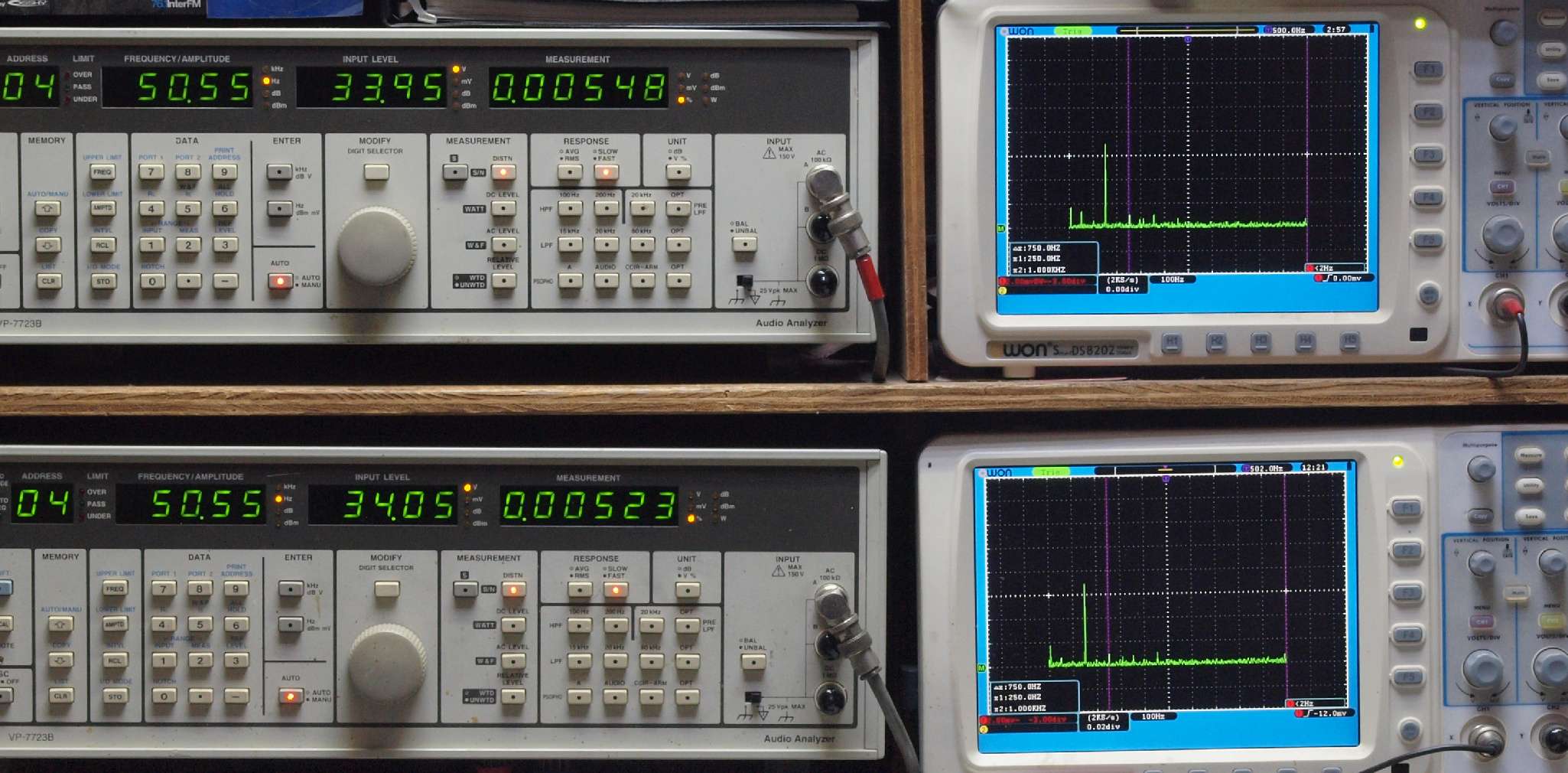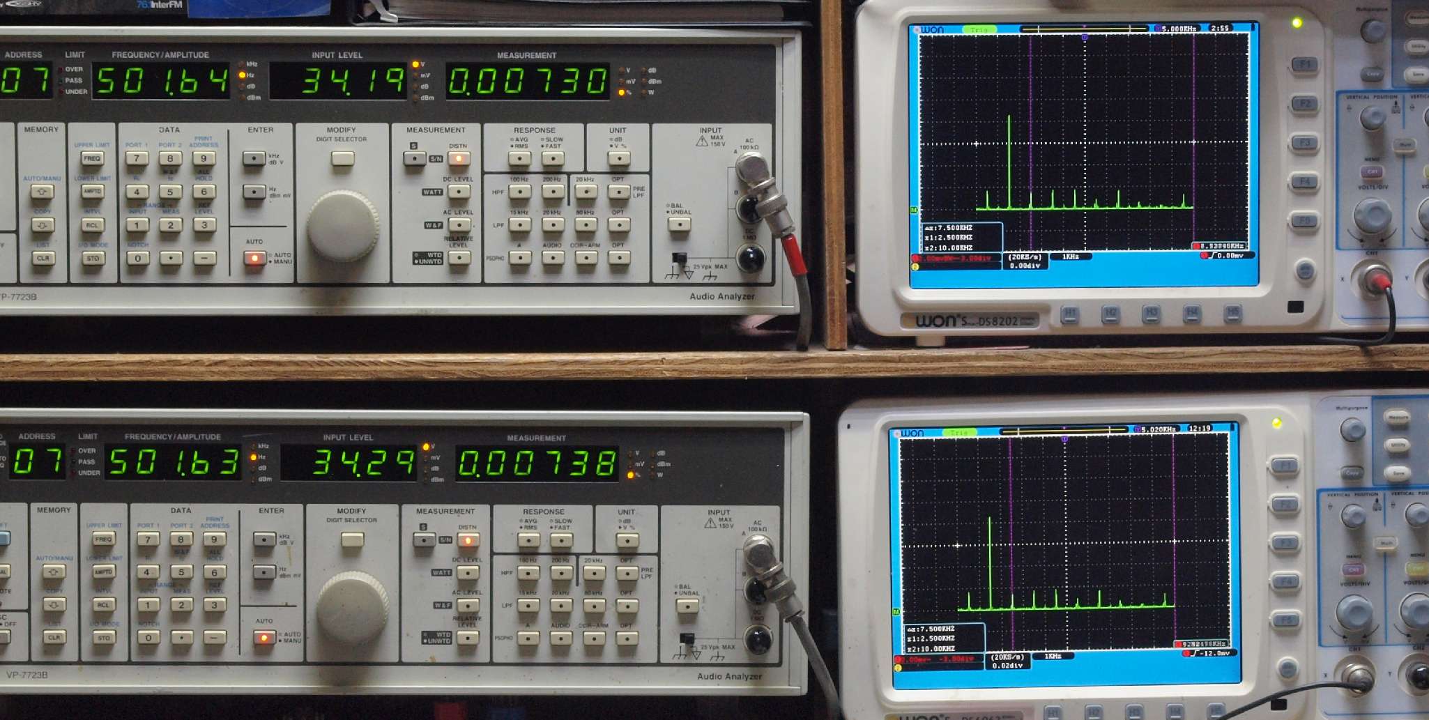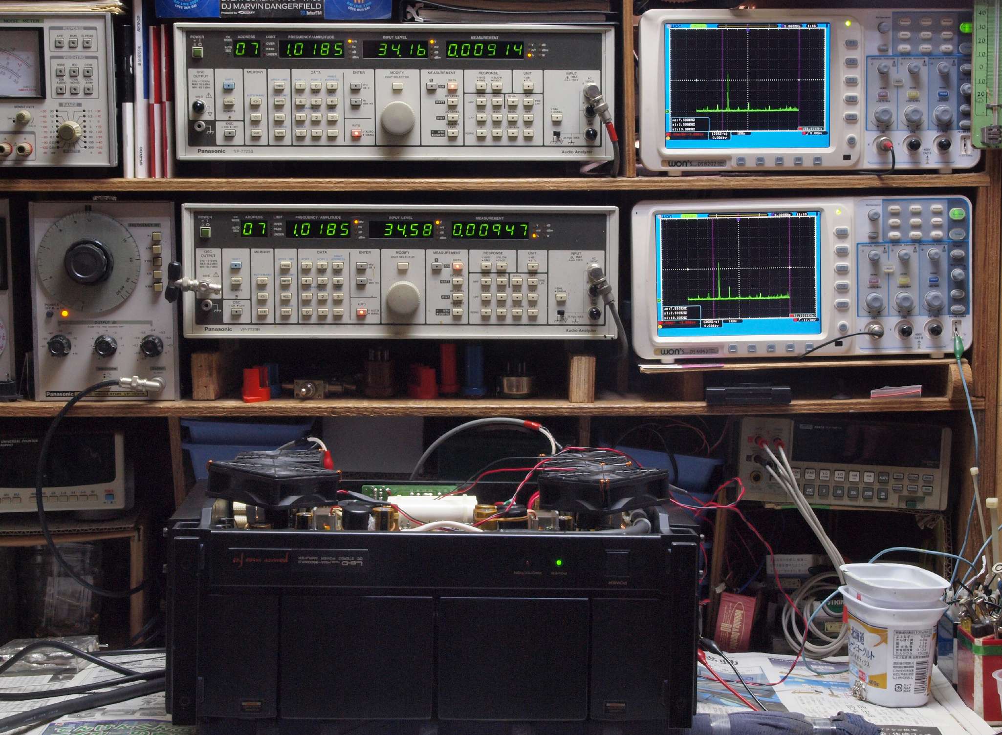 | E. 測定・調整。 画像をクリックすると、大きく(横幅2050ドット)表示されます。 E1. 出力・歪み率測定・調整 「見方」。 上段中 右側SP出力を「Audio Analyzer Panasonic VP−7723B」により測定。 表示LED、 左端=メモリーNo、 中左=周波数測定、 中右=出力電圧測定、 右端=歪み率測定。 上段右端 VP−7723Bの基本波除去出力を「owon SDS8202(200MHZ)」で「FFT分析」表示。 下段中 左側SP出力を「Audio Analyzer Panasonic VP−7723B」により測定。 表示LED、 左端=メモリーNo、 中左=周波数測定、 中右=出力電圧測定、 右端=歪み率測定。 下段右端 VP−7723Bの基本波除去出力を「owon SDS6062(200MHZ)」で「FFT分析」表示。 下段左端 オーディオ発振器 VP−7201A より50Hz〜100kHzの信号を出し(歪み率=約0.003%)、ATT+分配器を通し、AMPに入力。 よって、ダイアル設定出力レベルより低くなります。測定機器の仕様や整備の様子はこちら、「VP−7723B」「VP−7201A」。 FFT画面の見方はこちら。 |