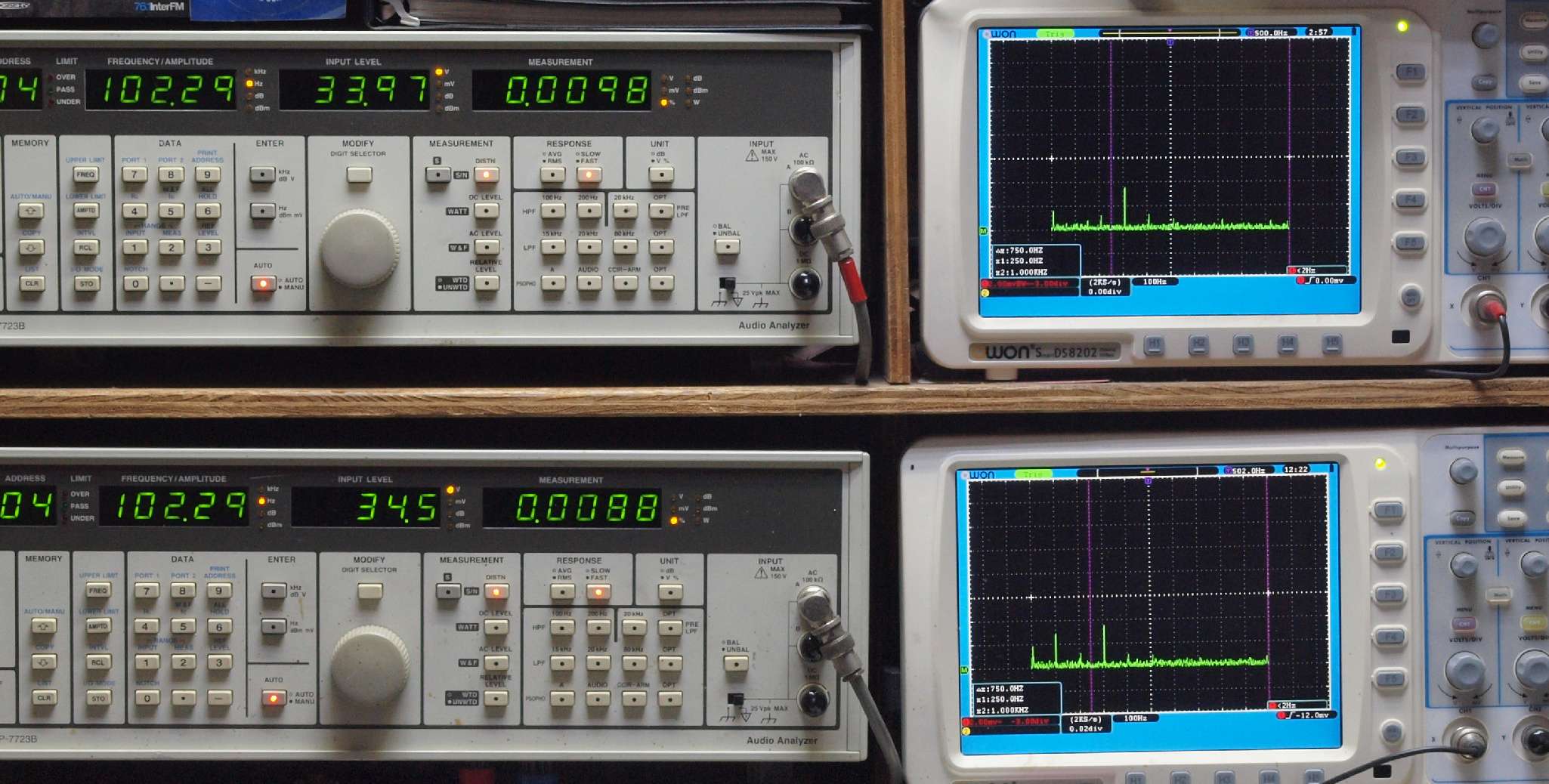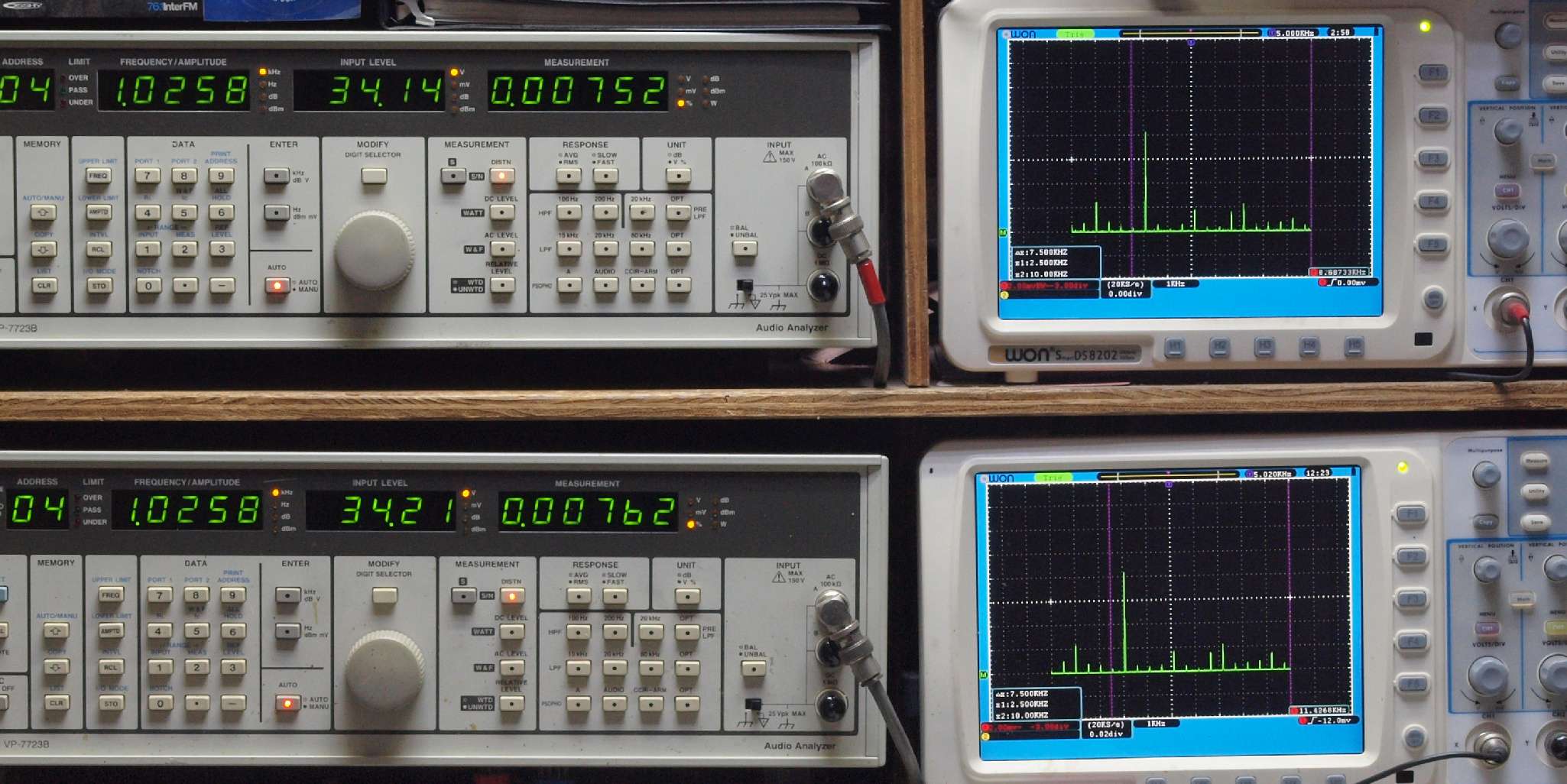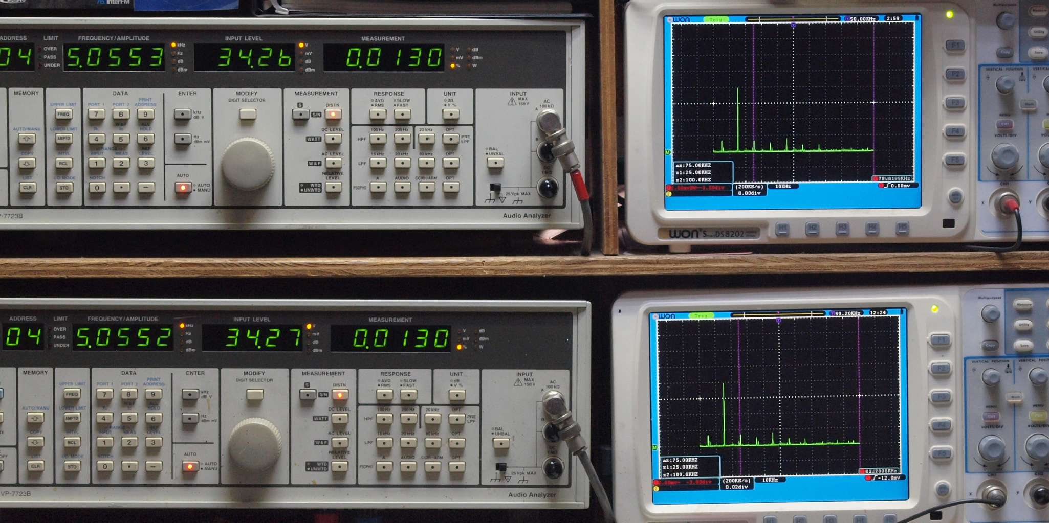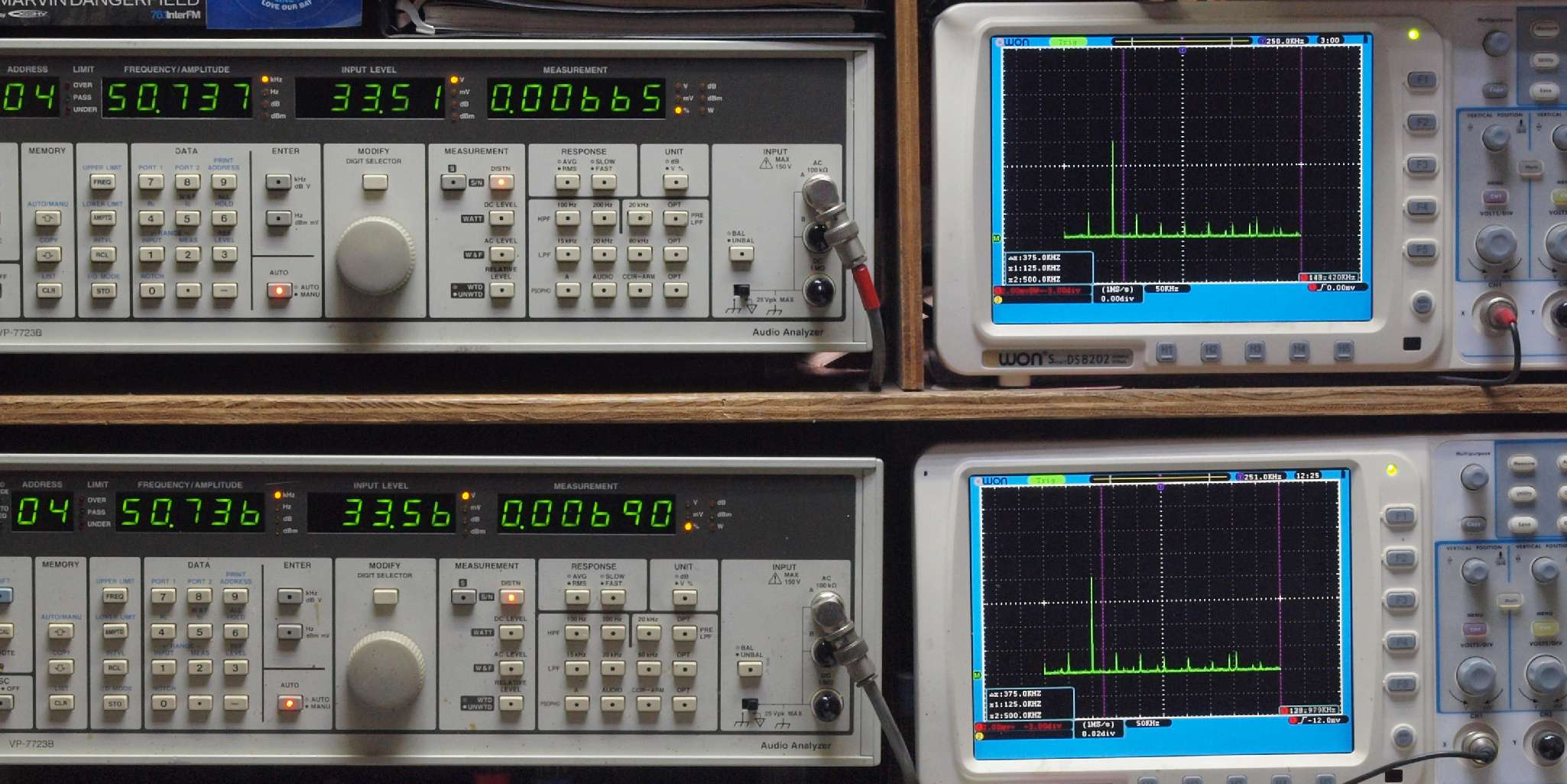 | E. 測定・調整。 画像をクリックすると、大きく(横幅2050ドット)表示されます。 E1. 出力・歪み率測定・調整 「見方」。 上段中 右側SP出力を「Audio Analyzer Panasonic VP−7723B」により測定。 表示LED、 左端=メモリーNo、 中左=周波数測定、 中右=出力電圧測定、 右端=歪み率測定。 上段右端 VP−7723Bの基本波除去出力を「owon SDS8202(200MHZ)」で「FFT分析」表示。 下段中 左側SP出力を「Audio Analyzer Panasonic VP−7723B」により測定。 表示LED、 左端=メモリーNo、 中左=周波数測定、 中右=出力電圧測定、 右端=歪み率測定。 下段右端 VP−7723Bの基本波除去出力を「owon SDS6062(200MHZ)」で「FFT分析」表示。 下段左端 オーディオ発振器 VP−7201A より50Hz〜100kHzの信号を出し(歪み率=約0.003%)、ATT+分配器を通し、AMPに入力。 よって、ダイアル設定出力レベルより低くなります。測定機器の仕様や整備の様子はこちら、「VP−7723B」「VP−7201A」。 FFT画面の見方はこちら。 |