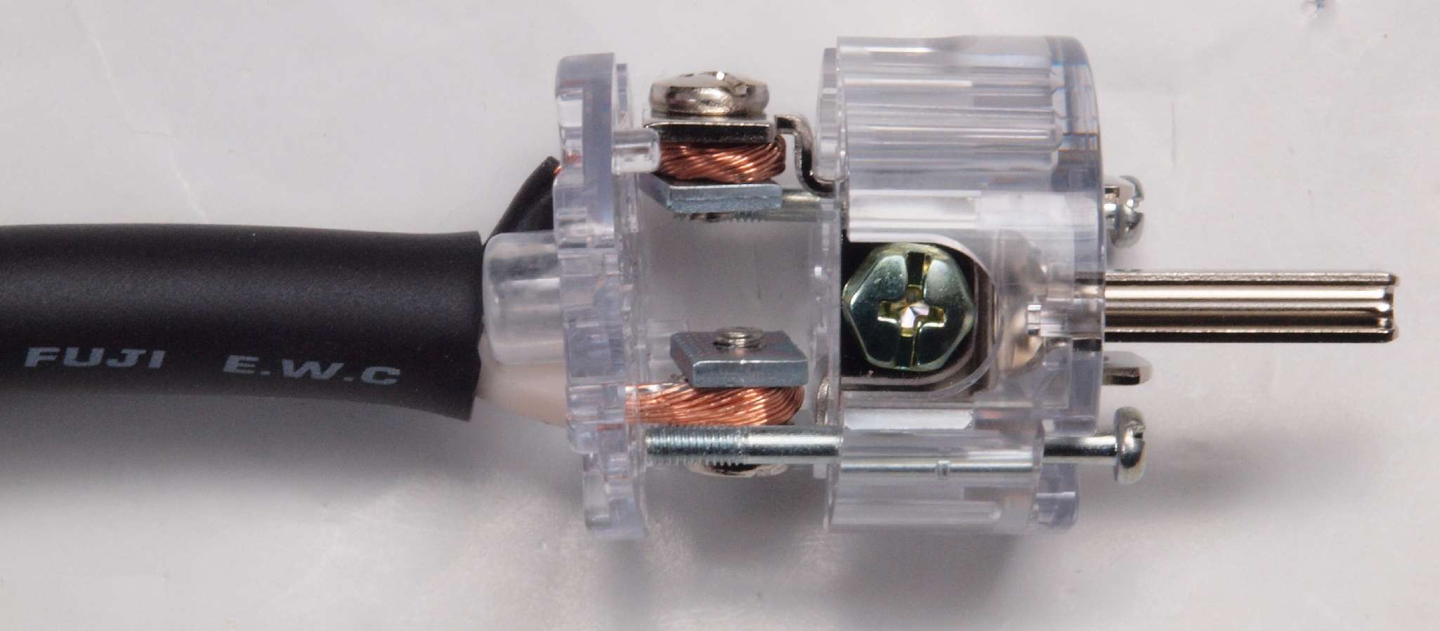 | C9D. 修理中 3Pプラグにケーブル取り付。差し込み固定が一般ですが、時計方向に巻き付けると良い、反対側。 上の白線=巻き付いた端側、 下のK線=挿入した側。 これで差し込み固定の3倍位接触面積が増し、接触抵抗が低くなる。 |