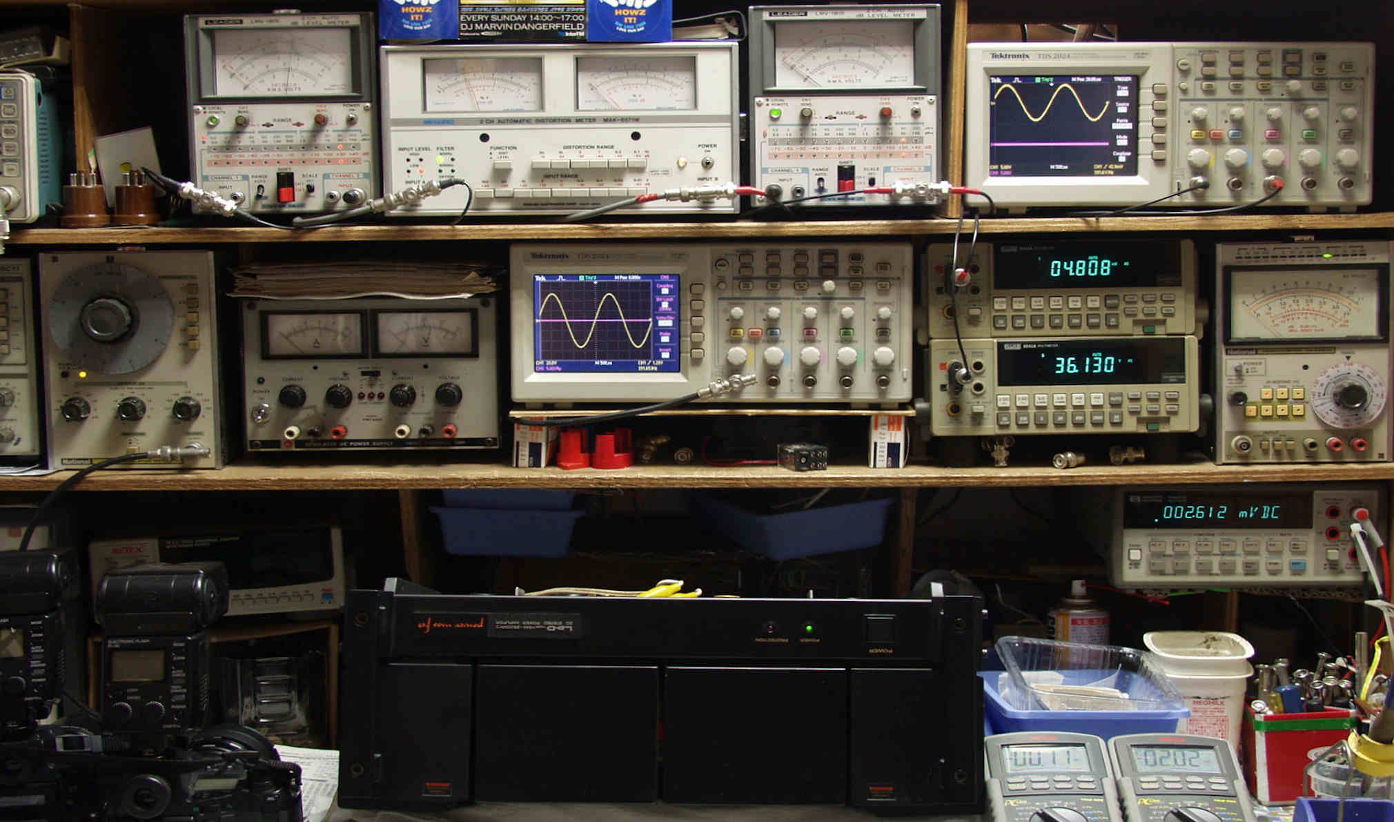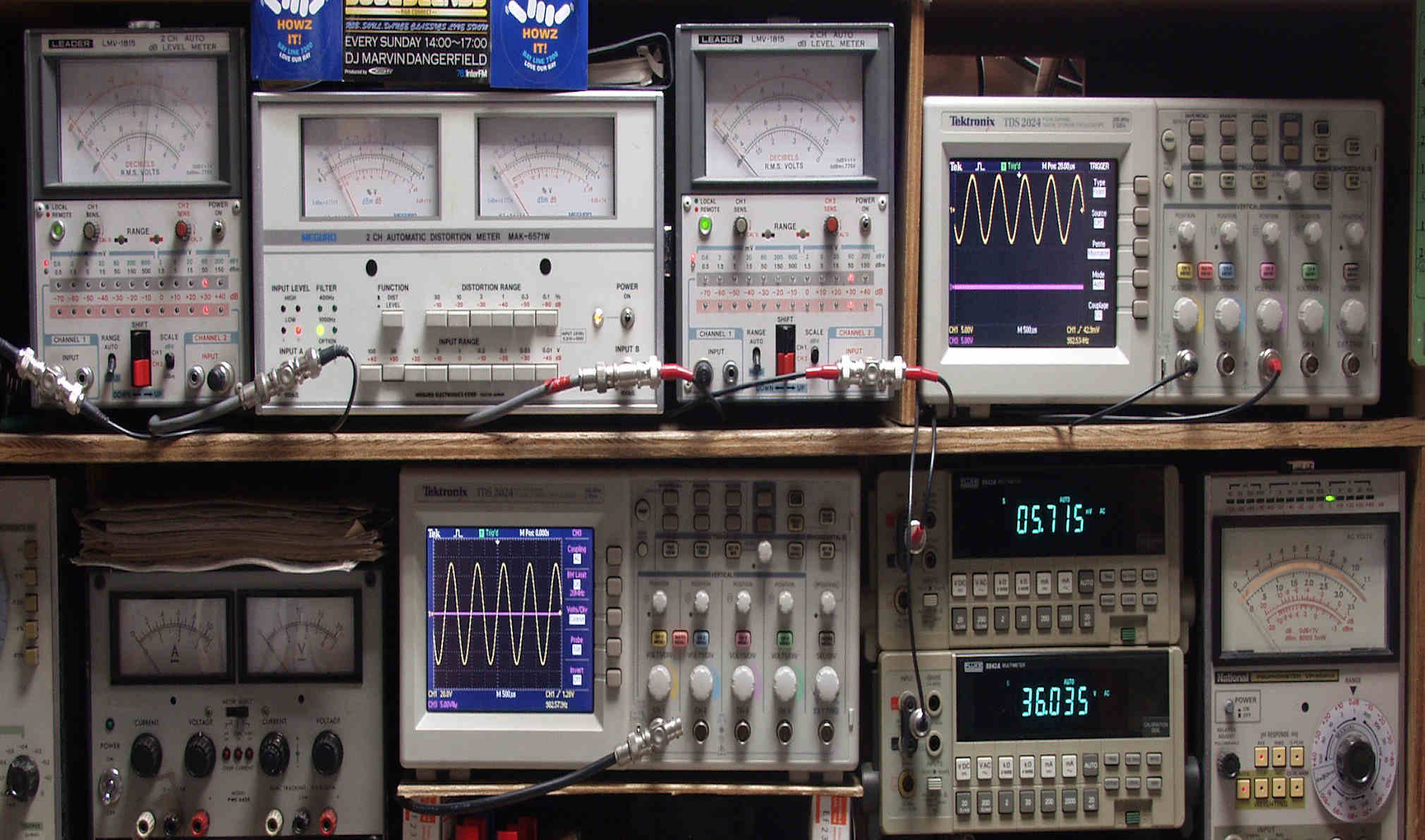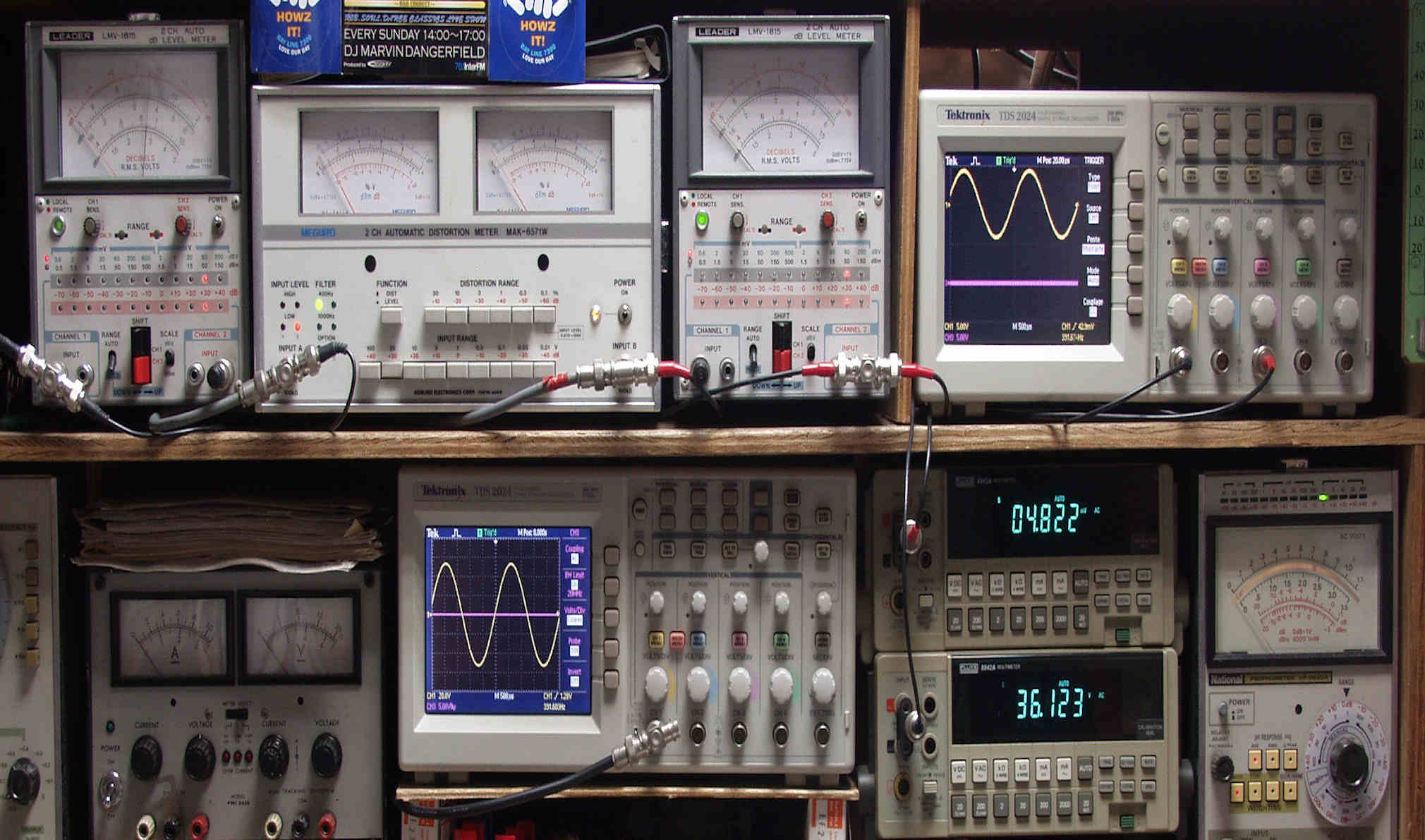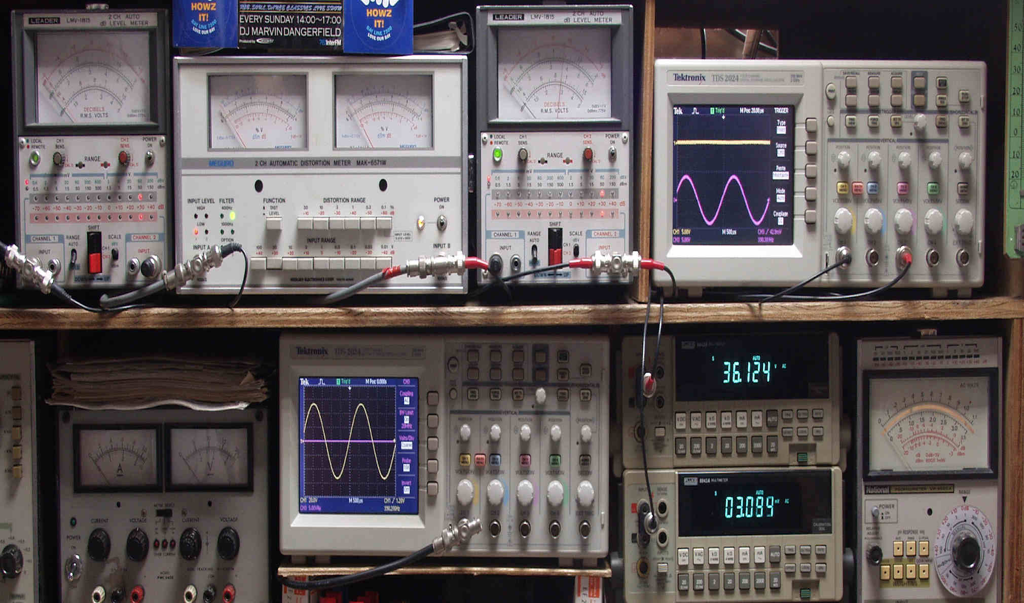 上段中左 歪み率計=出力の歪み率測定 左メータ=L出力、右メータ=R出力。