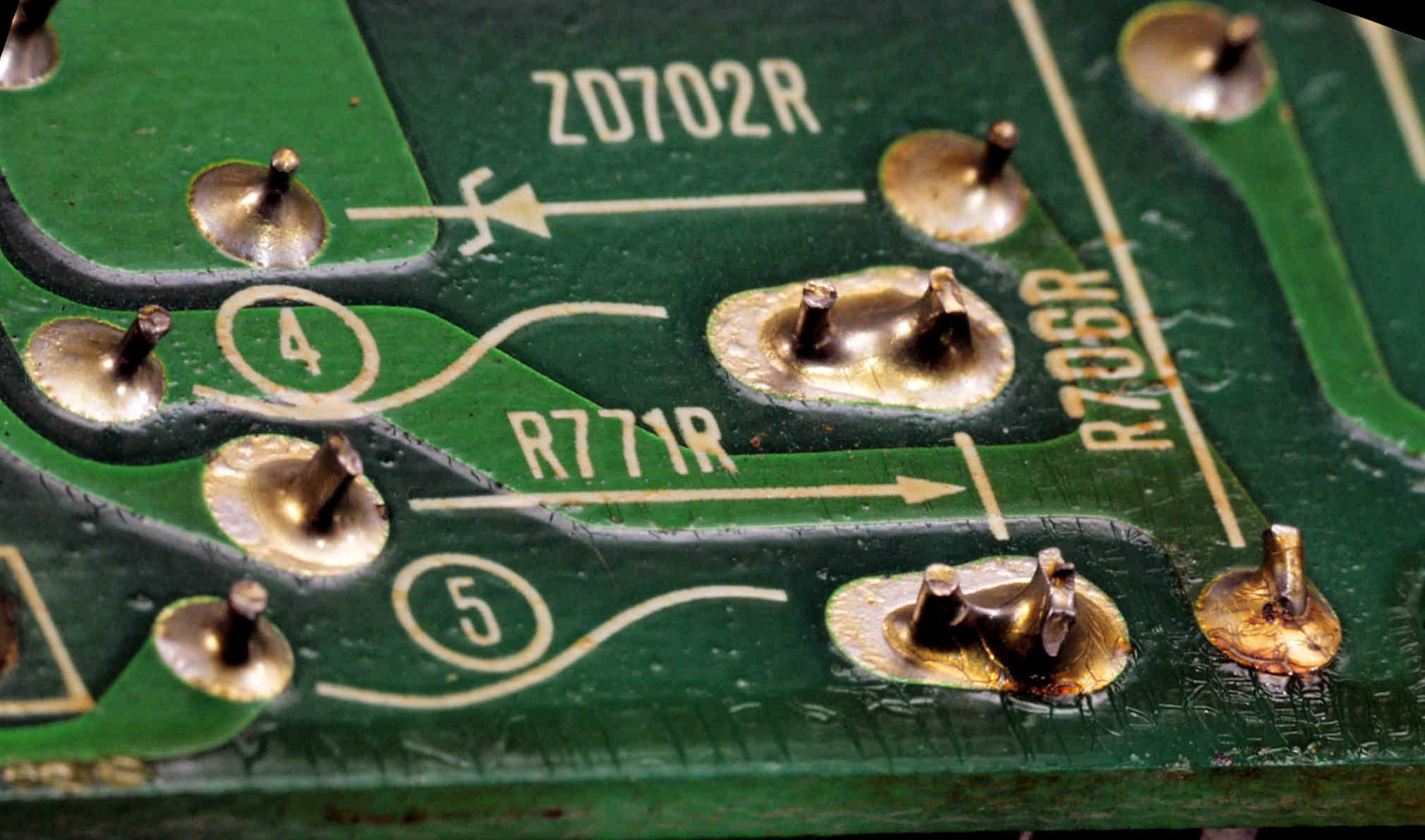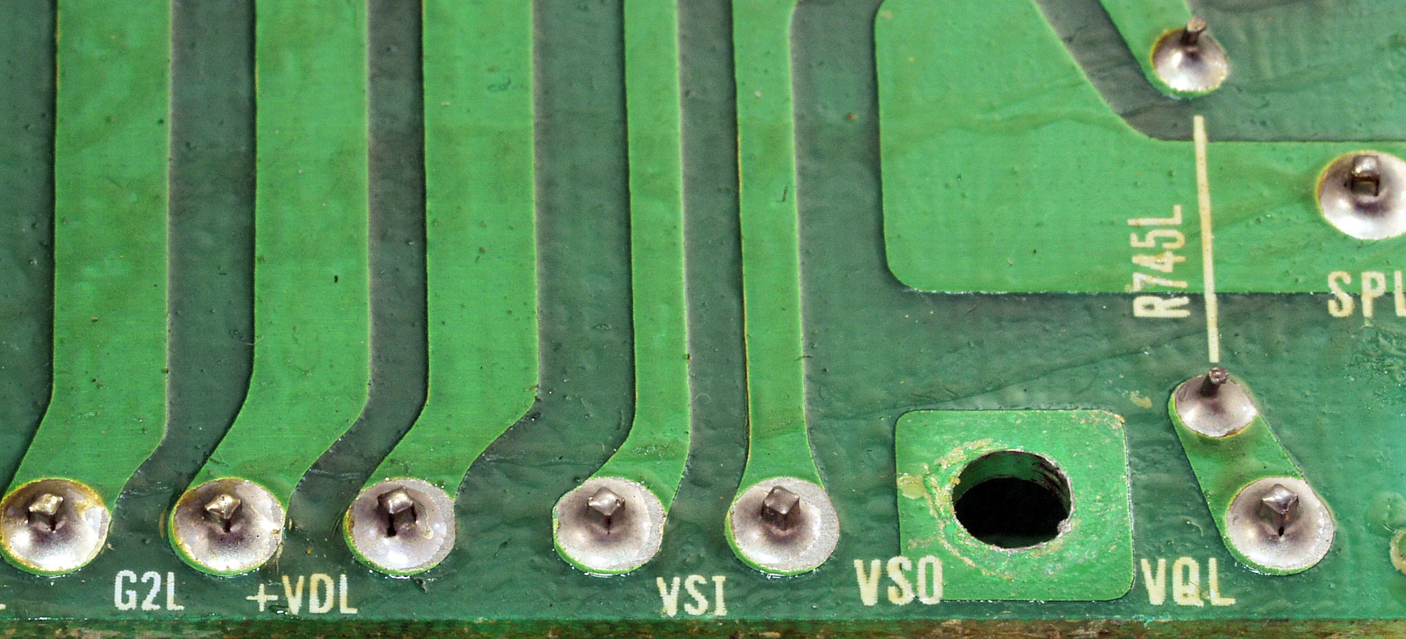 C131. 修理中 R側ドライブ基板裏、不使用電極ですが、穴あきは半田不良では最悪。