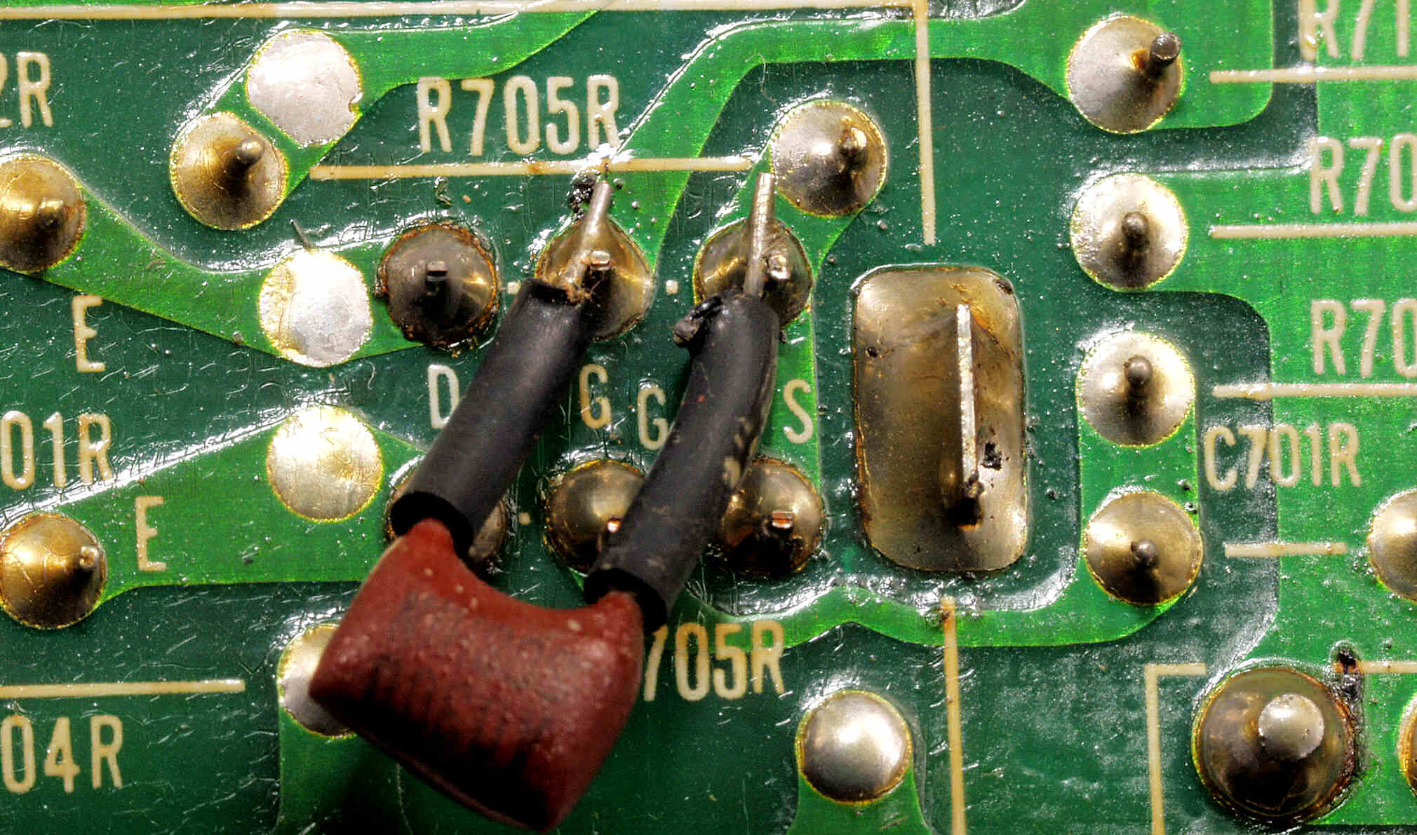 CA6. 修理後 R側ドライブ基板−電源基板へのラッピング線に半田を浸み込ませる