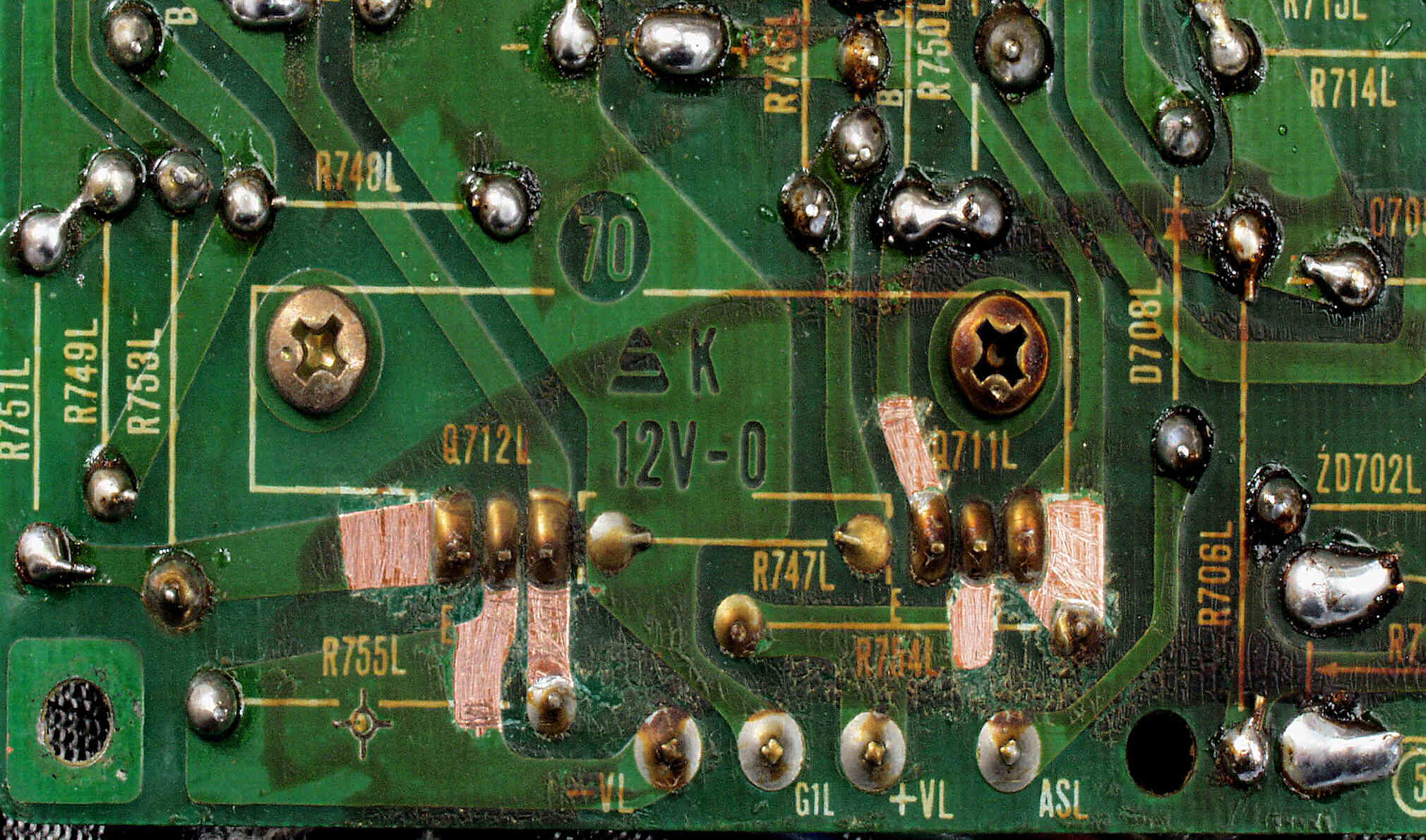 | C2C1. 修理中 L側ドライブ基板裏、半田糊代増強 |