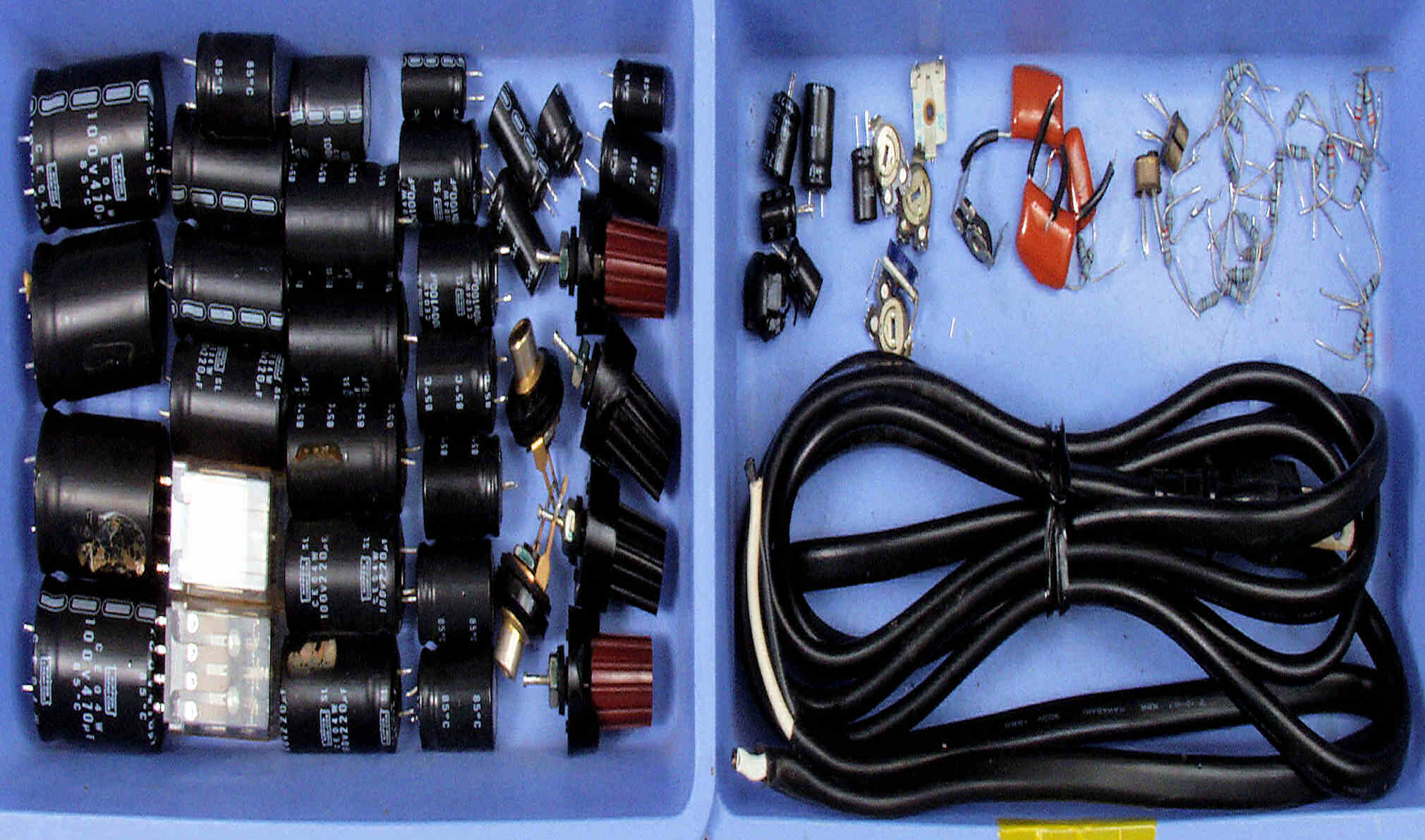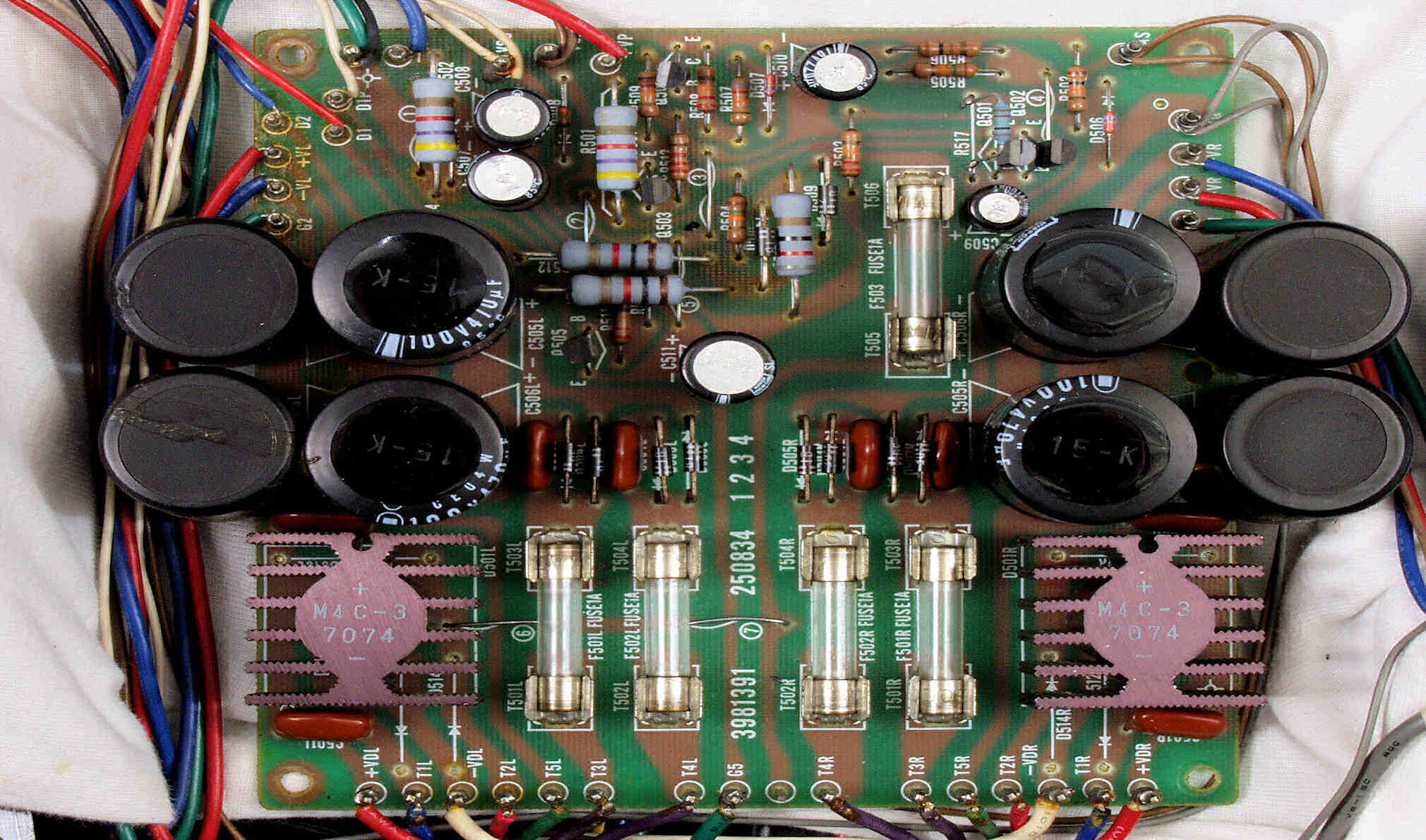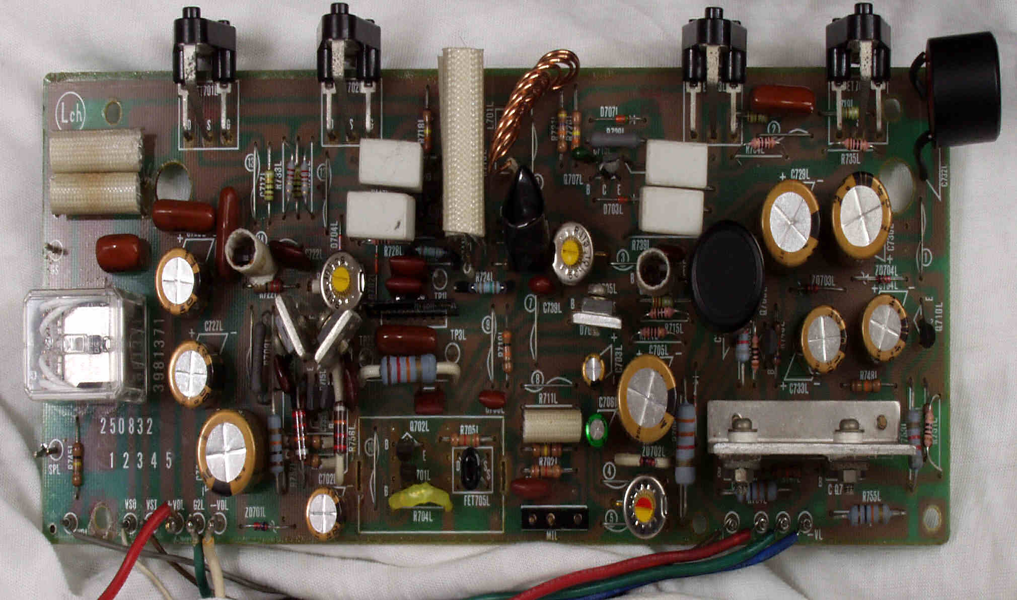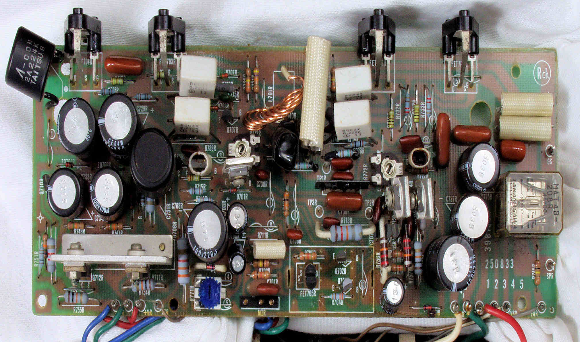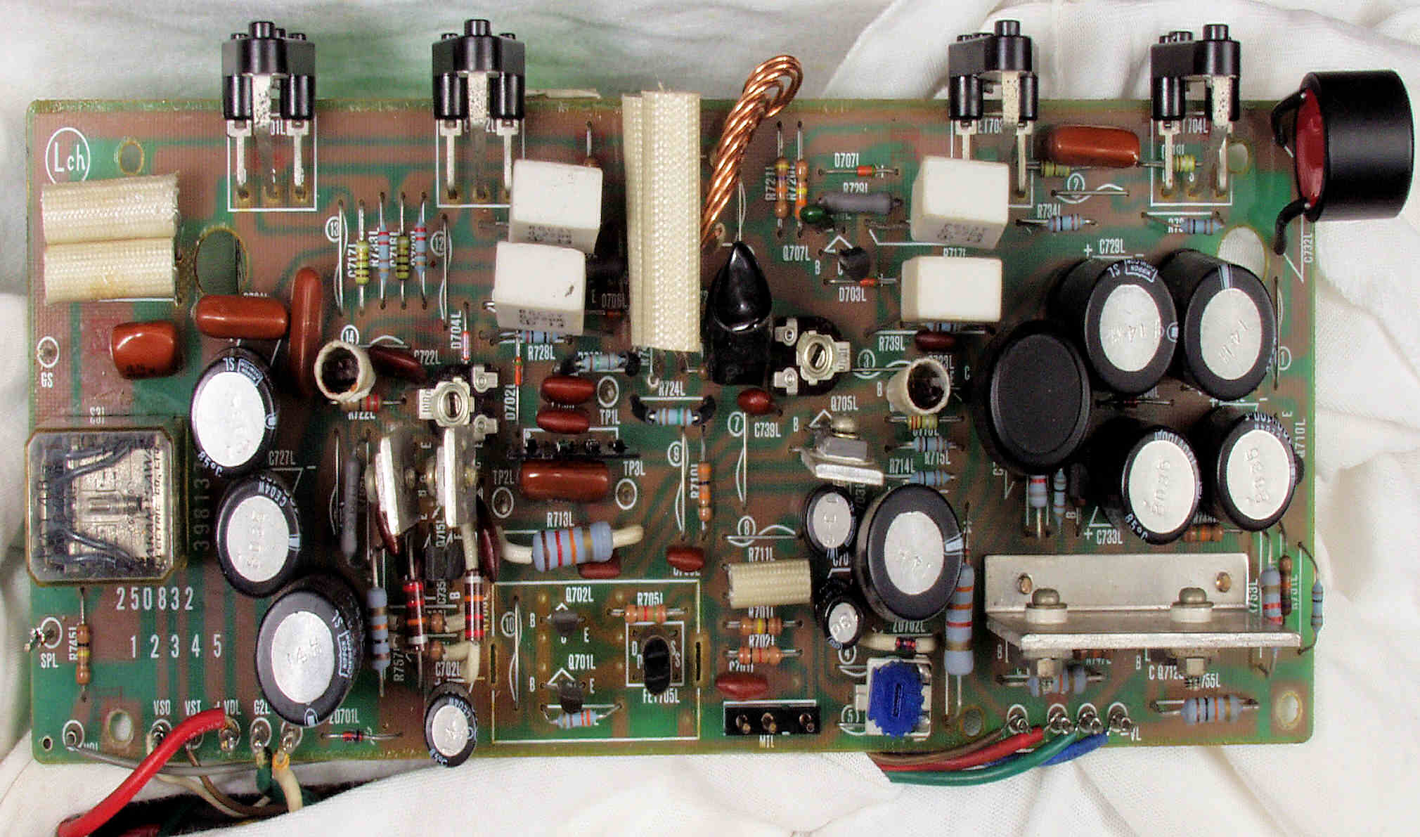 | C2B. 修理後 L側ドライブ基板 初段FET(電界効果トランジスター)、バランス/バイアス調整用半固定VR3個、SP接続リレー交換 フューズ入り抵抗全部、電解コンデンサー11個交換 |
