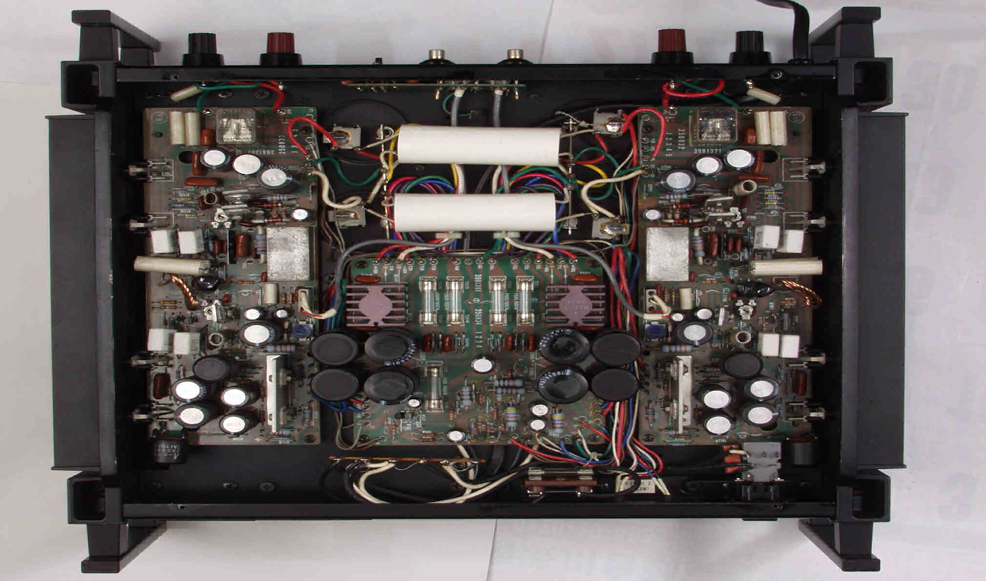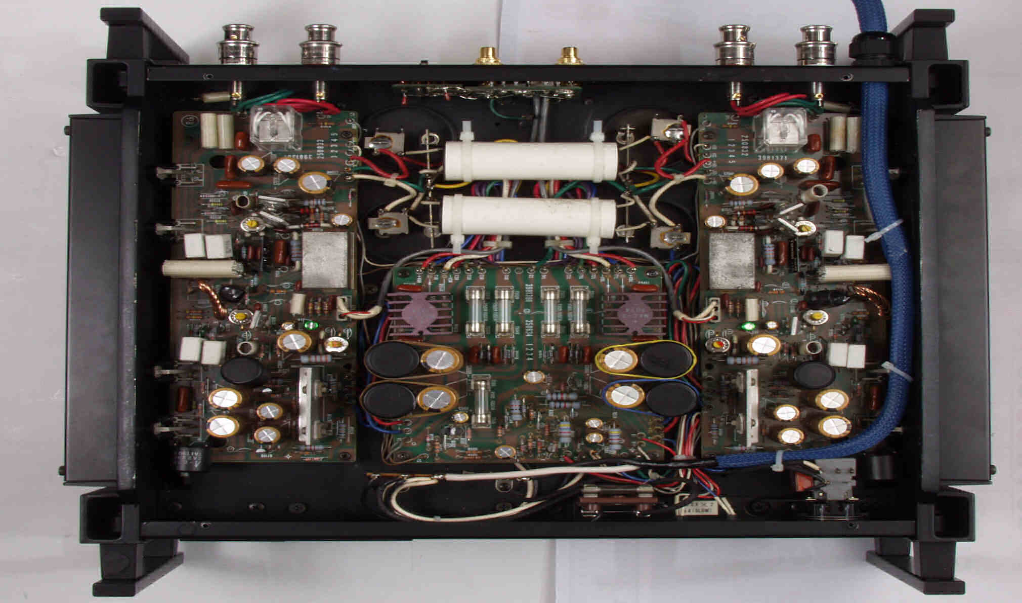 | 注意 このAMPはアースラインが浮いています。 AMPのシャーシにSPの線(アース側)やプリAMPのアースもも接続してはいけません。 RL−SPのアース線も接続(共通)してもいけません、+−の撚りのあるのも使用出来ません。 又、DC(directconnection)入力が可能ですが、絶対に使用しないこと=ここ参照 |